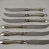 A set of six, late 19th Century English Sterling Silver handled fruit knives. The pointed blades have a serrate edge. Weighty and nicely balanced.