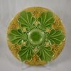 Six stylized shell shaped wells are glazed in a bright olive green. The oyster wells surround a raised center condiment well for sauce or lemons. The wells are arranged on a paisley-like molded ground, glazed in a deep yellow ochre.