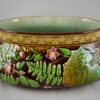 A French majolica Jardinière in the Aesthetic taste, with a yellow ochre Greek key border and a chocolate brown ground. The raised molded pattern shows overlapping bright green ferns, sprays of five petal pink flowers and large leaves in variegated olive green. The strong glazing on the outside contrasts beautifully with a pale turquoise ground to the interior.