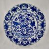 An 18th-Century Dutch Delft, tin-glazed earthenware deep charger, inspired by Chinese export porcelain and hand painted in a heavy cobalt blue Chinoiserie – style overall floral pattern. A stylized border of an alternating floral like pattern is edged with a white rim. The verso is glazed in a light blue with a wide rear rim.