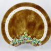 A rarer English majolica crescent shaped plate from Thomas C. Brown-Westhead, Moore & Co., Cauldron Place, Stoke-upon-Trent, Staffordshire, England, circa 1865. A rustic pattern showing a ground modeled on a staved barrel, a branch of ivy leaves are centered at the bottom. The verso is glazed in a bright opaque turquoise.