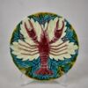 An earthenware, Austrian majolica lobster or crawfish plate, by Schutz Blansko, circa 1900. A bold, aesthetic mold showing a red lobster on a bed of cream and blue-green colored leaves. The notched rim is glazed in a rich yellow ochre. Incredible color.