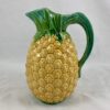 From a set of three pitchers, graduated in size and offered separately, this is the smallest jug. Realistically molded, the body is formed as the pineapple, glazed in a deep golden yellow. The neck, handle and spout are glazed in shades ranging from deep green to blue-green, and are molded as the spear shaped leaves of the fruit. The interior is fully glazed in a beautiful blue-green, particular to Minton. The same green is used on the base, which shows the makers mark, a diamond shaped English registry mark, and various mold numbers.