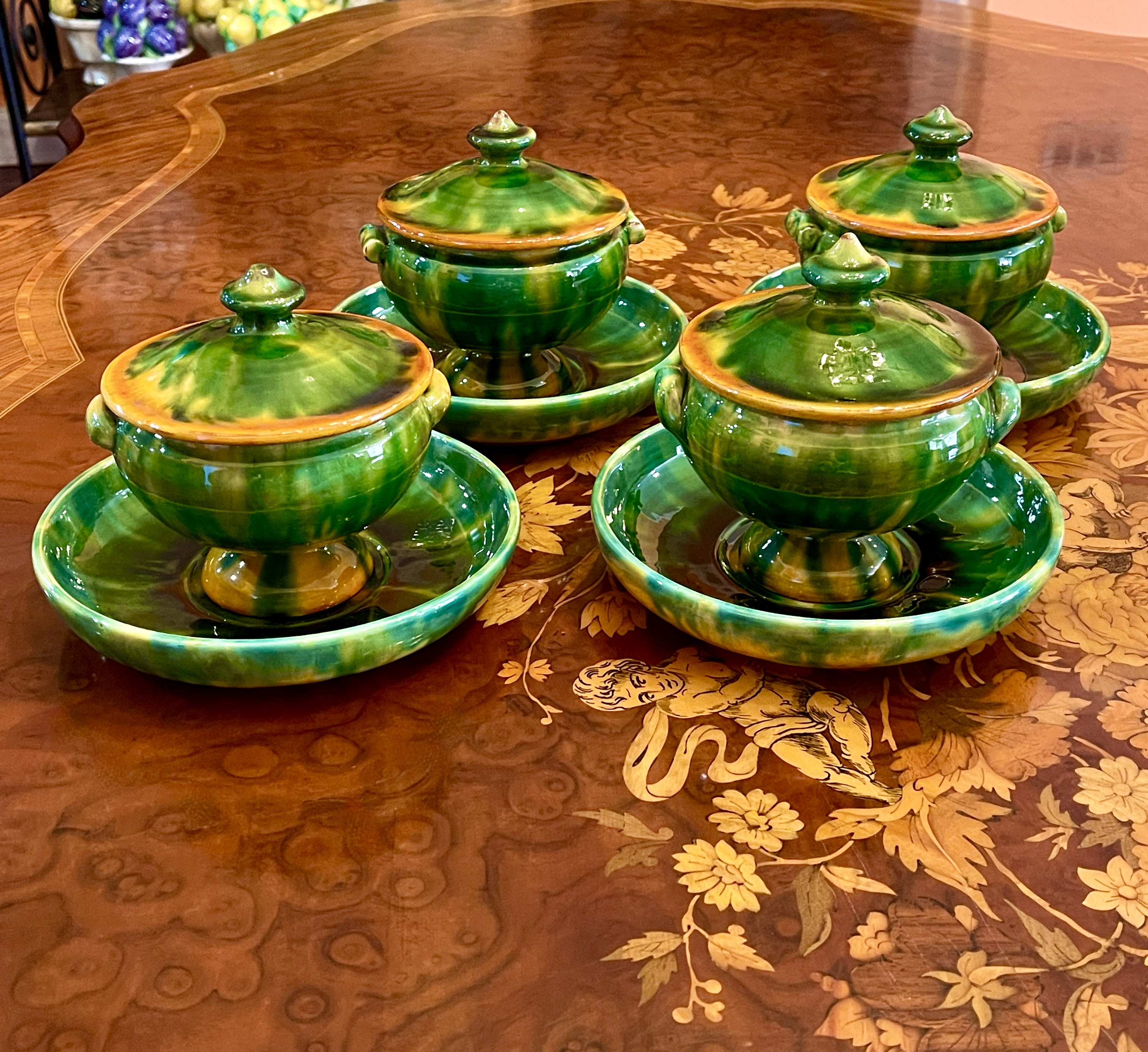 Glazed in the rich colors of Provençal France, – deep greens, yellow and ochre.
