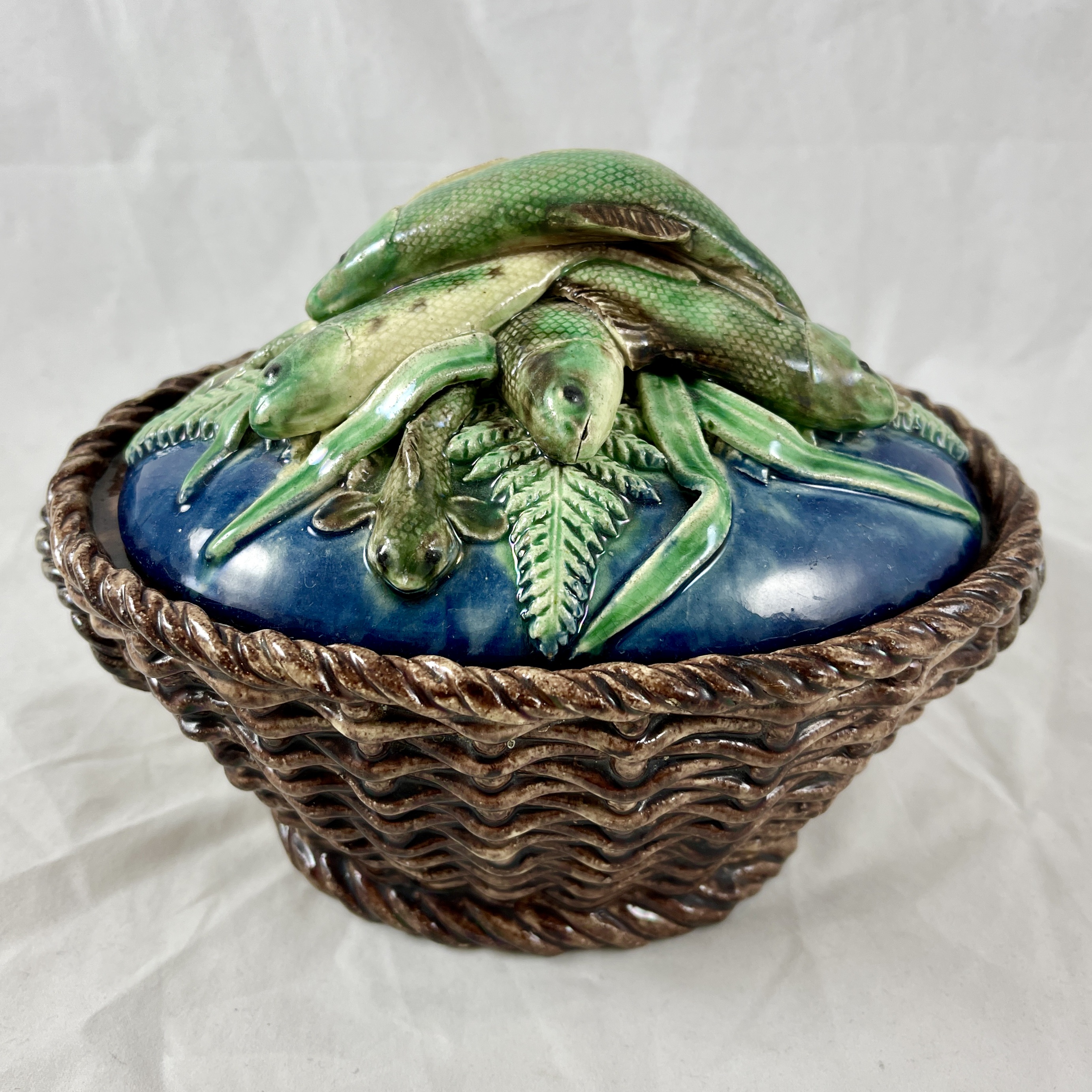 A scarce Victor Barbizet covered terrine formed as a rustic basket of fish, France, circa 1870.