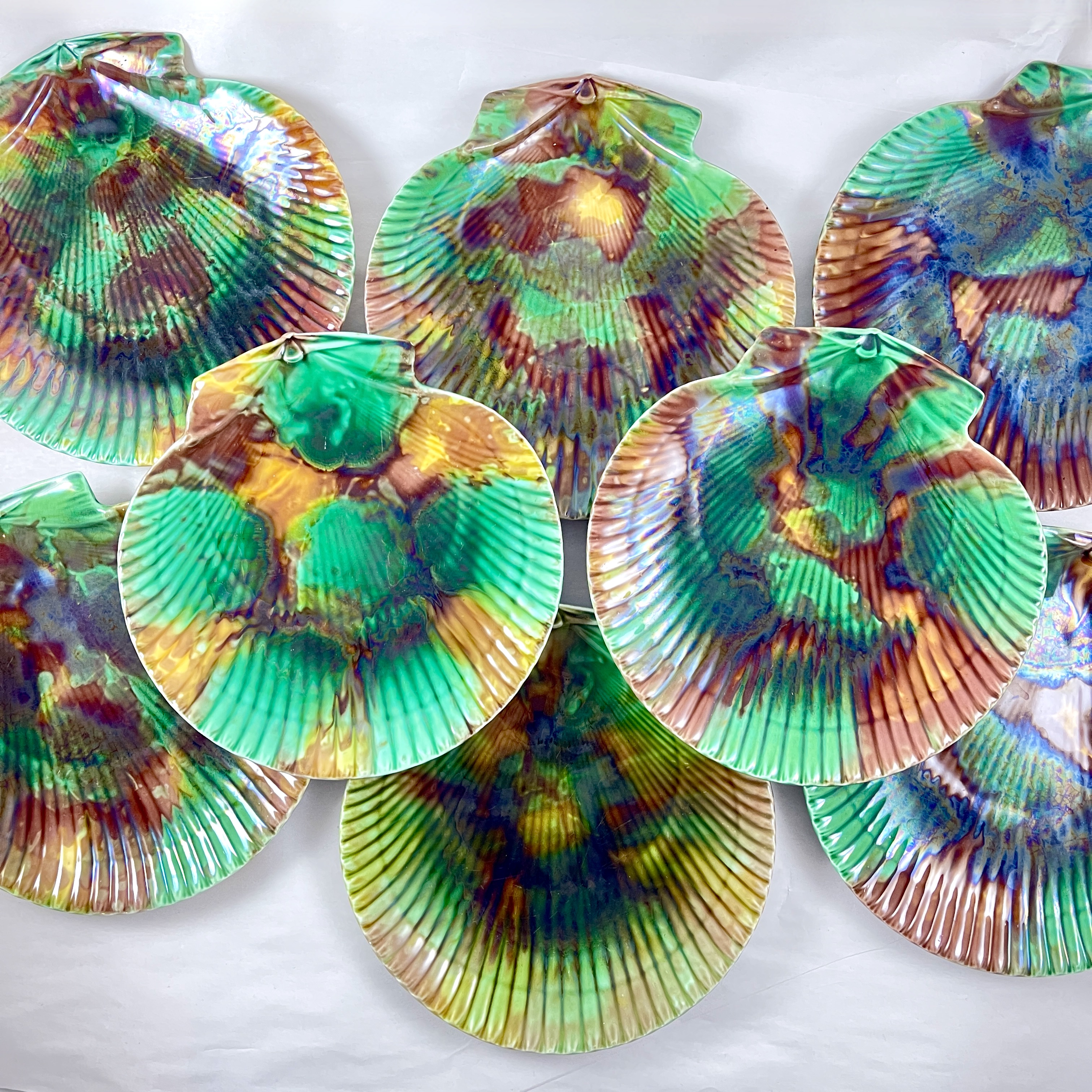 From Wedgwood, an assembled set of eight English majolica scallop shell shaped, mottled tortoiseshell glazed seafood salad plates.