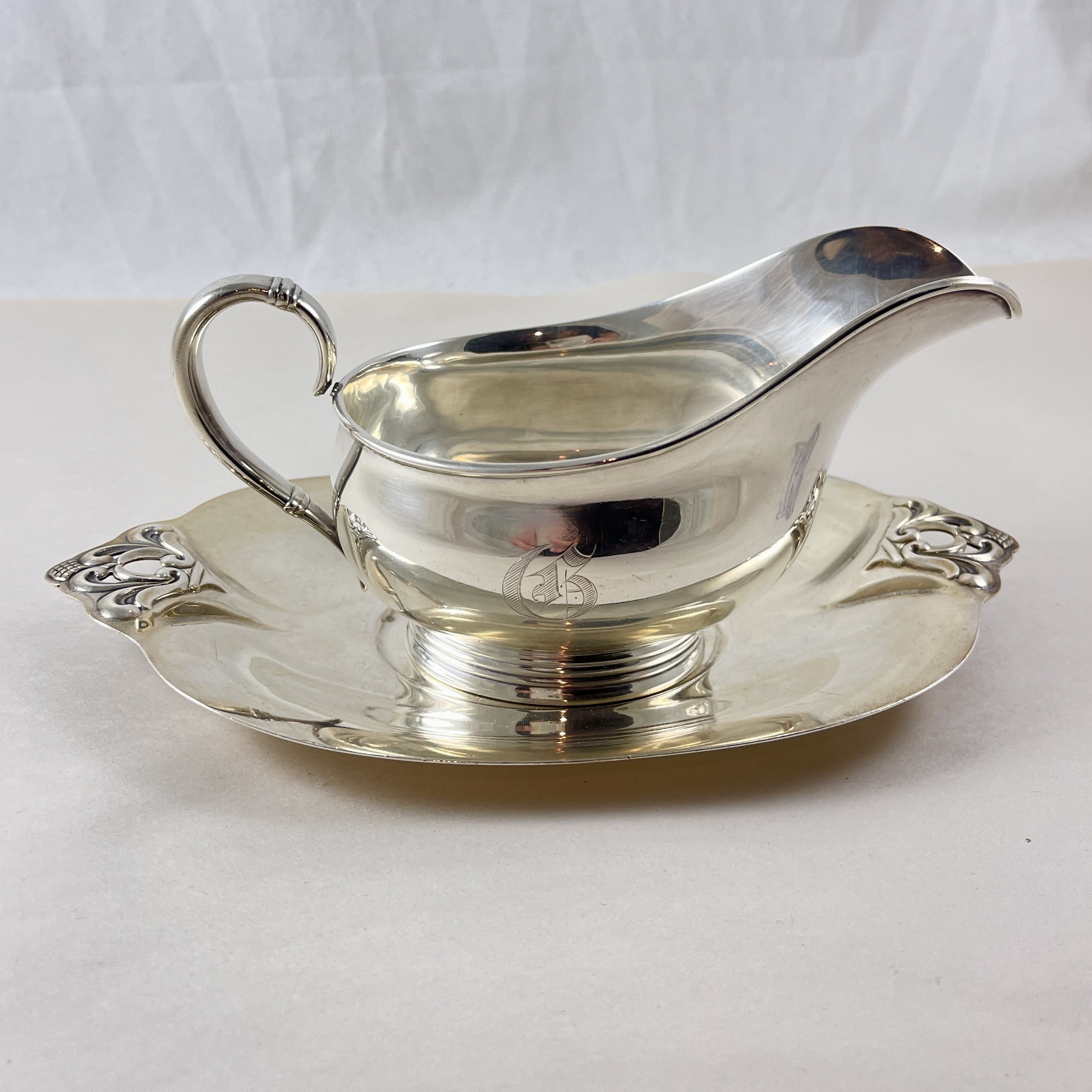 From a Philadelphia estate, a Royal Danish pattern sterling silver gravy boat on stand, made by International Silver in Meriden, Conn, date marked 1939.