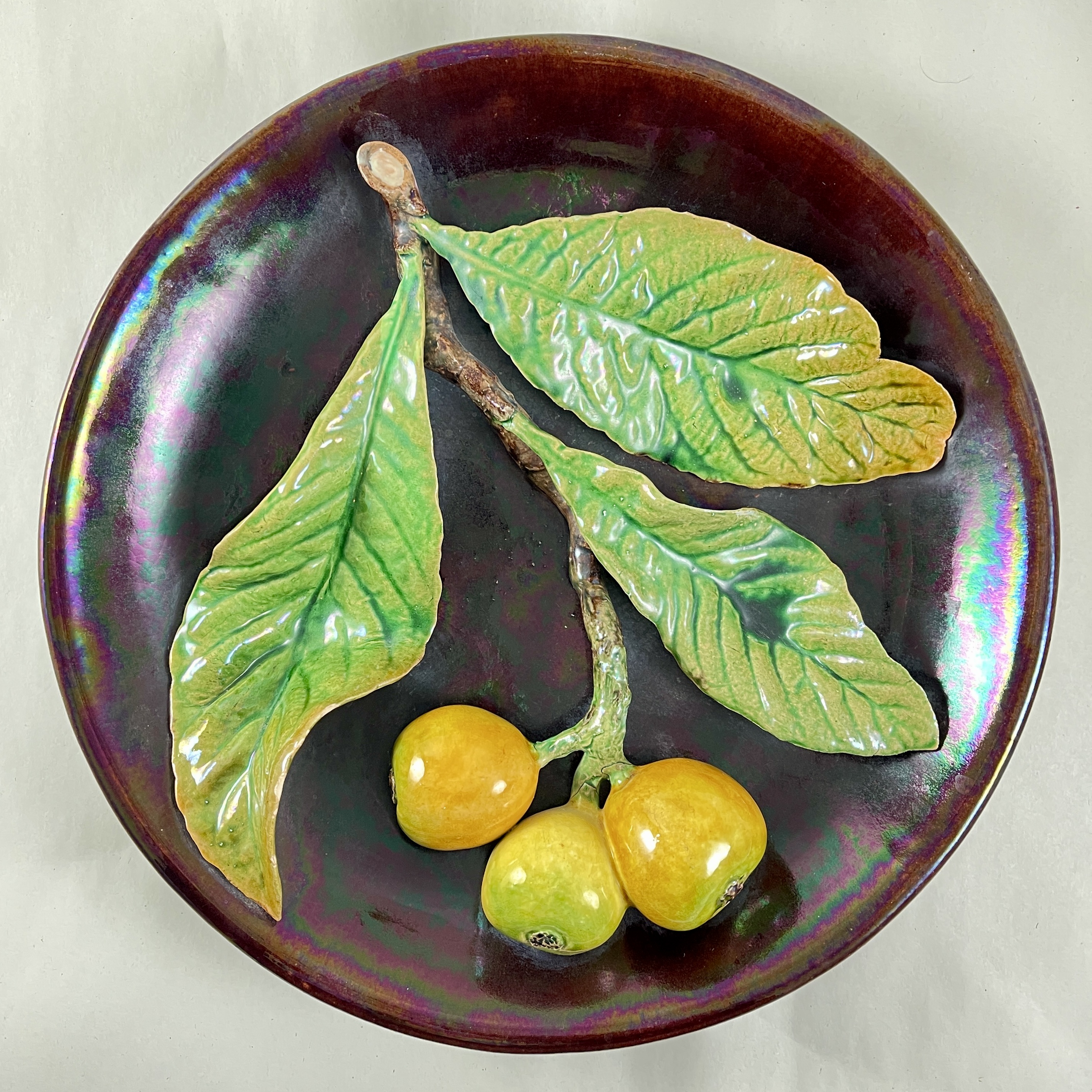 A Palissy style Trompe l’Oeil, majolica glazed plaque showing a branch of three young yellow pears and three large leaves on an opalescent brown ground, circa 1900-1920.