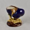 In the manner of Palissy, the globose Volute snail shell shaped cellar is glazed in a mottled blue and brown, and sits on a raised yellow ochre coral form pedestal with a brown mounded base. The interior is clear glazed, showing the color of the clay, the underside is glazed in a pale green and marked as shown.
