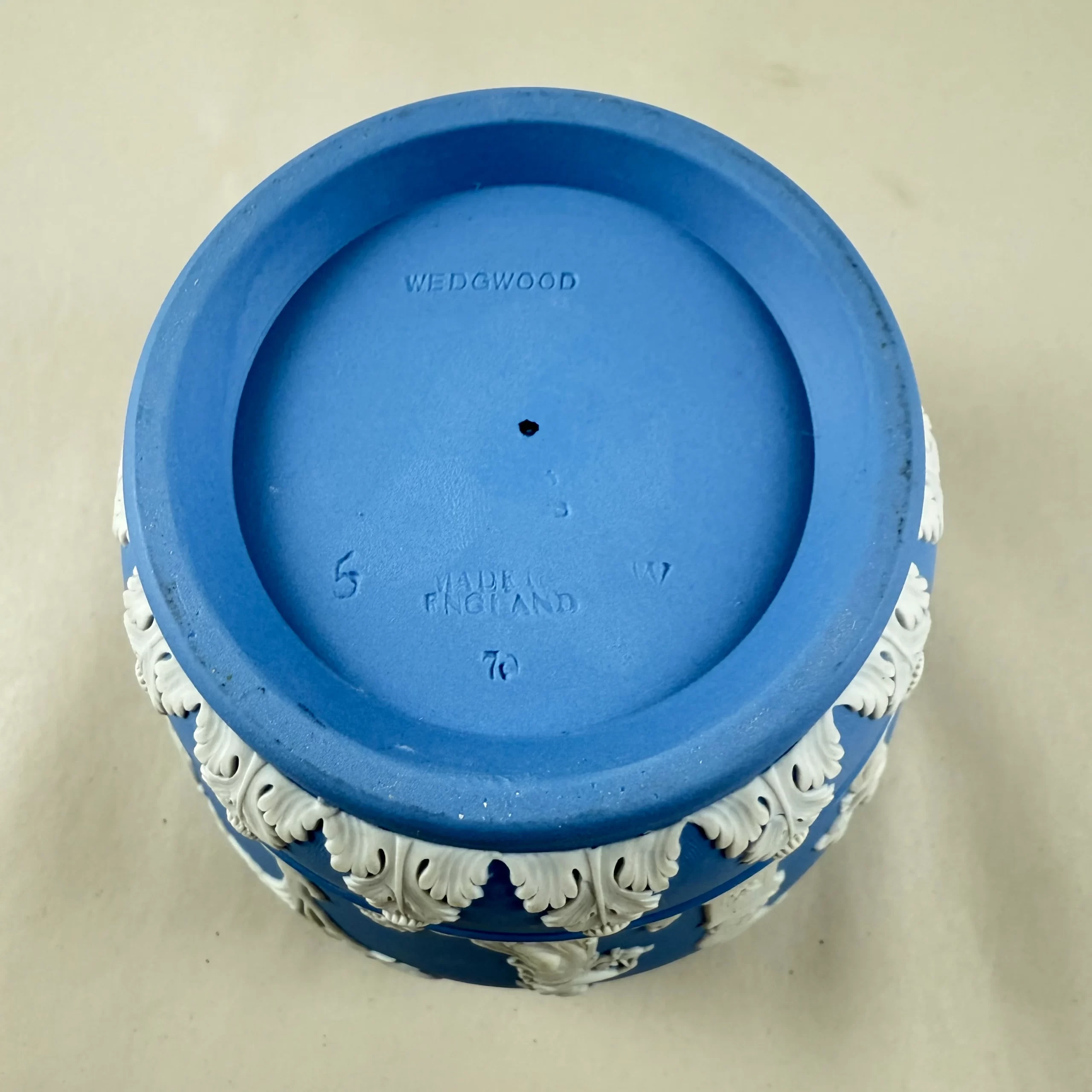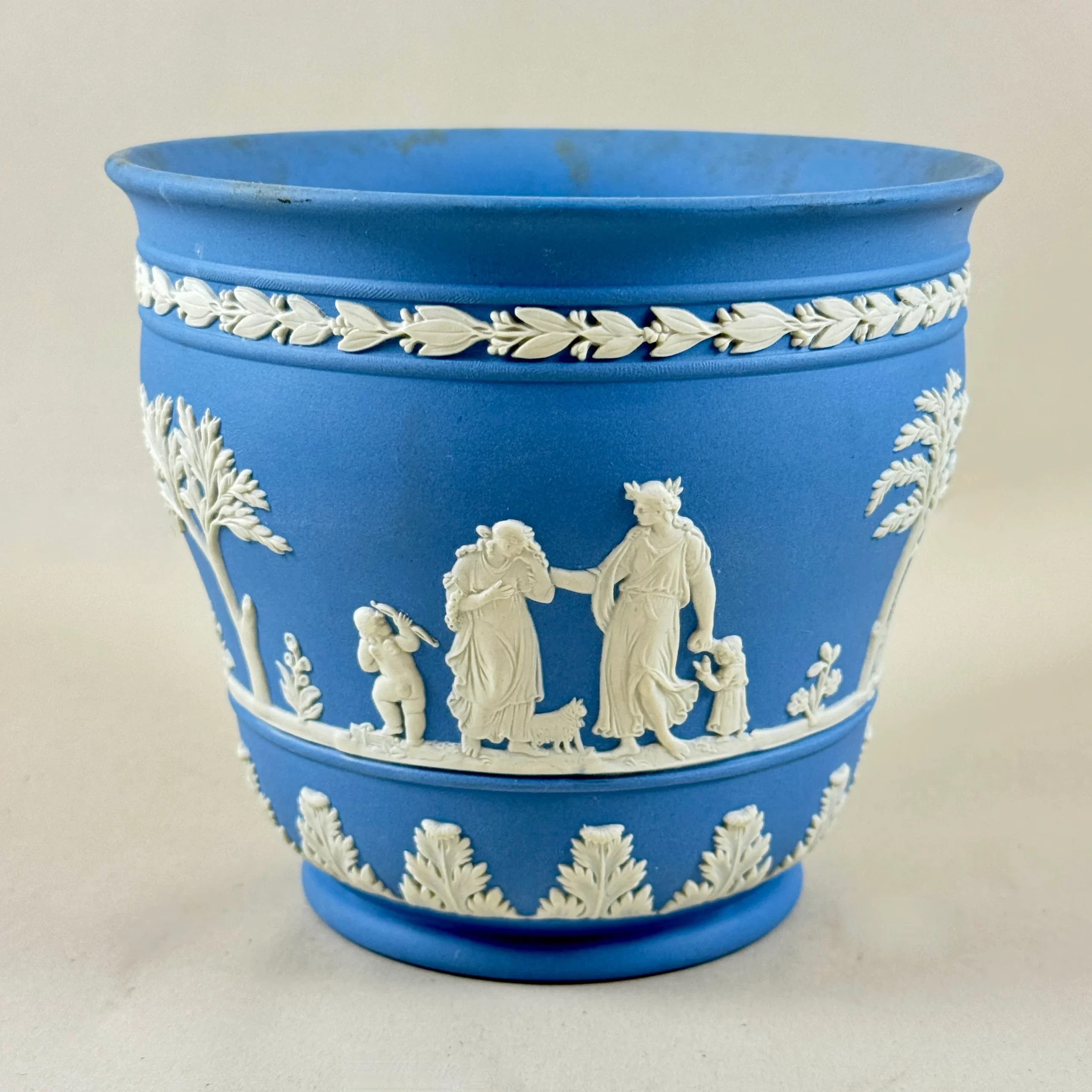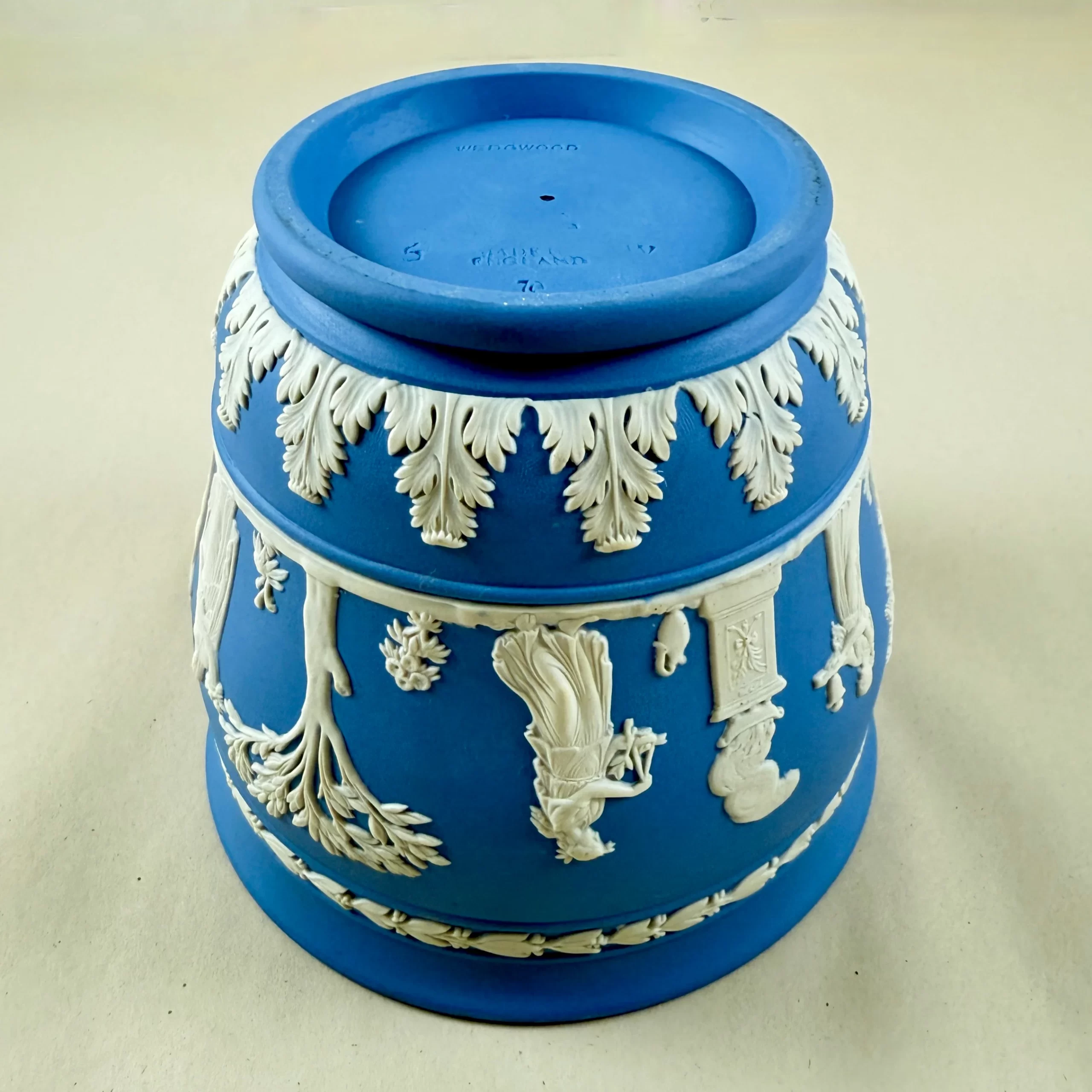 From Wedgwood, a light Blue Jasperware cache pot or jardiniere, date marked 1970.
