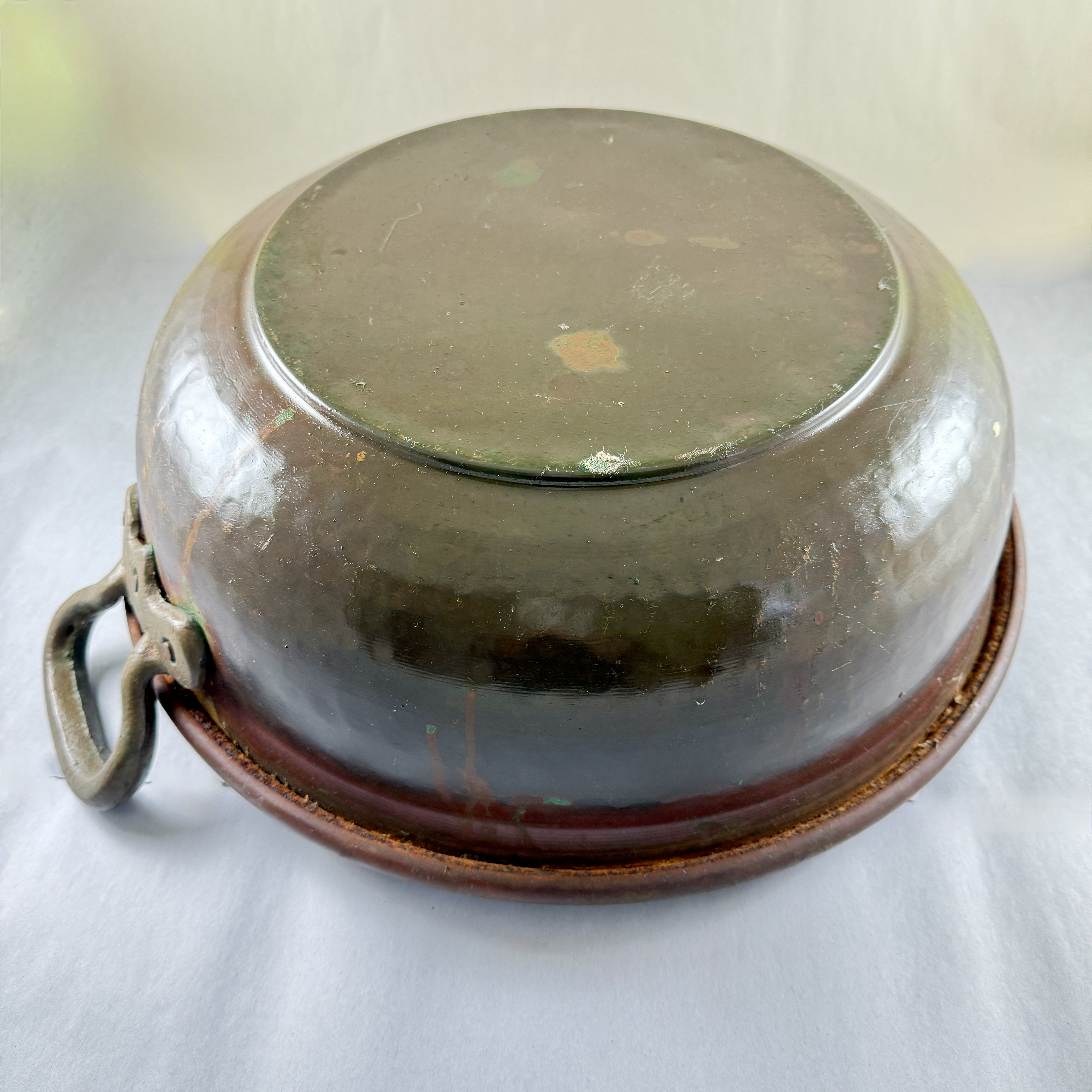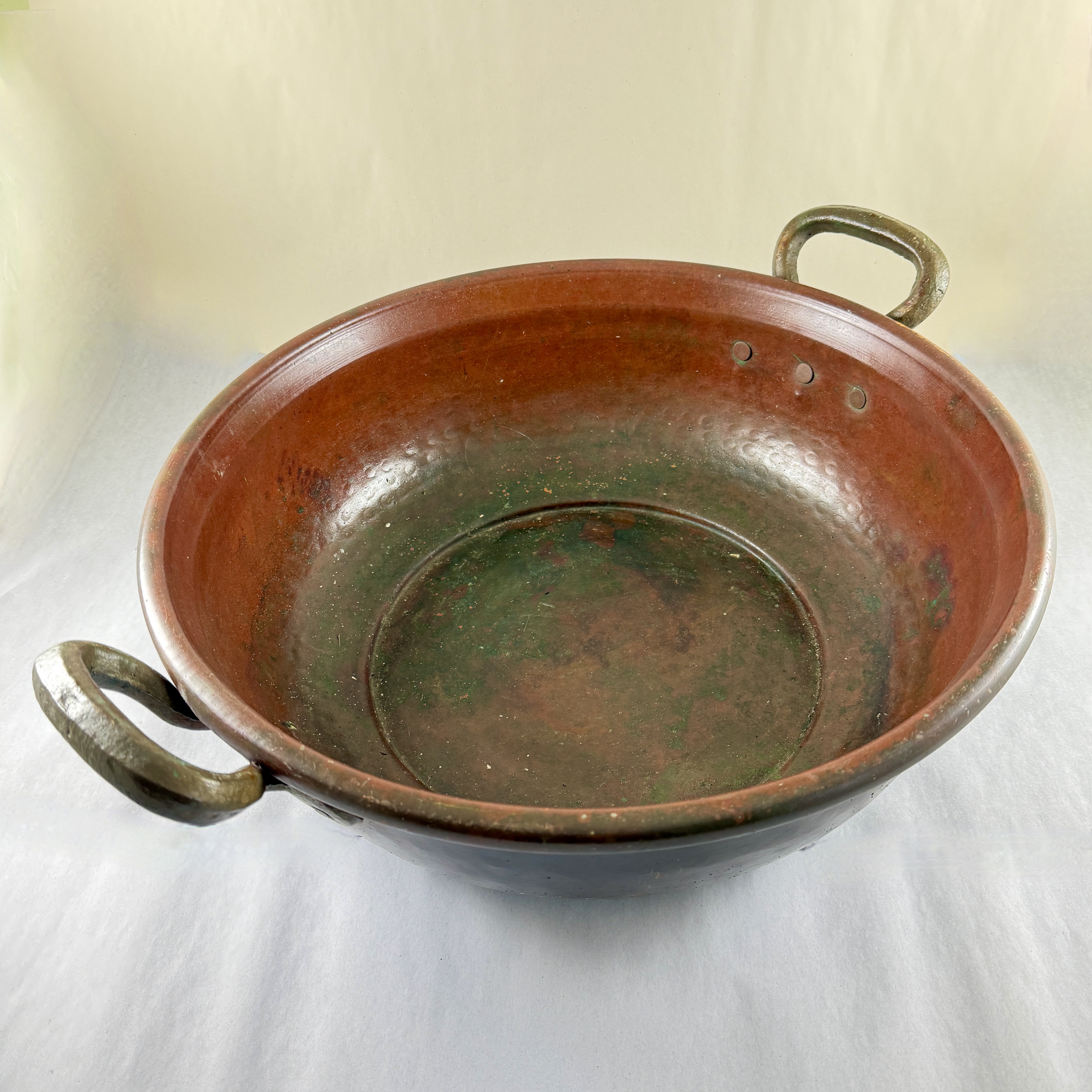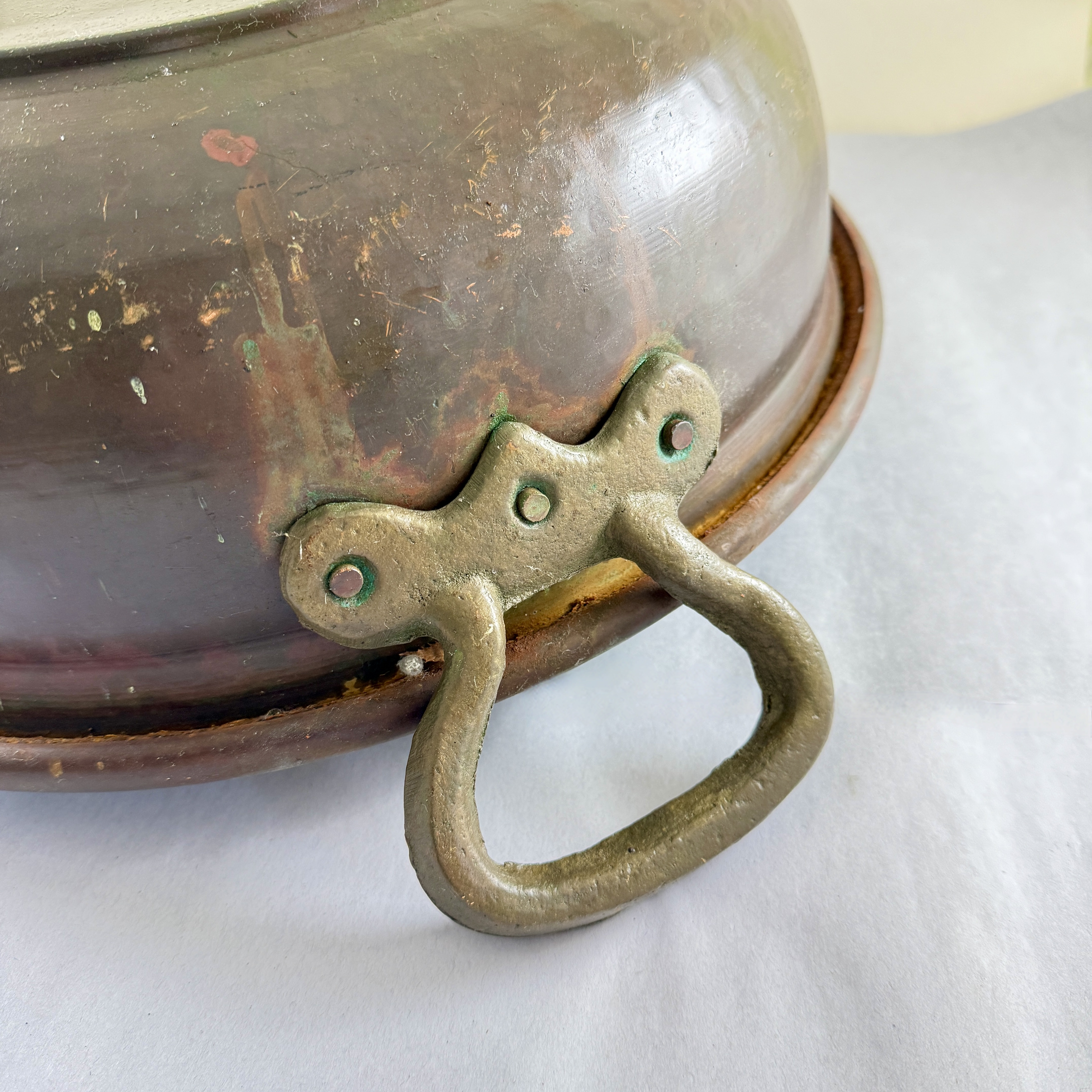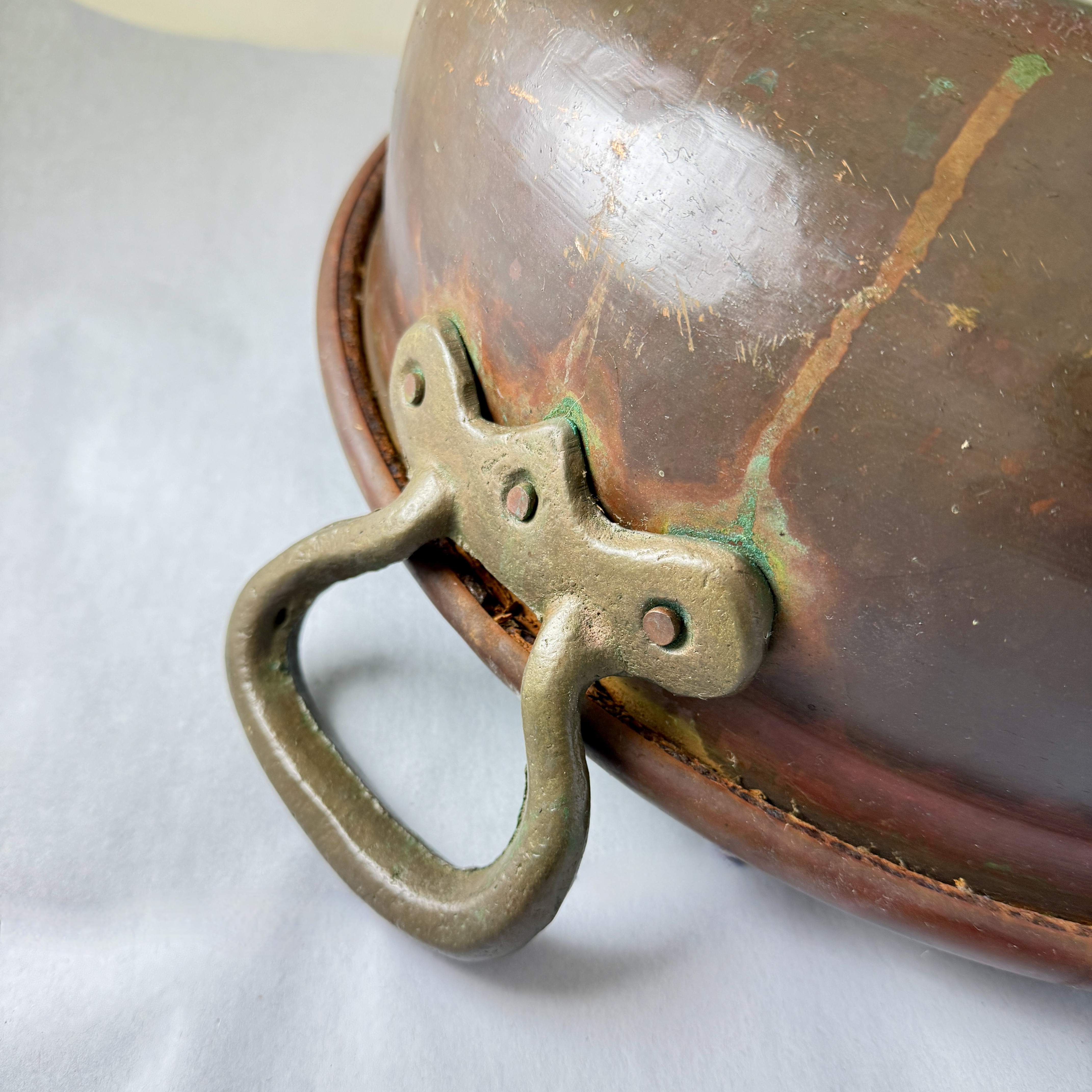 Riveted brass handles at either side showing verdigris where they are joined to the copper bowl.