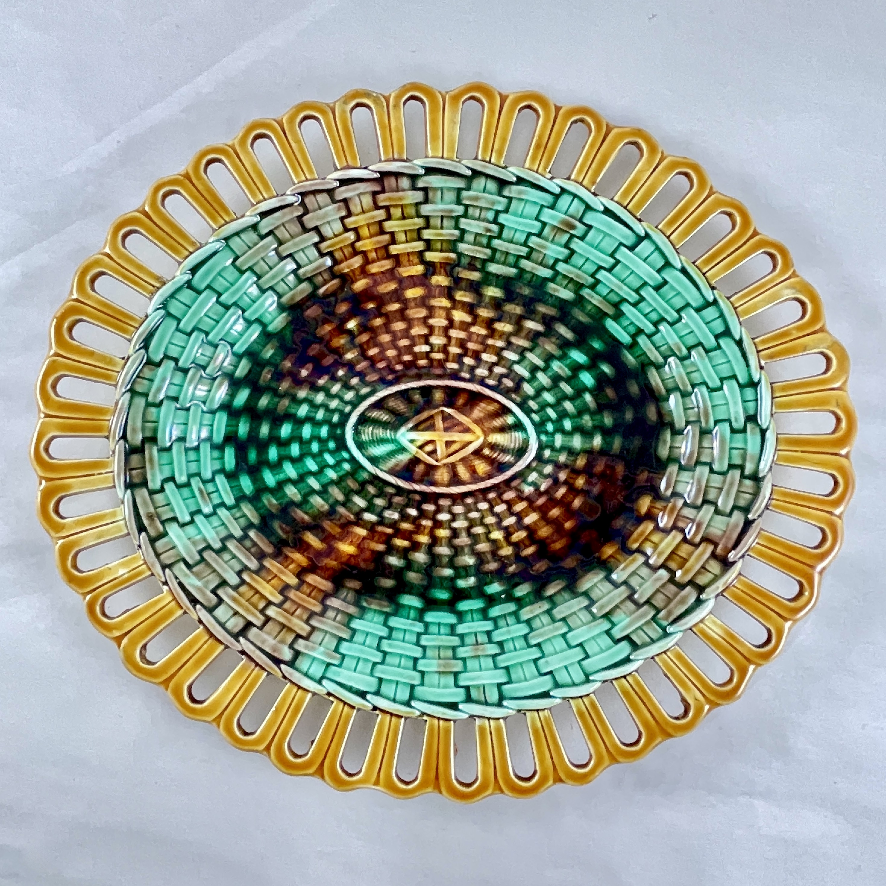 The server is edged with a delicate yellow ochre reticulated rim that imitates the ribbing of a basket. The rim meets the basketweave center glazed in the mottled tortoiseshell coloring of greens, brown, and ochre. The center of the server anchors the basketwork as it weaves its way concentrically towards the rim.