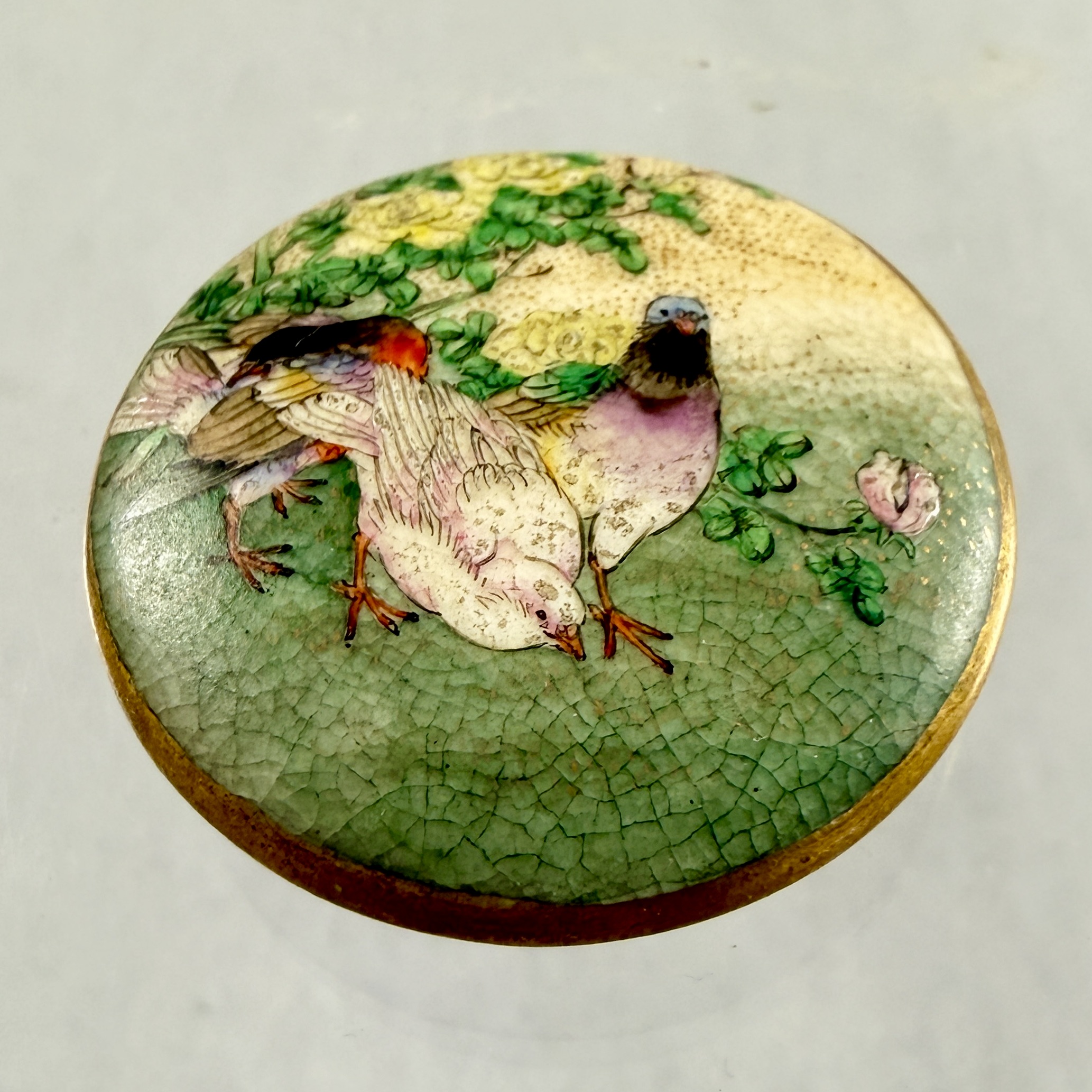 A Satsuma button showing a group of three pigeons in a rural landscape, dating to the late Japanese Edo period, circa 1853-1868.