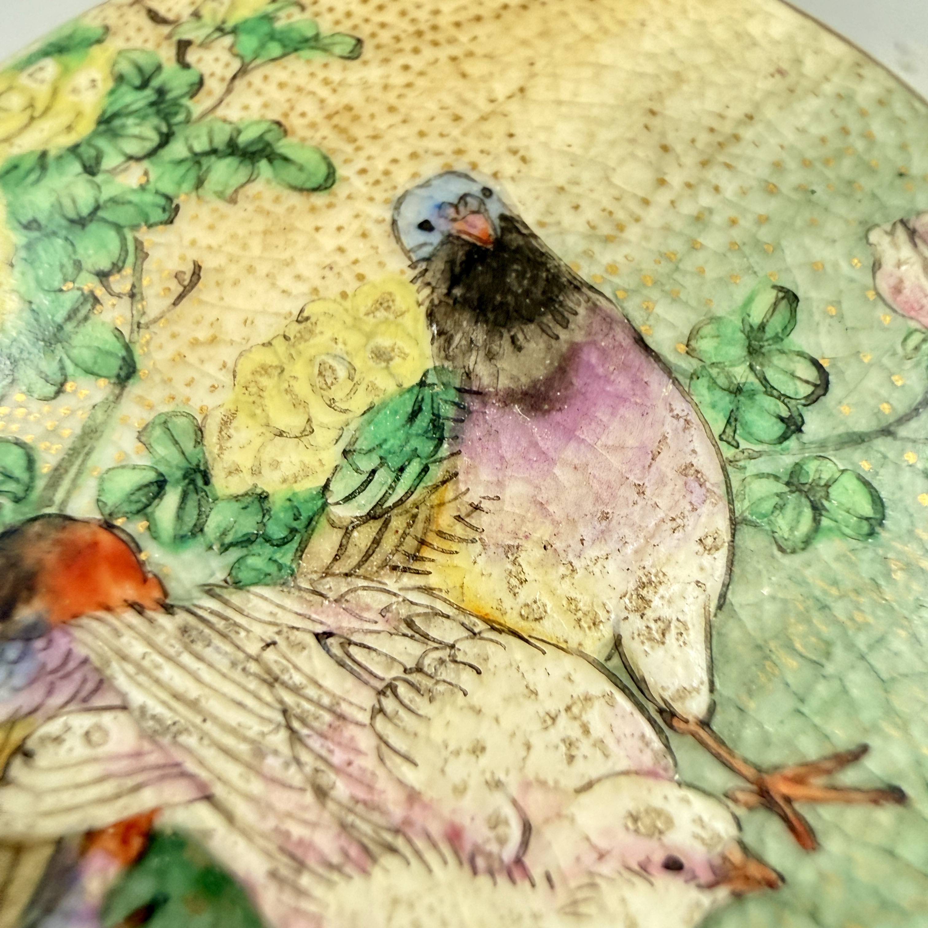 This button is a piece of jewelry-like art that would have been used to dress up a kimono obi. Satsuma buttons are desirable to Western collectors of Japonism.