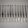 From Landers, Frary & Clark, Aetna Works, founded in New Britain, Connecticut, 1866, a set of twelve Mother-of-Pearl handled place or luncheon knives with floral sterling silver ferrules. Blades are plated and show the makers mark.