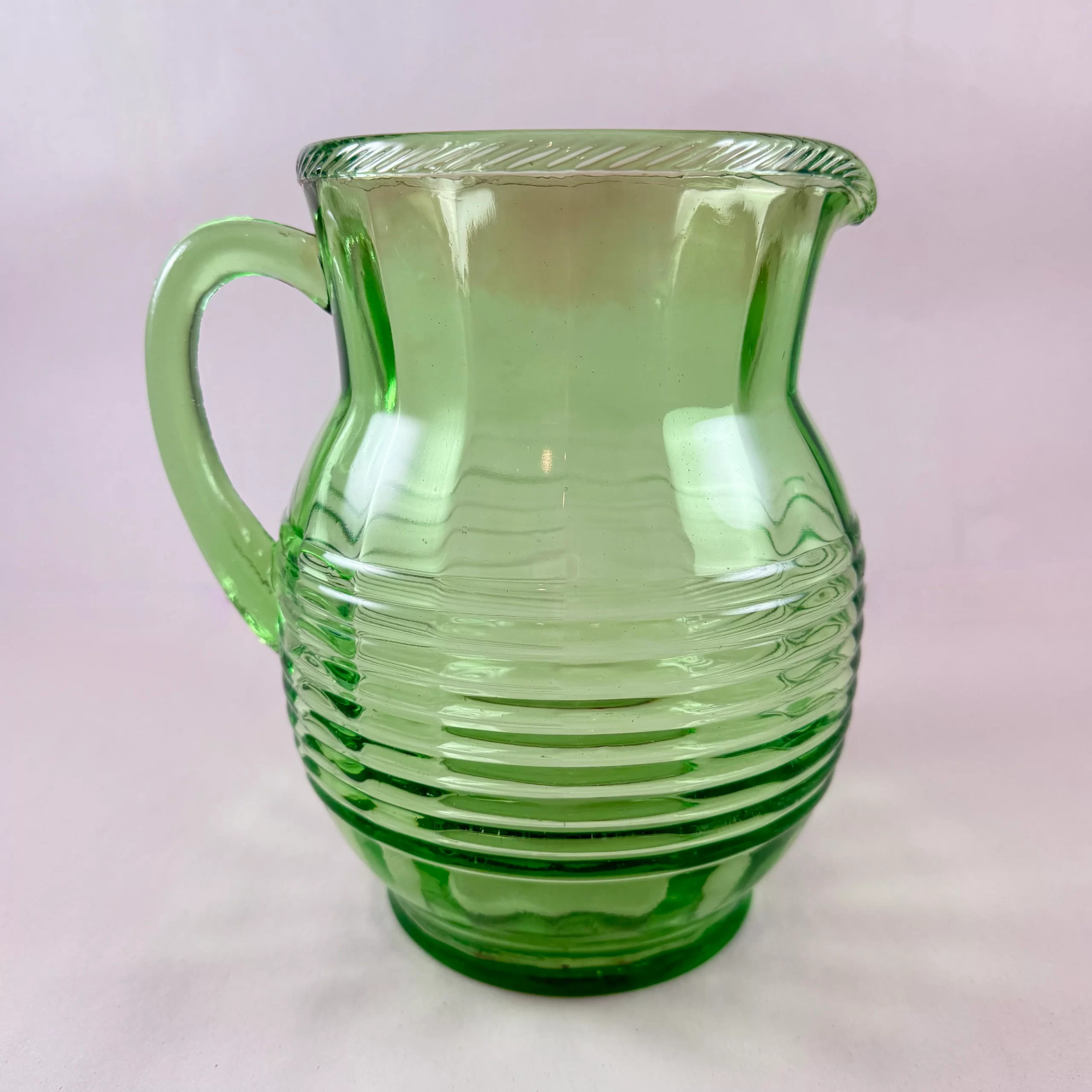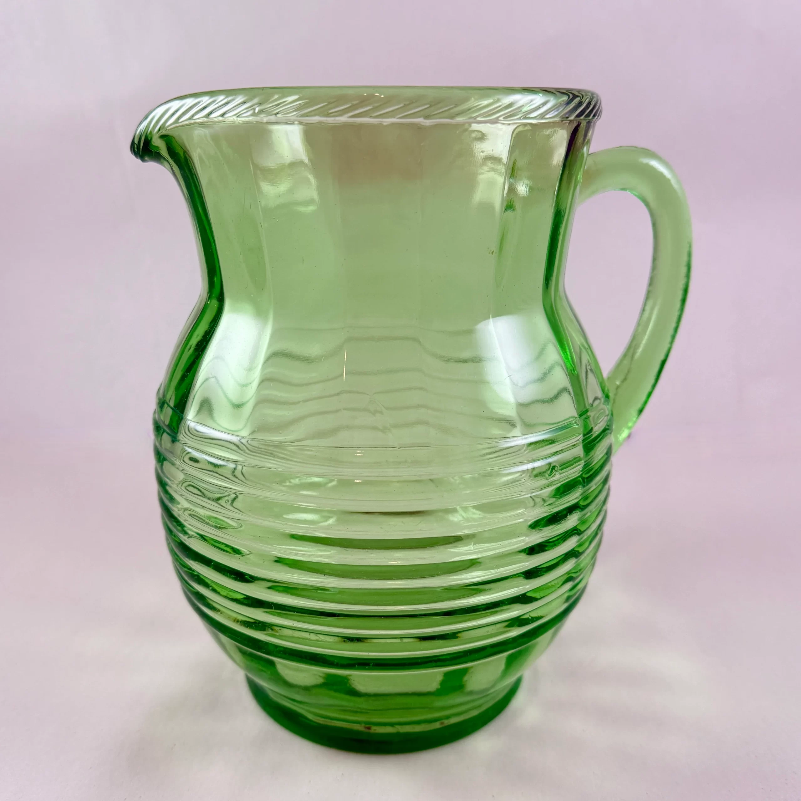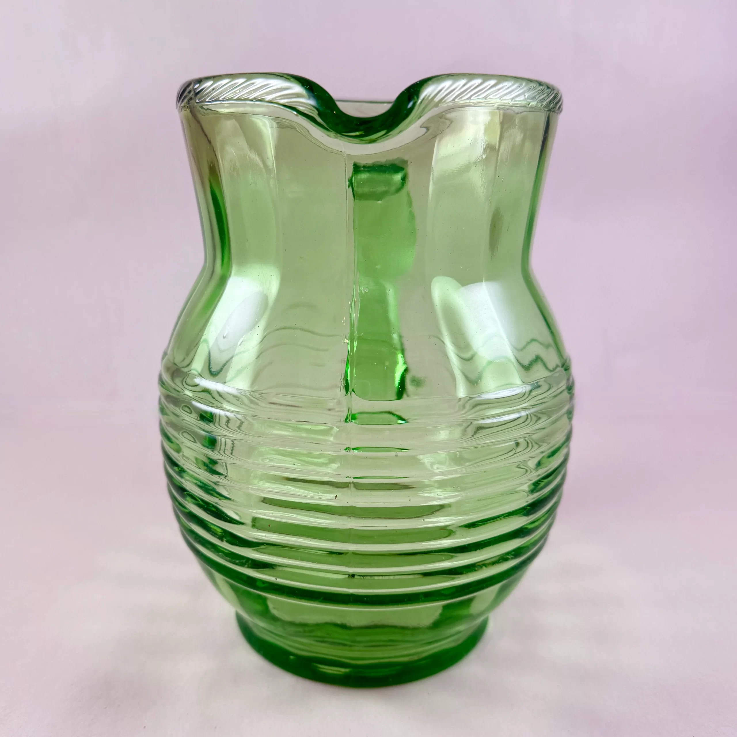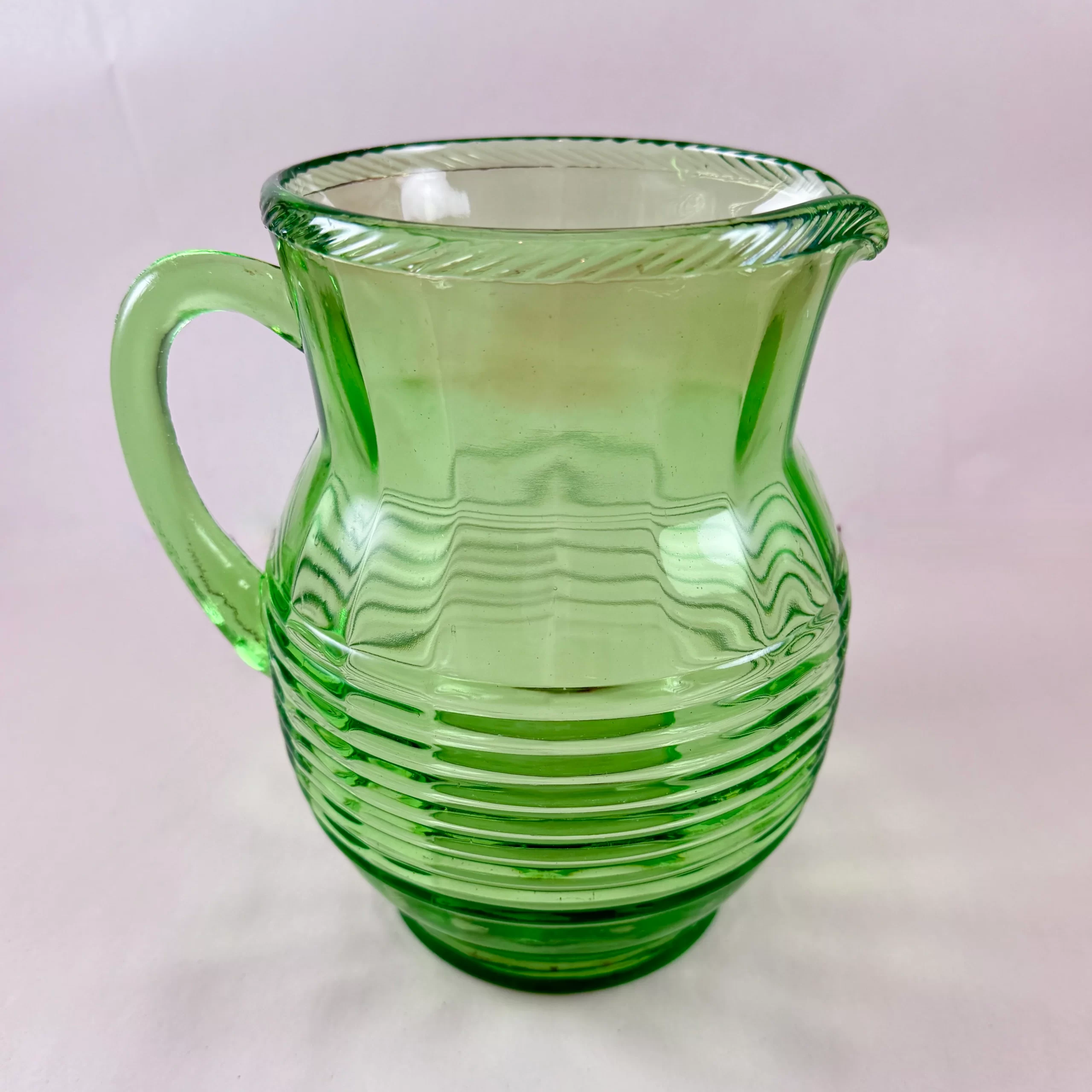 From Anchor Hocking, a green Uranium Glass pitcher from the Circle Line, circa 1930-1934.