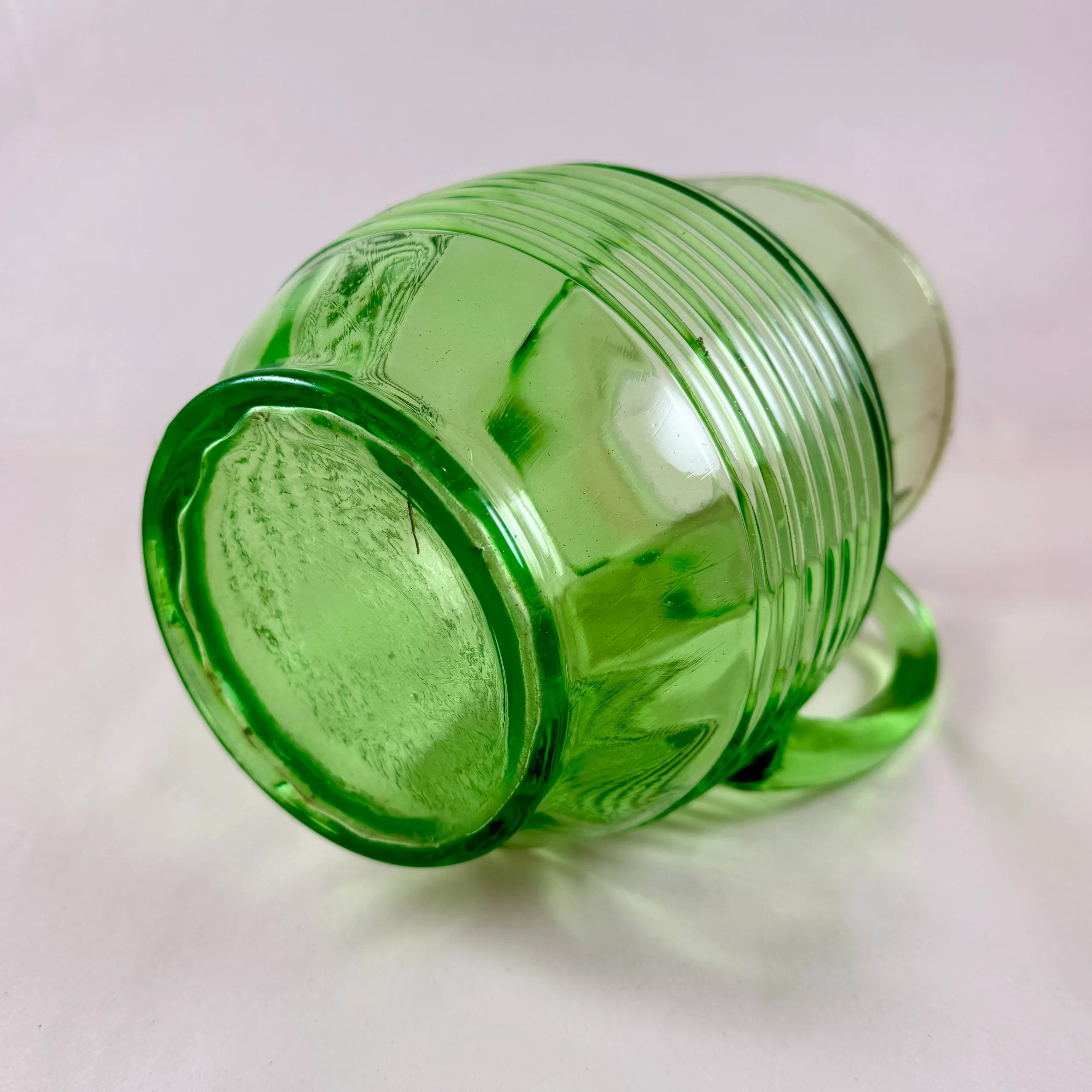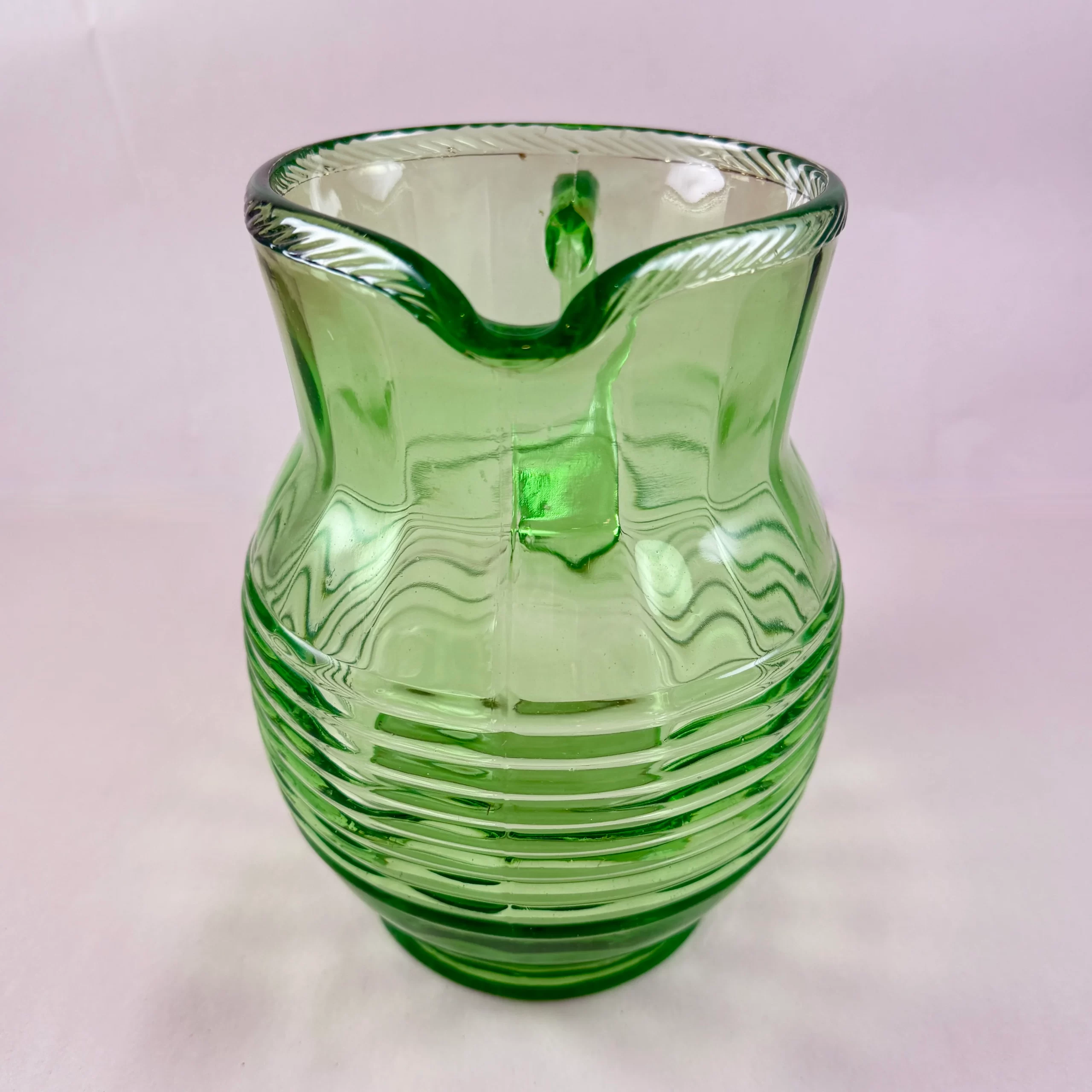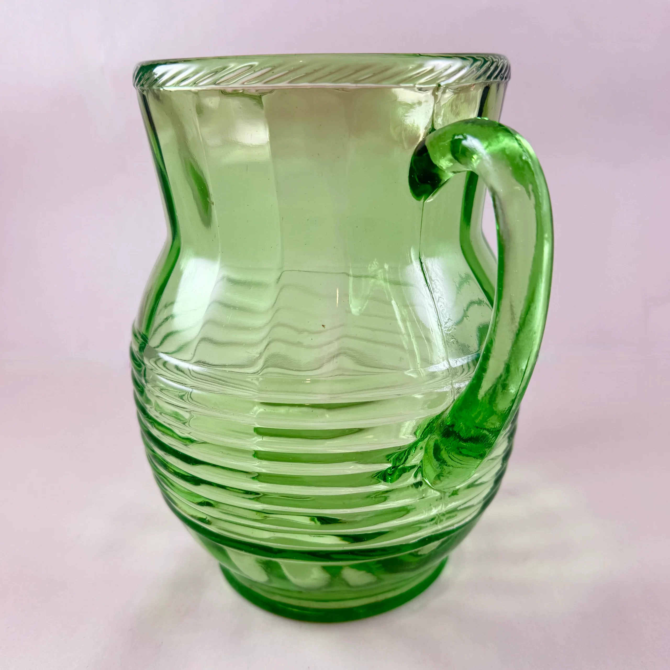 From Anchor Hocking, a green Uranium Glass pitcher from the Circle Line, circa 1930-1934.