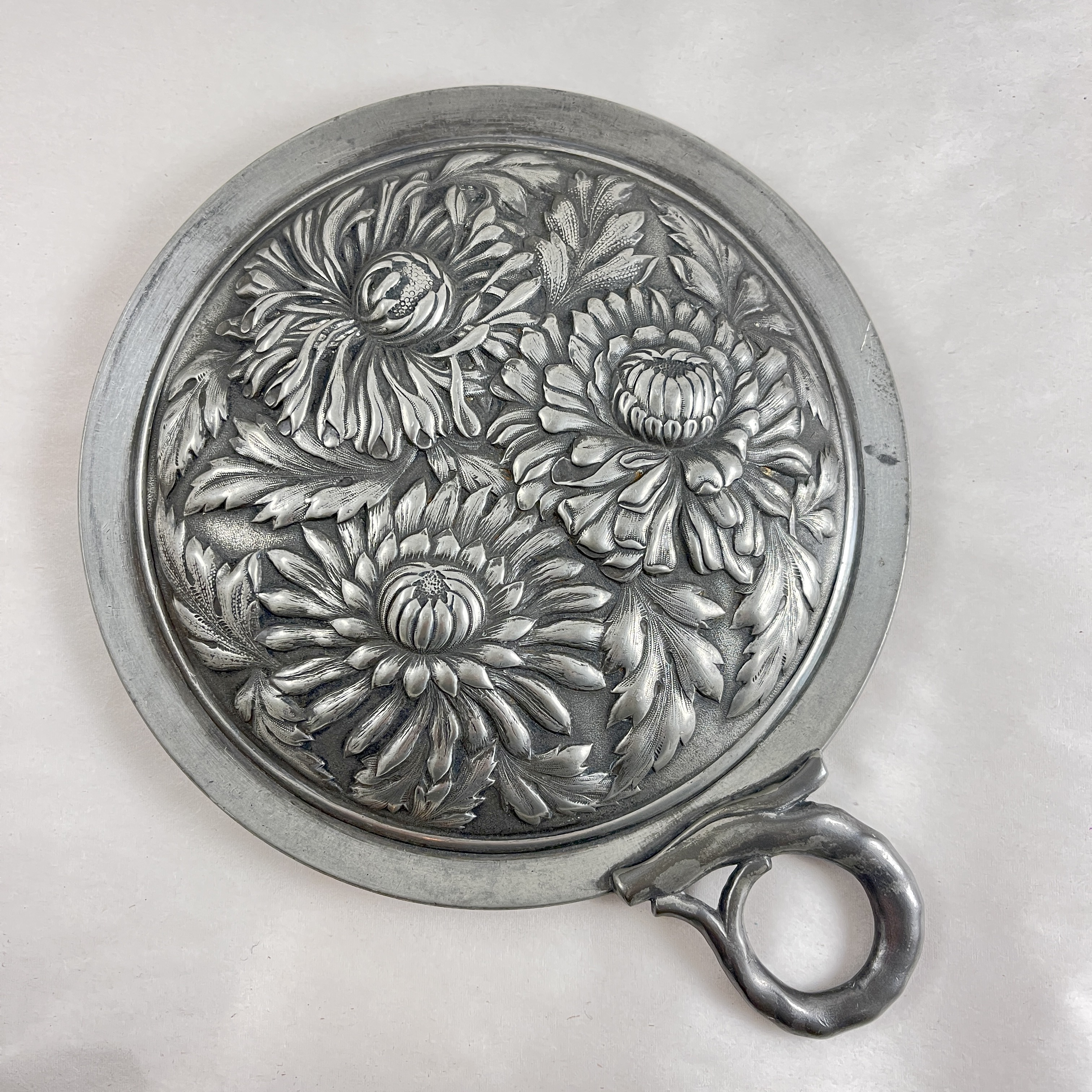 Made of Pewter, the circular back shows a domed, repousse pattern of overlapping Chrysanthemum flowers and leaves, within a wide flat rim.