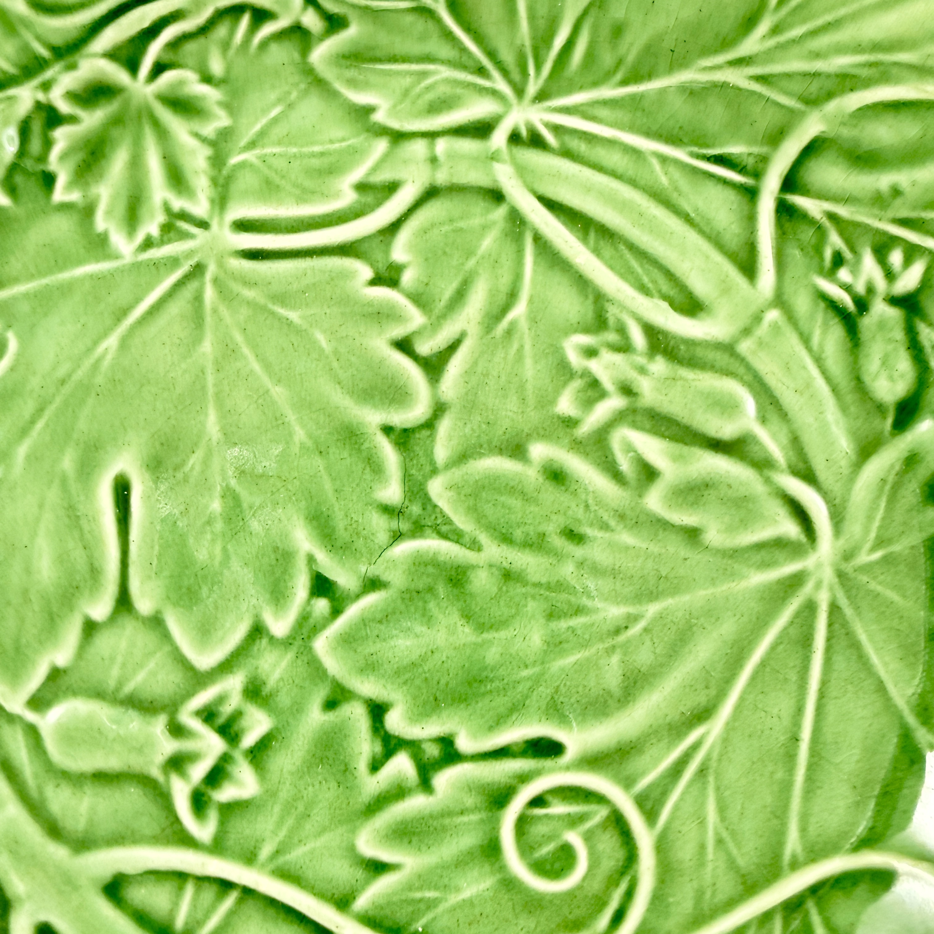 An iconic mold showing overlapping and vining grape leaves with a basket-weave border, glazed in a beautiful green.