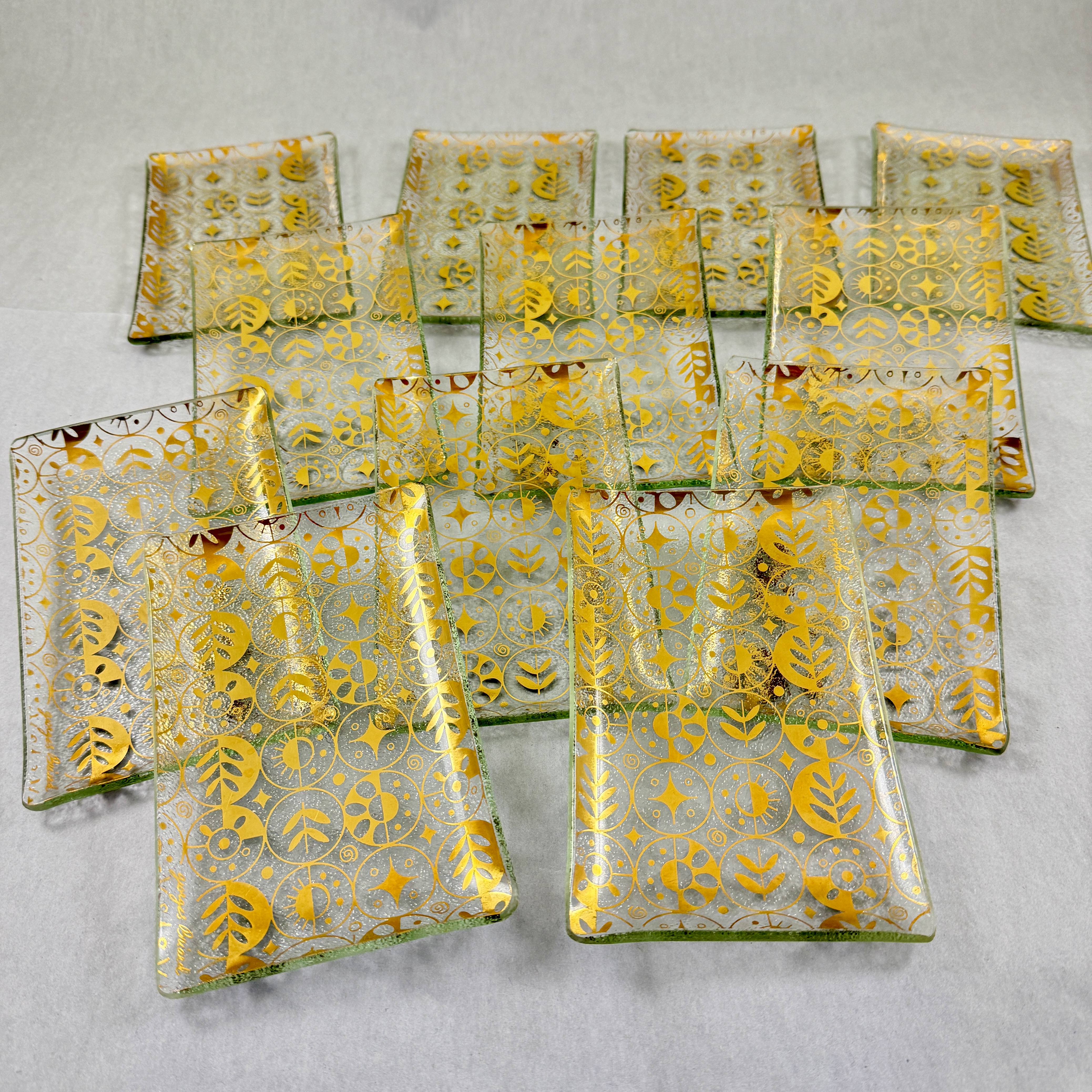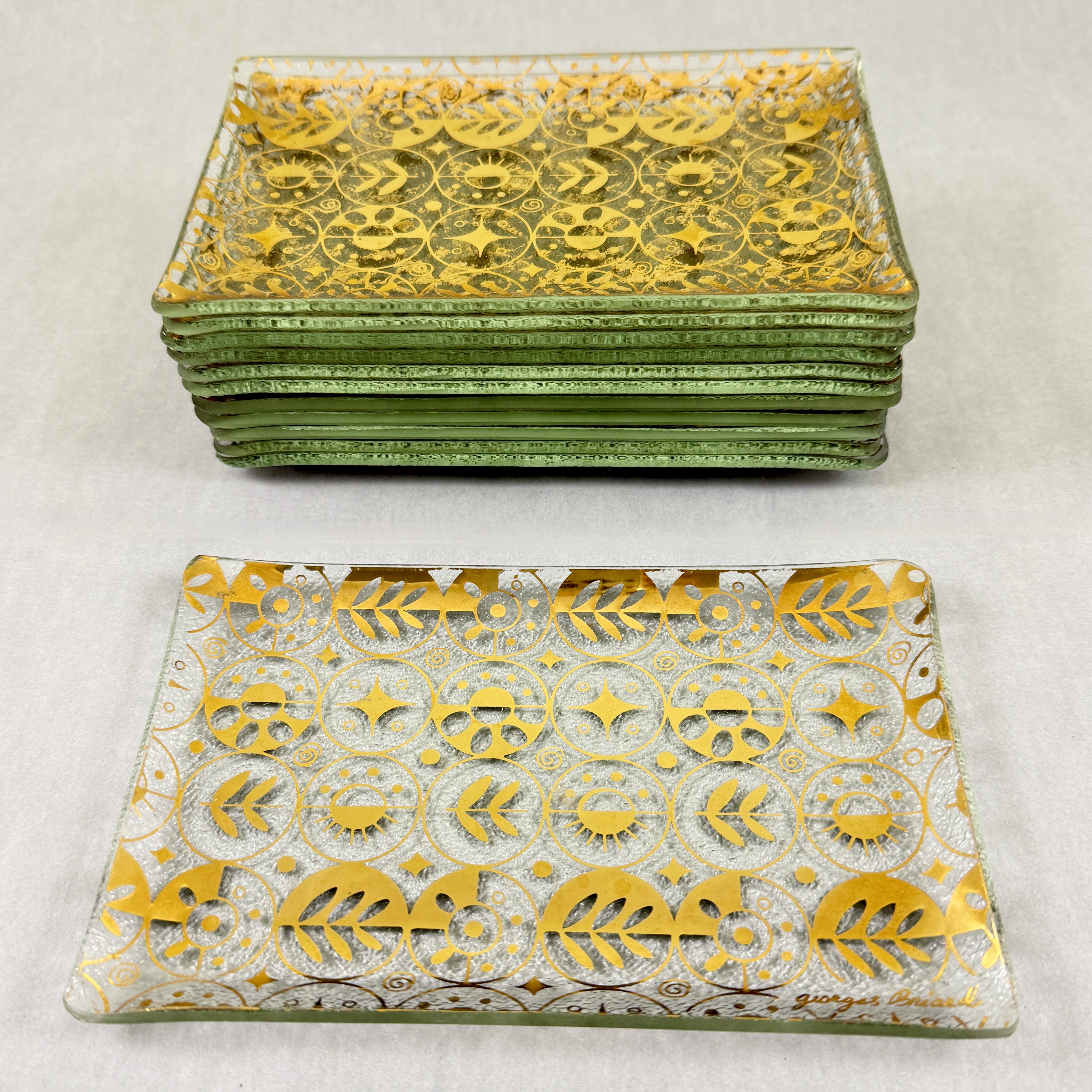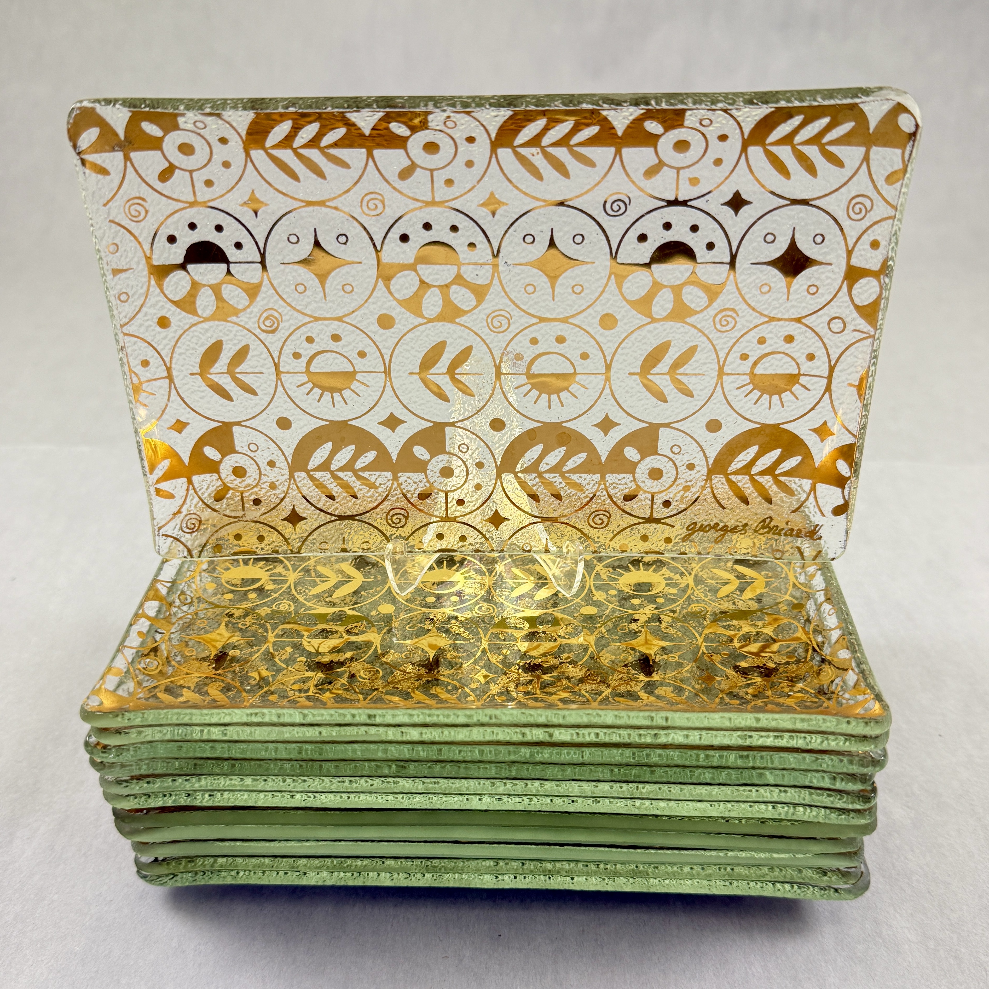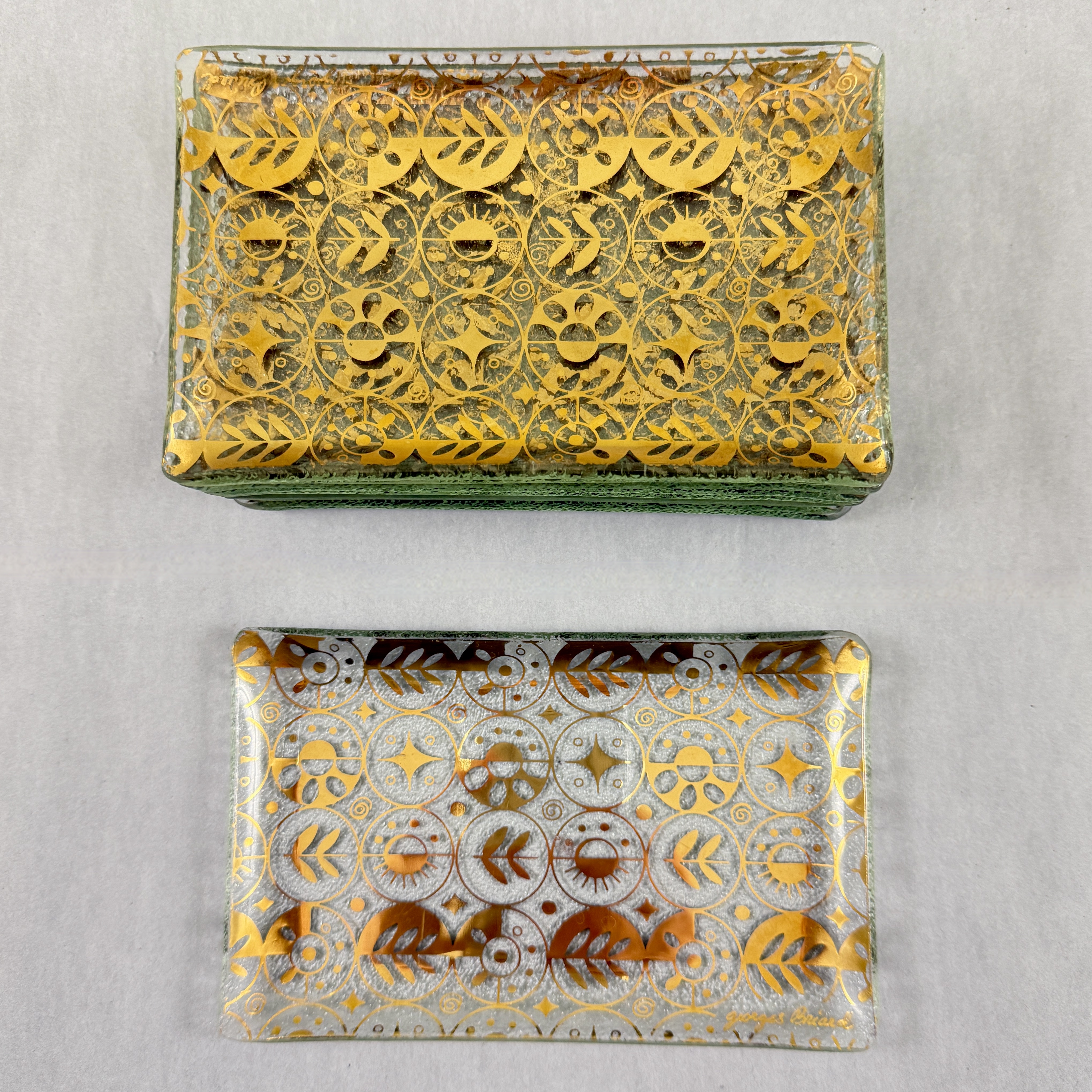 From the designer Georges Briard, and from the Forbidden Fruit collection, a set of twelve pebbled glass and gold leaf canapé trays, circa 1969.