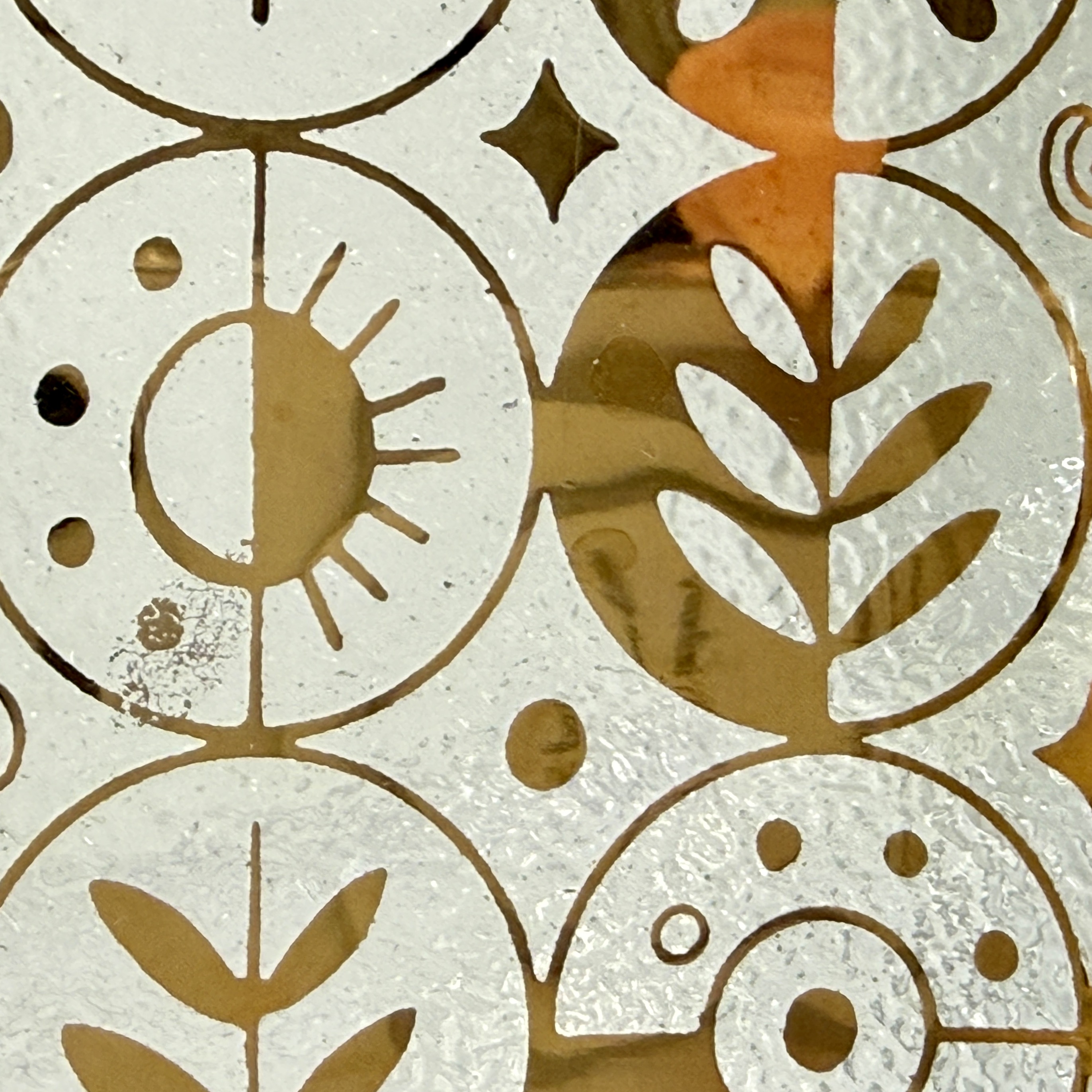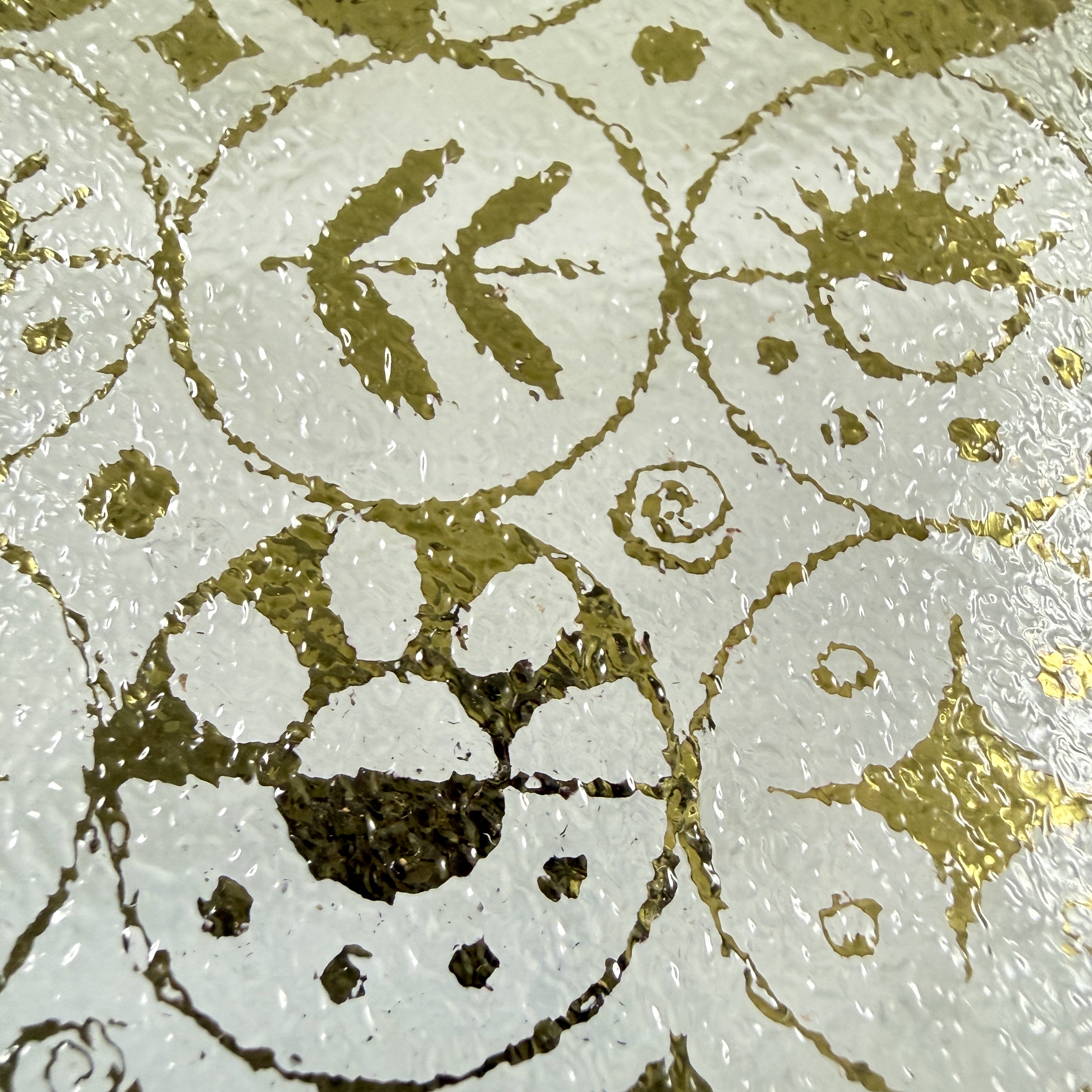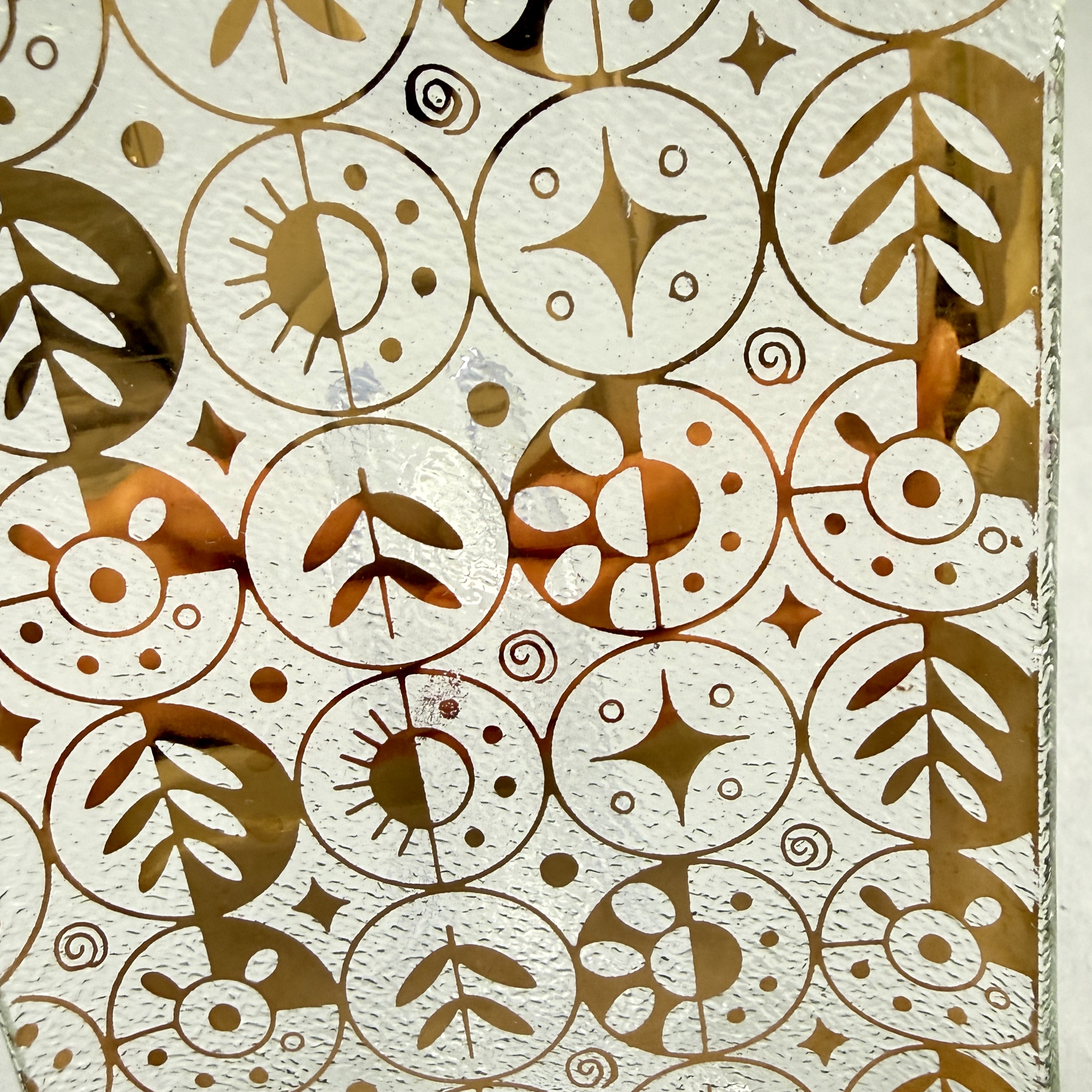 Georges Briard created his glass Forbidden Fruit collection for his 1969 catalogue. The glassware serving pieces are considered Mid-Century Modern and feature a grid pattern of gilded circles with geometric and leaf motifs colored in gold on clear transparent glass.
