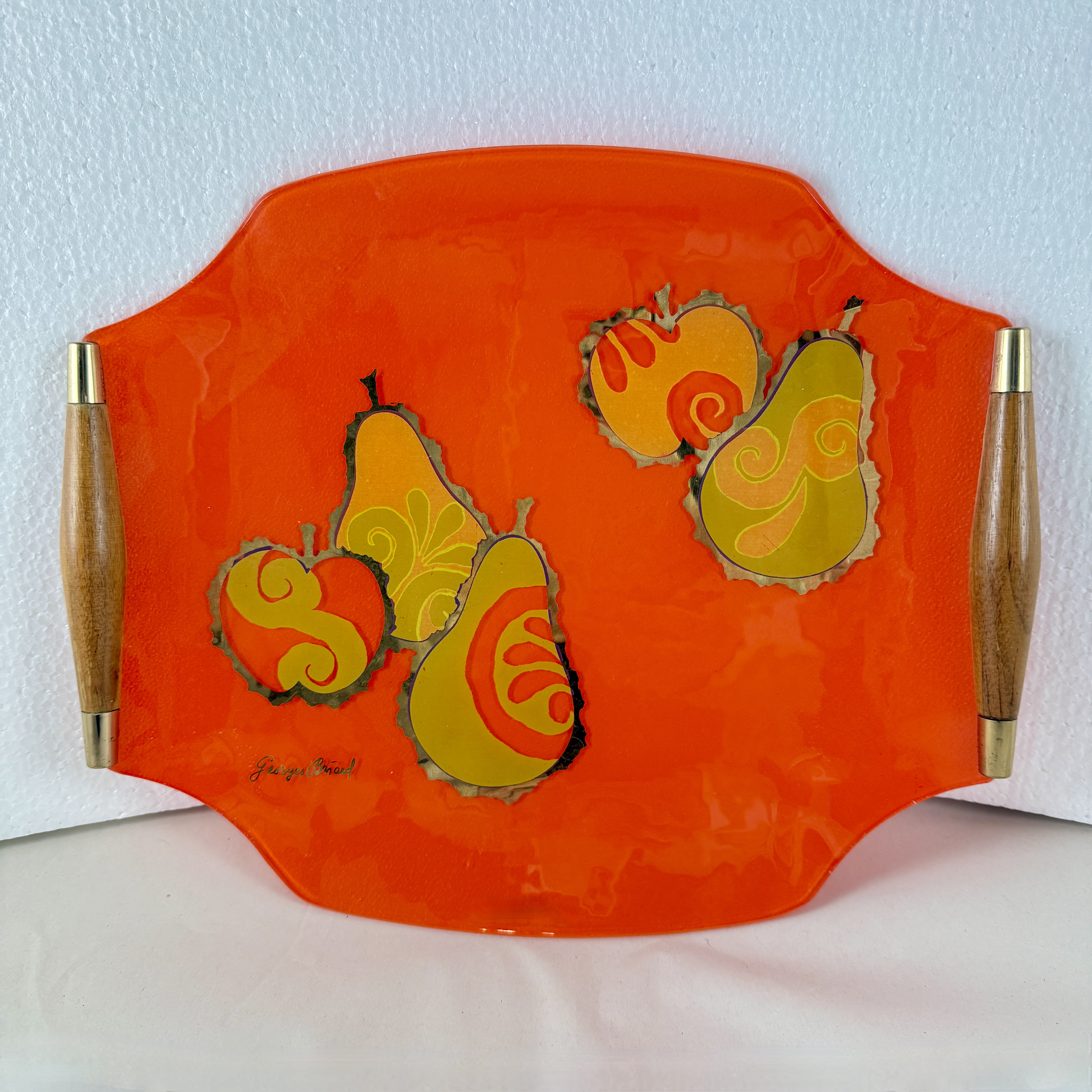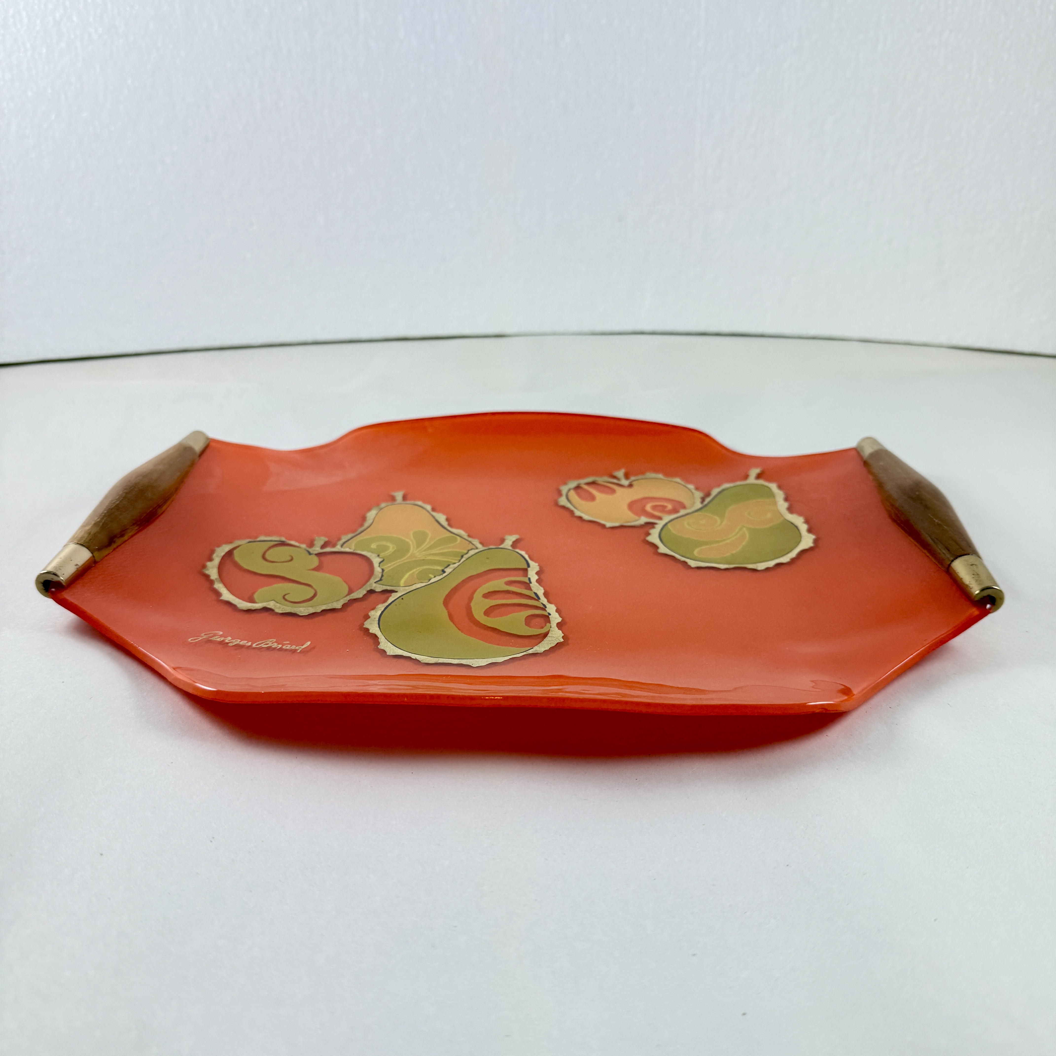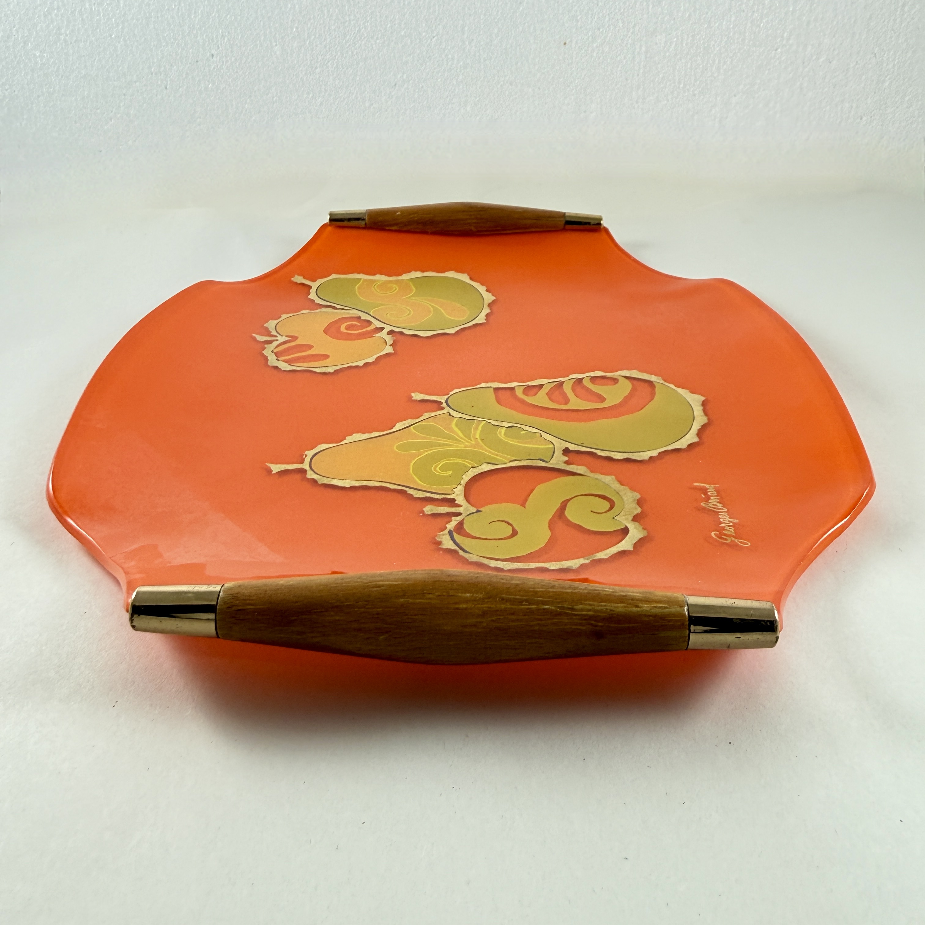 From the designer Georges Briard, and from the Pageant Fruit collection, a Mandarin Orange glass and wood handled serving tray, circa 1964.
