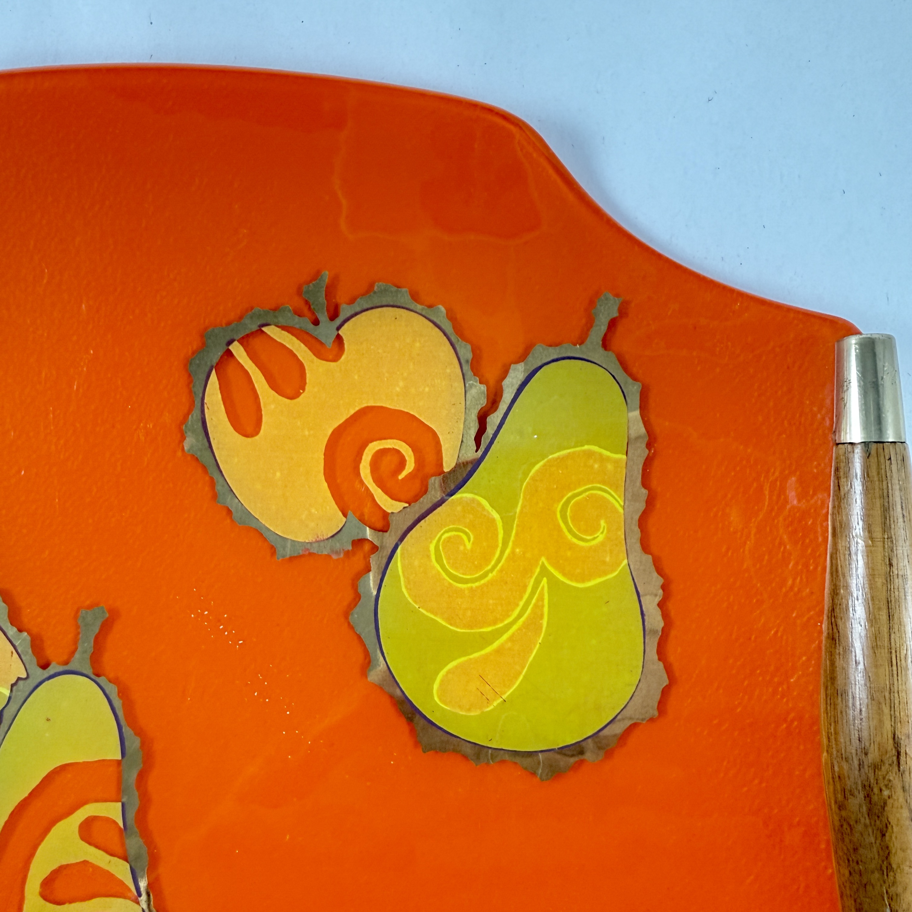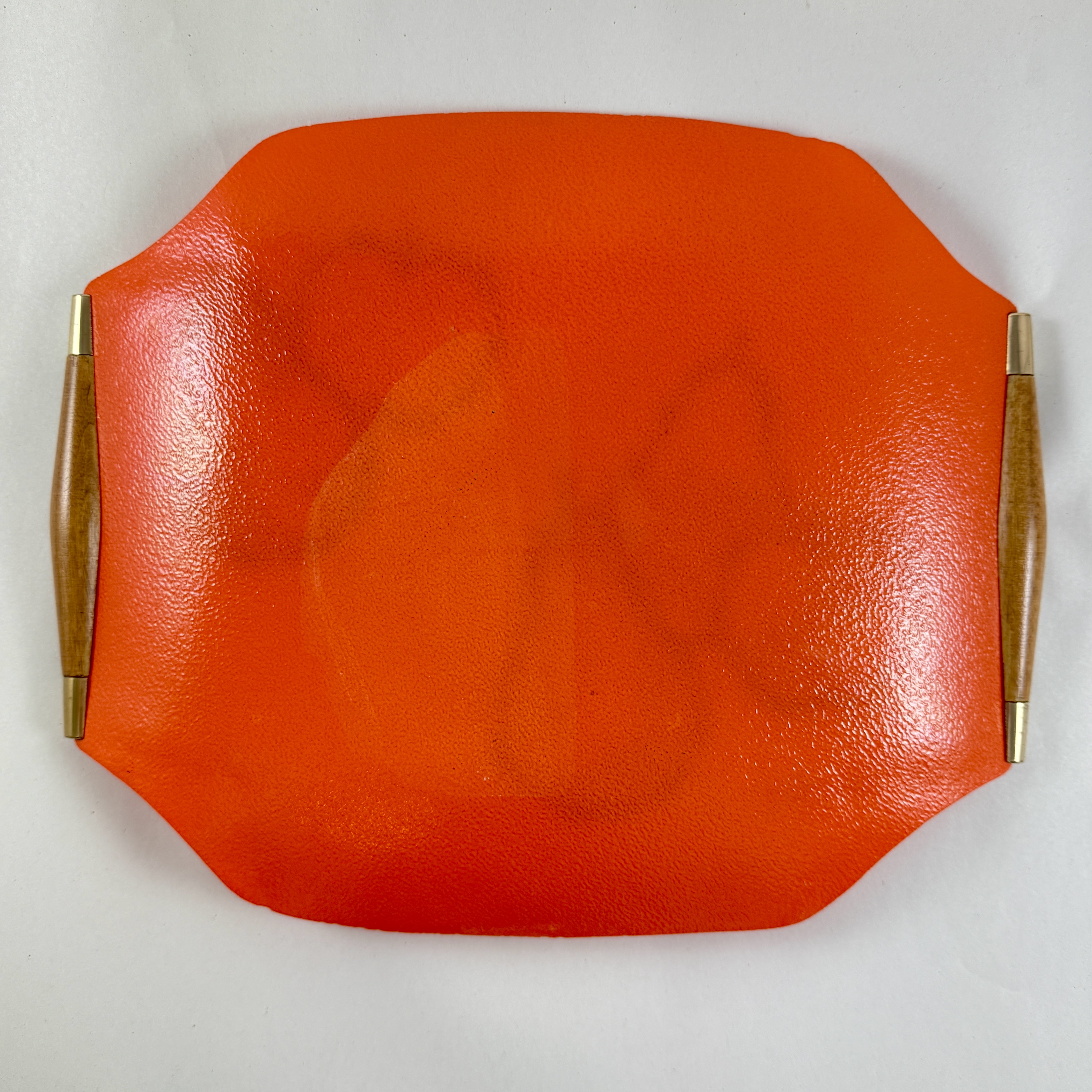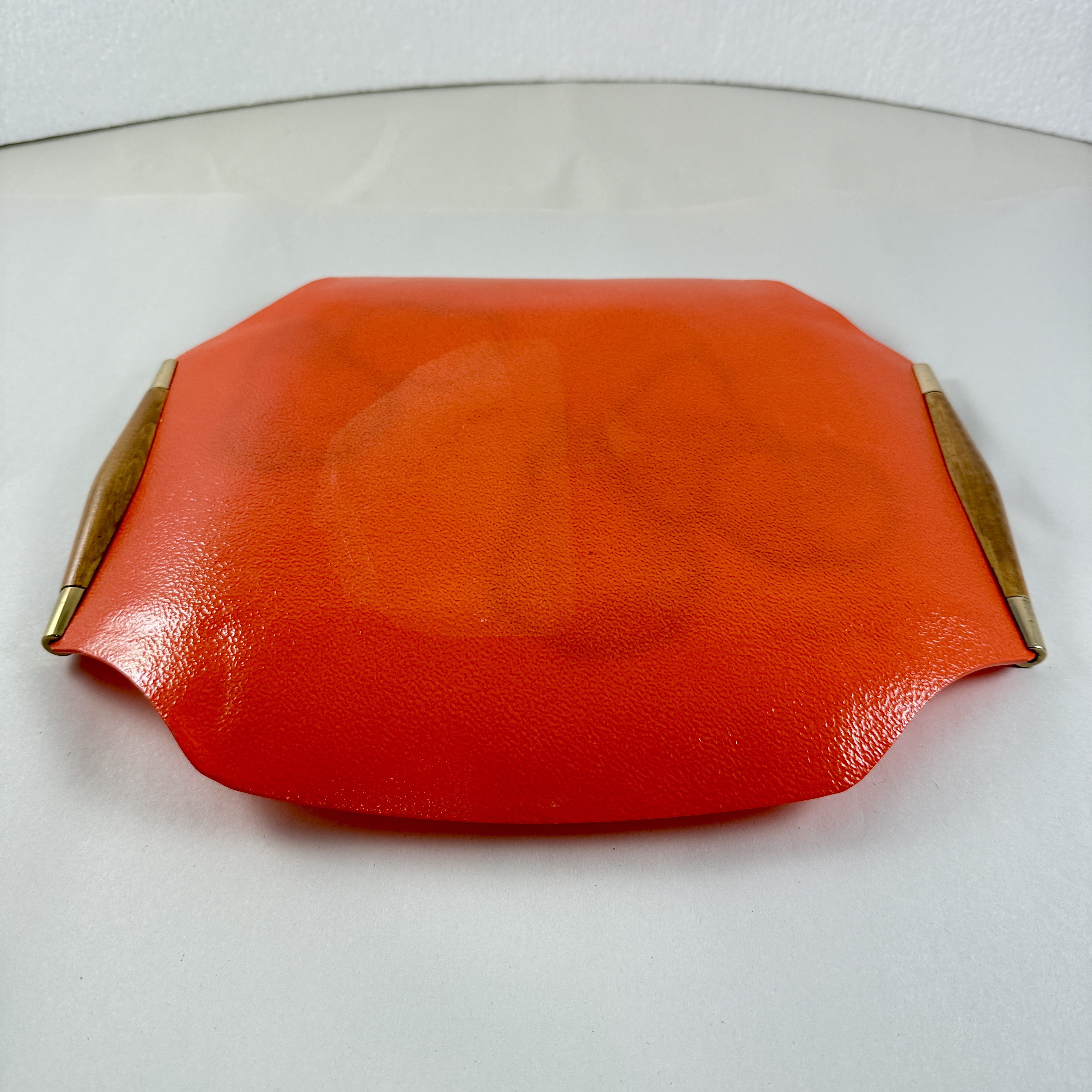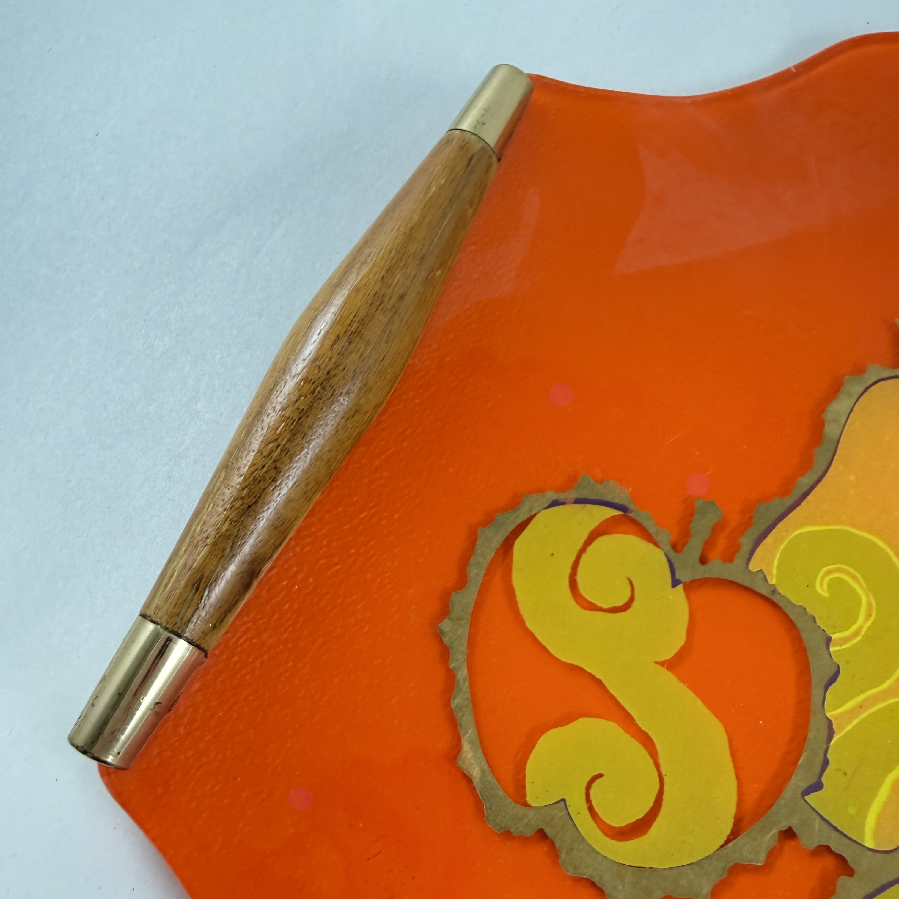 From the designer Georges Briard, and from the Pageant Fruit collection, a Mandarin Orange glass and wood handled serving tray, circa 1964.
