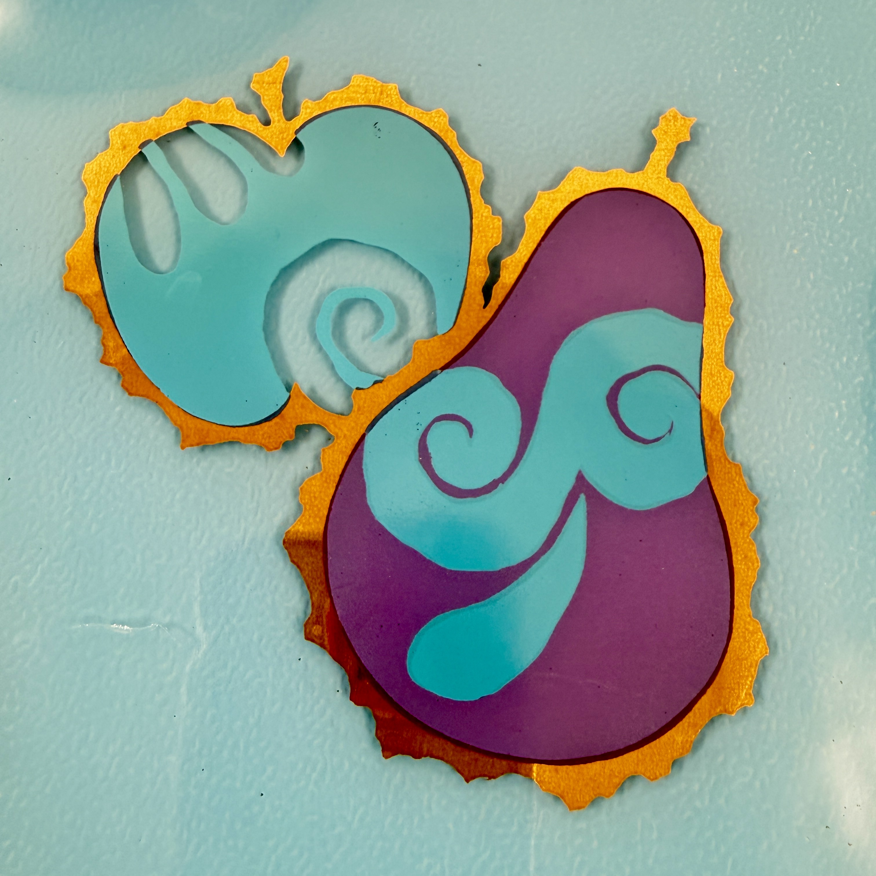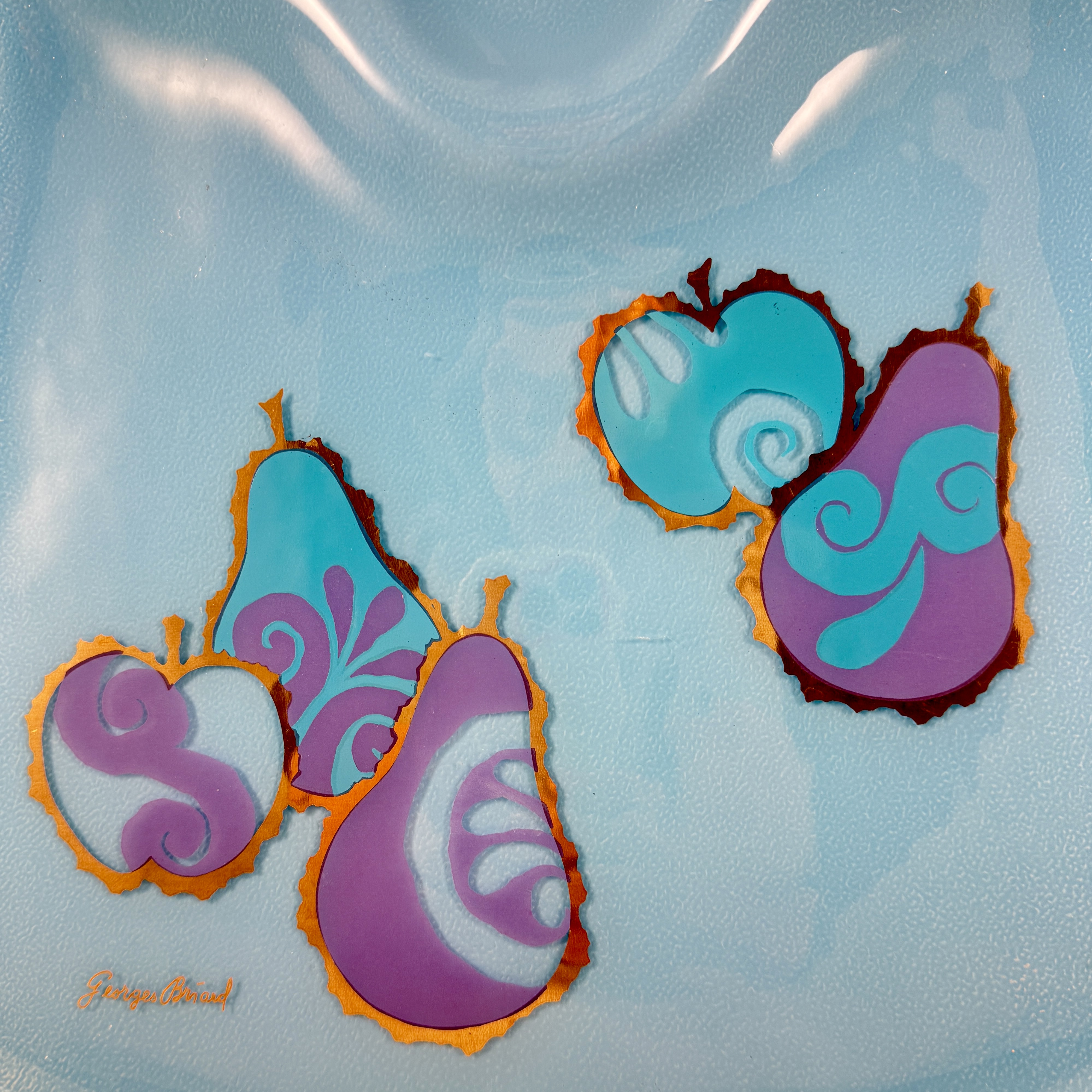 Georges Briard created his Pageant fruit collection during the early 1960s. The glassware and serving pieces are considered Mid-Century Modern and feature gilded fruit designs. The tray shows a parade of pears and apples outlined with wide gilded accents. Each fruit is adorned with a deep blue paisley-like pattern. The tray has a molded spot for holding a dip bowl.