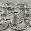 The footed, fluted cups are decorated on the inside and out with a corresponding running ribbon and floral pattern, with green lining on the handle.