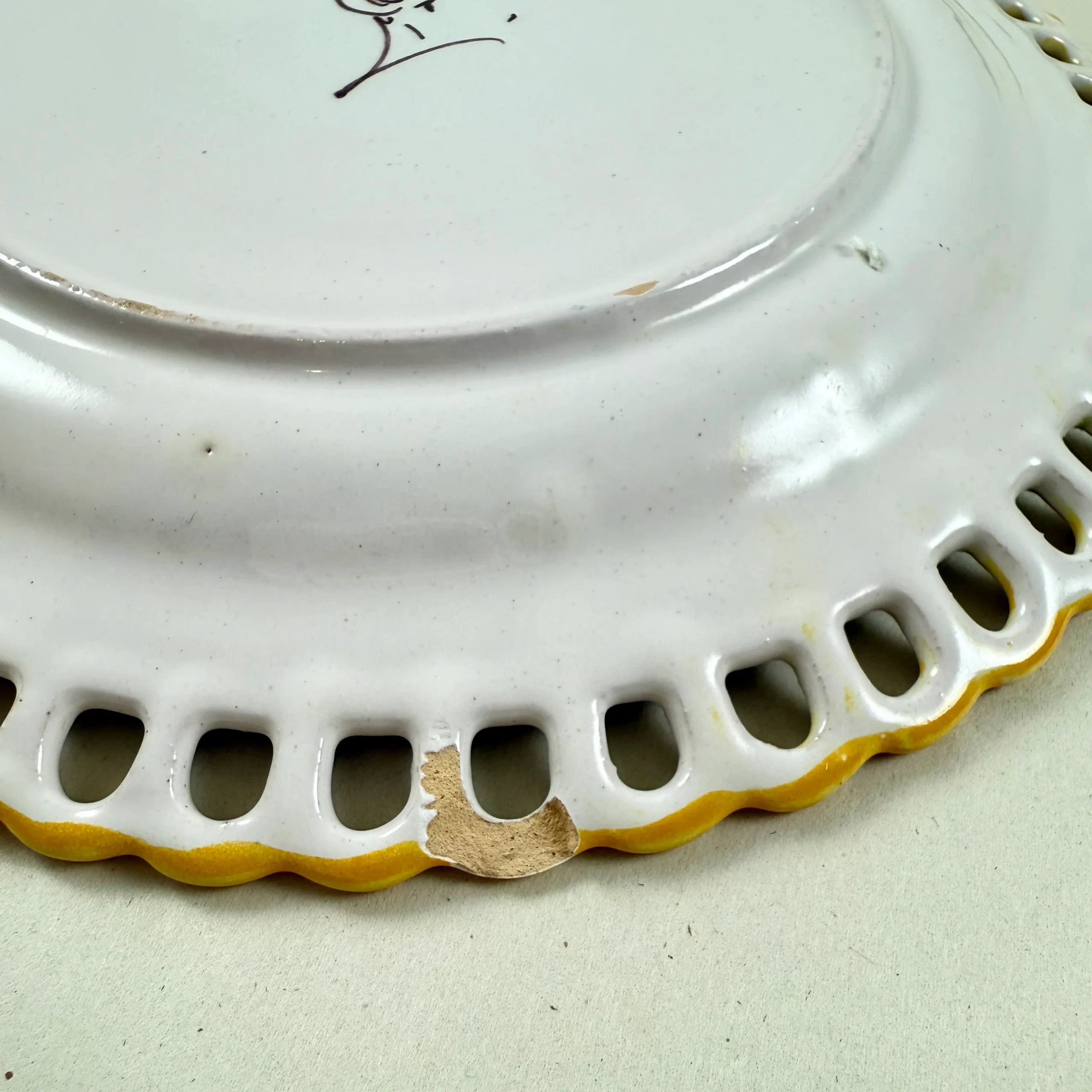 The reticulate edge is glazed in a yellow ochre fading to a pale green, and outlined in a burnt Sienna.