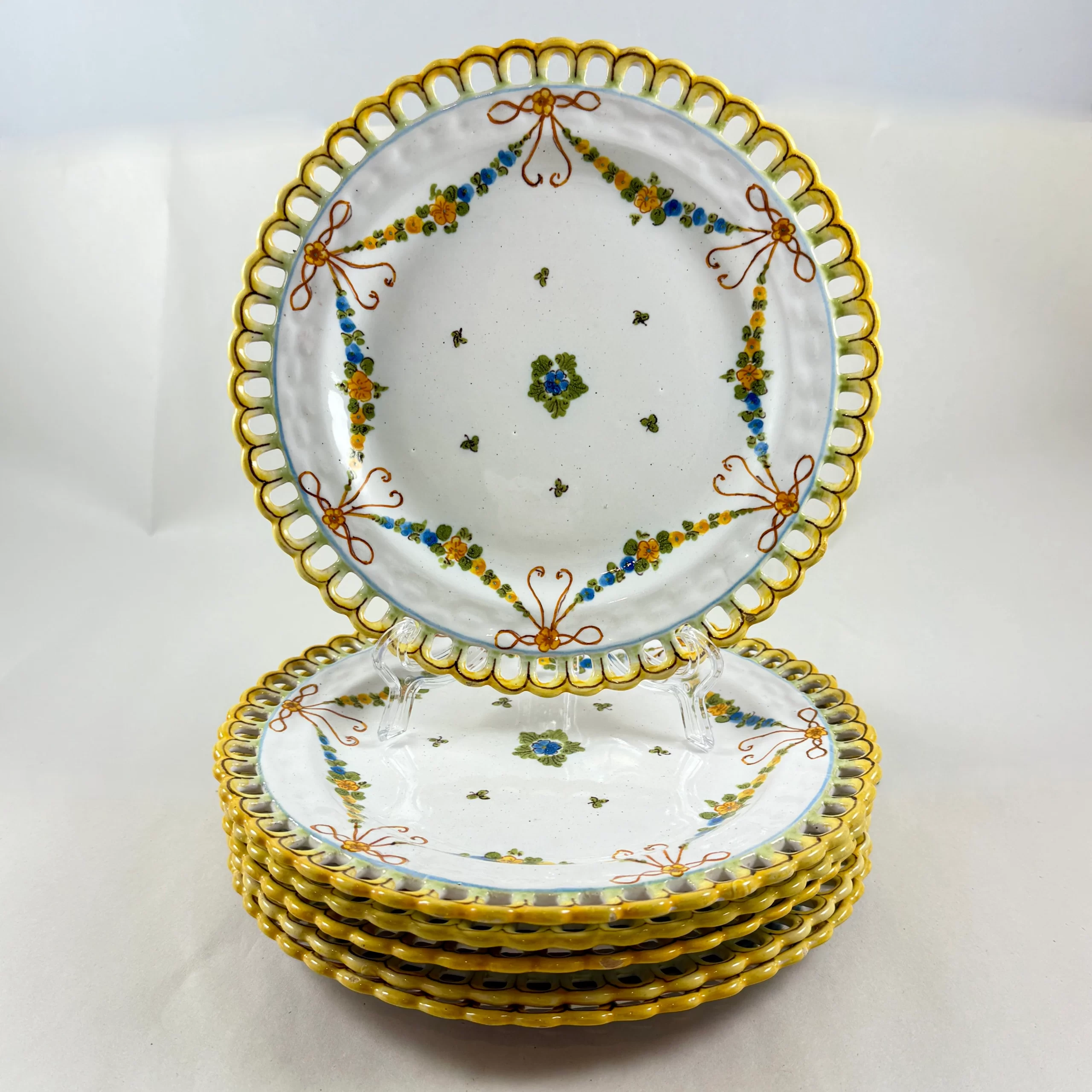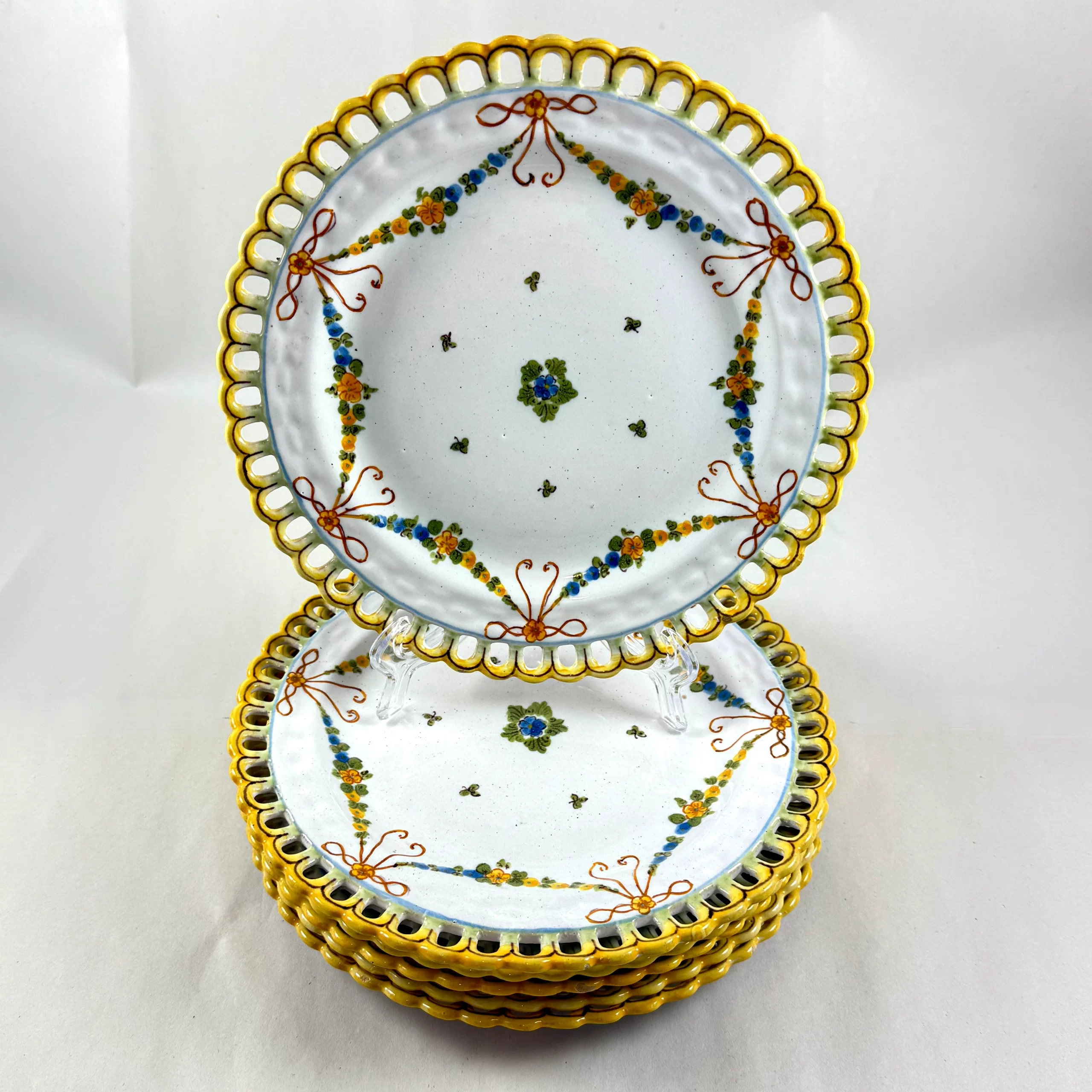 From The Cantagalli Pottery in Florence, Italy, a set of six hand painted reticulated earthenware plates, showing the Crowing Rooster mark used in the early 20th Century.