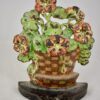 A vintage cast iron doorstop showing a geranium plant set inside a woven checkered flower pot on an iron plinth. Retaining the original painted finish.
