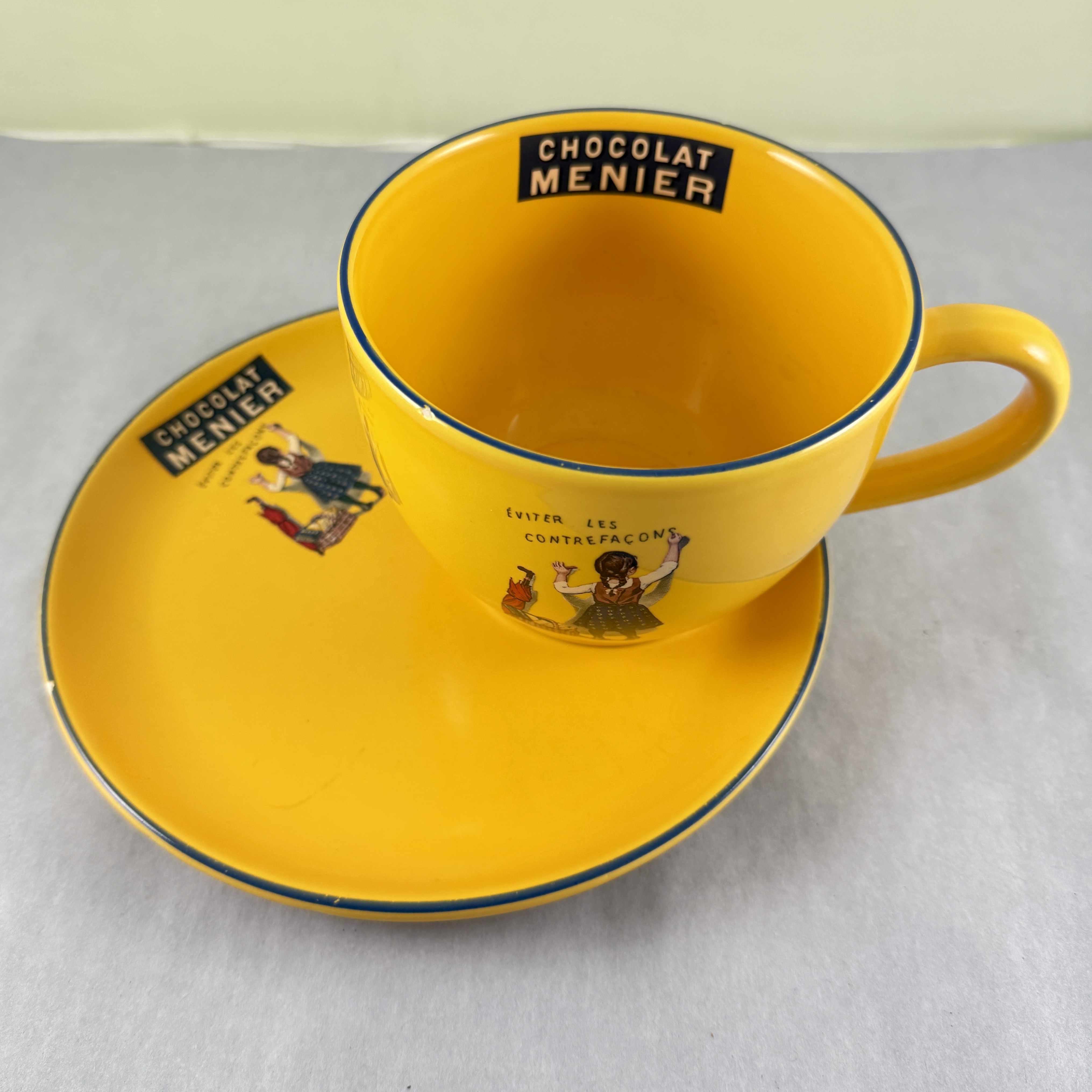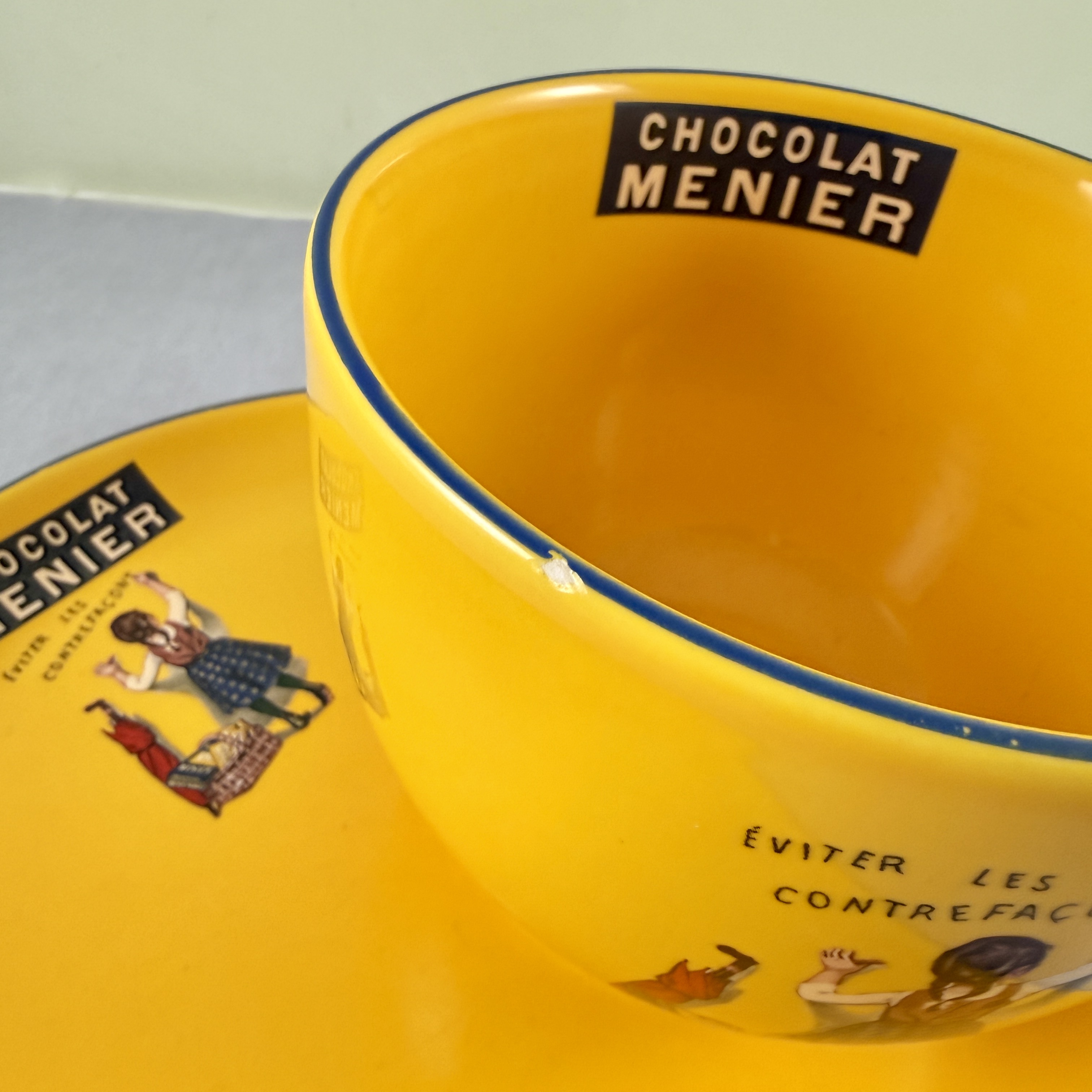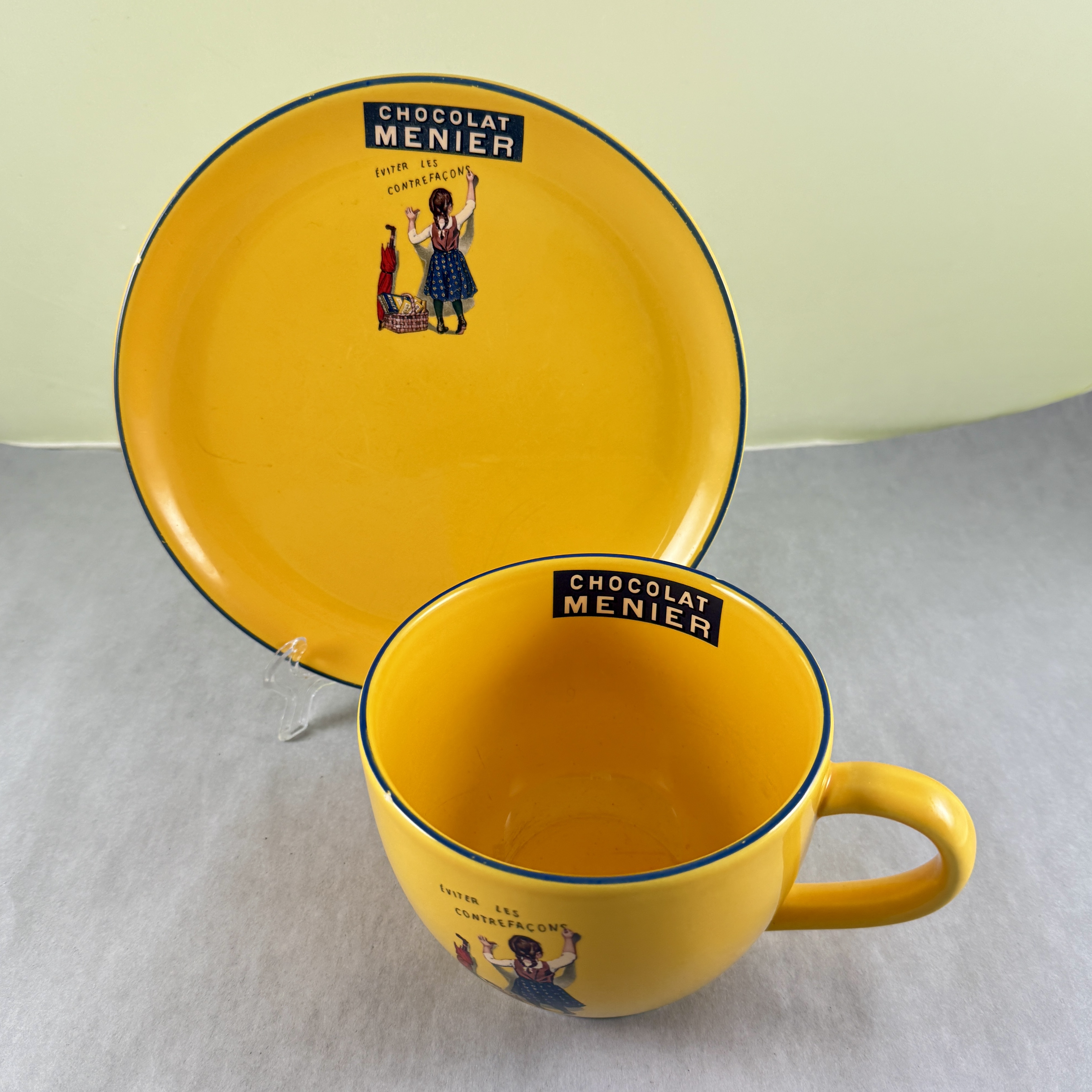 A two piece set, a large cup or soupier and plate glazed in the iconic Menier yellow with blue rims. Both pieces show the classic Chocolat Menier branding – an image of a French schoolgirl with her red umbrella and biscuits in a basket. The jeune fille writes, “eviter les contrefaçons” – avoid counterfeits.