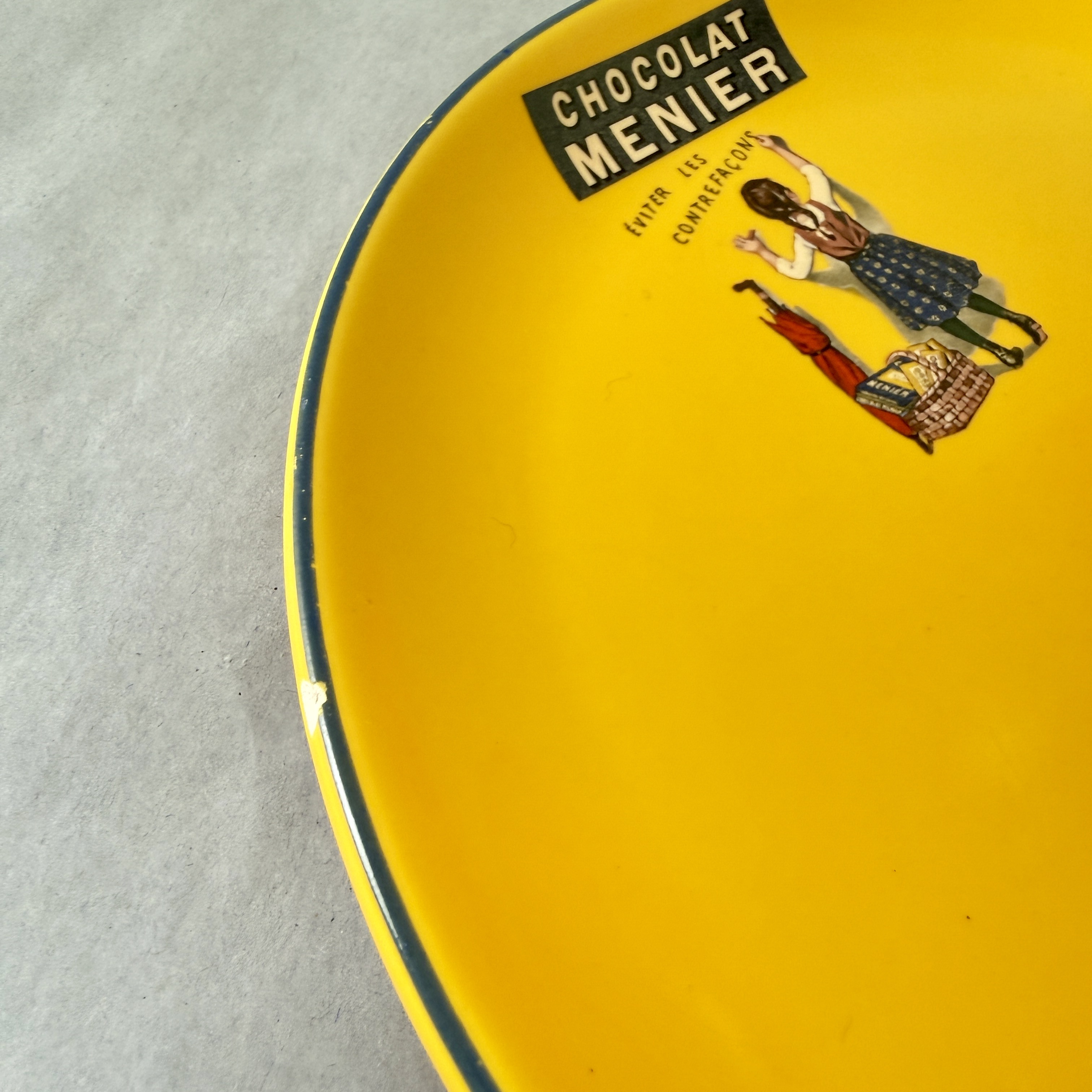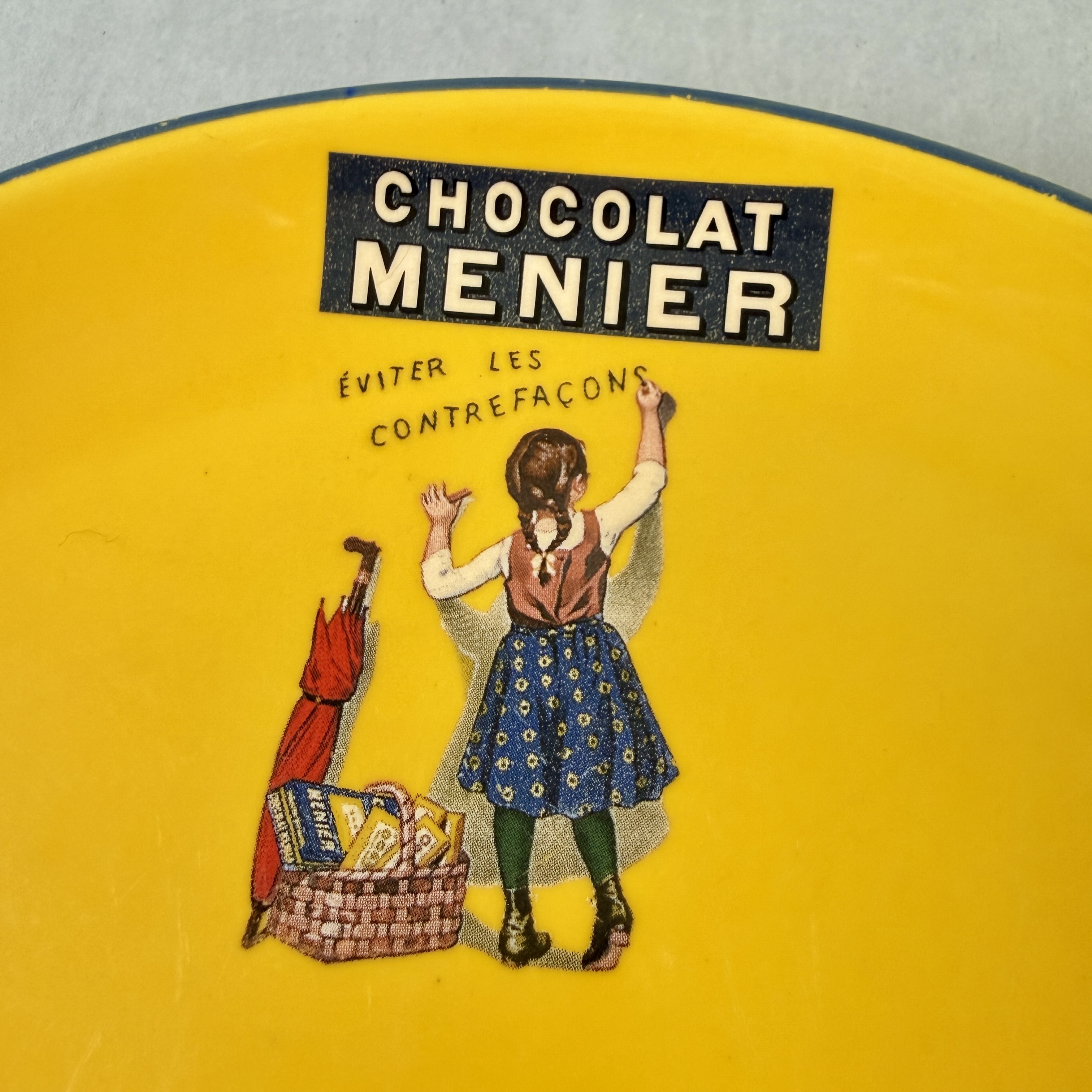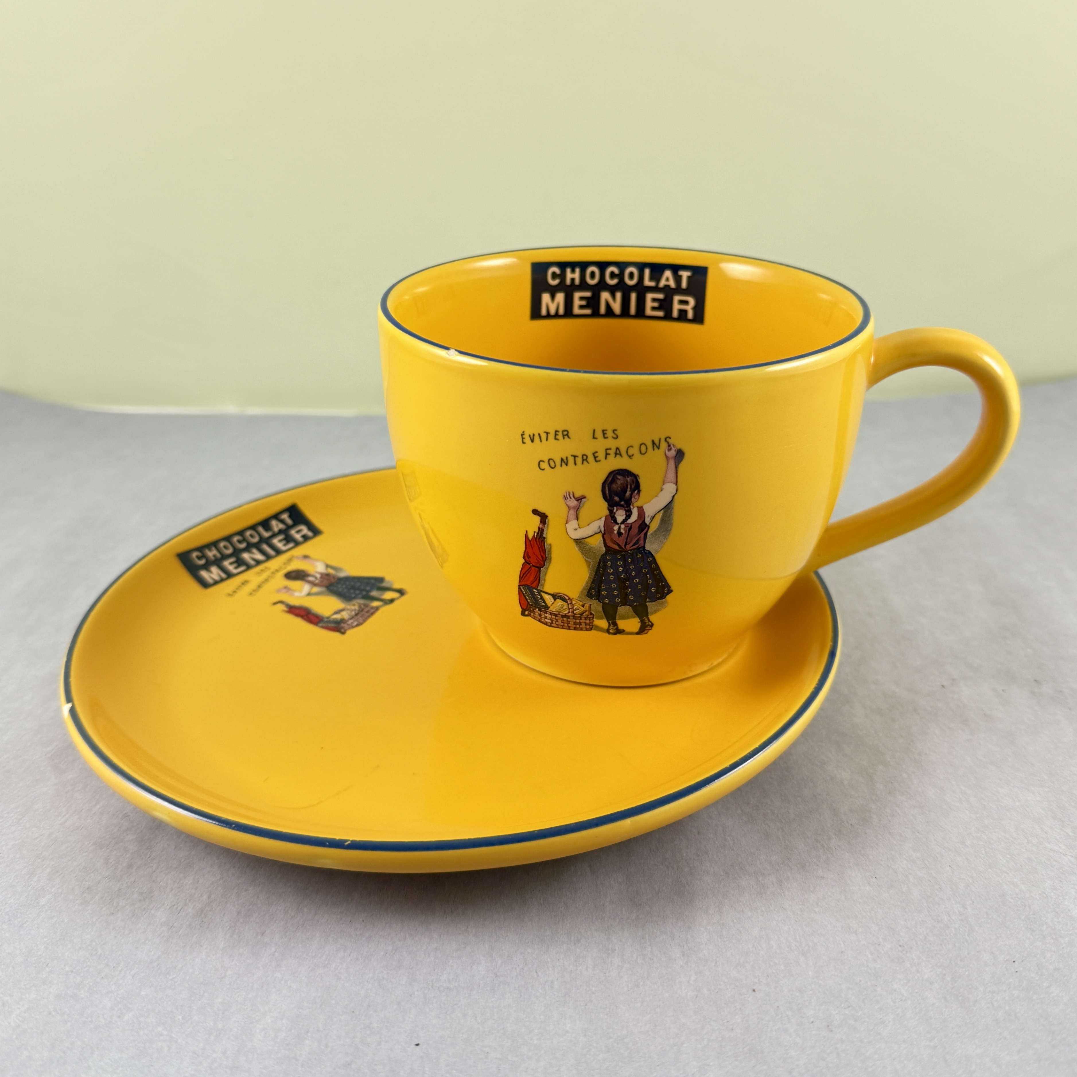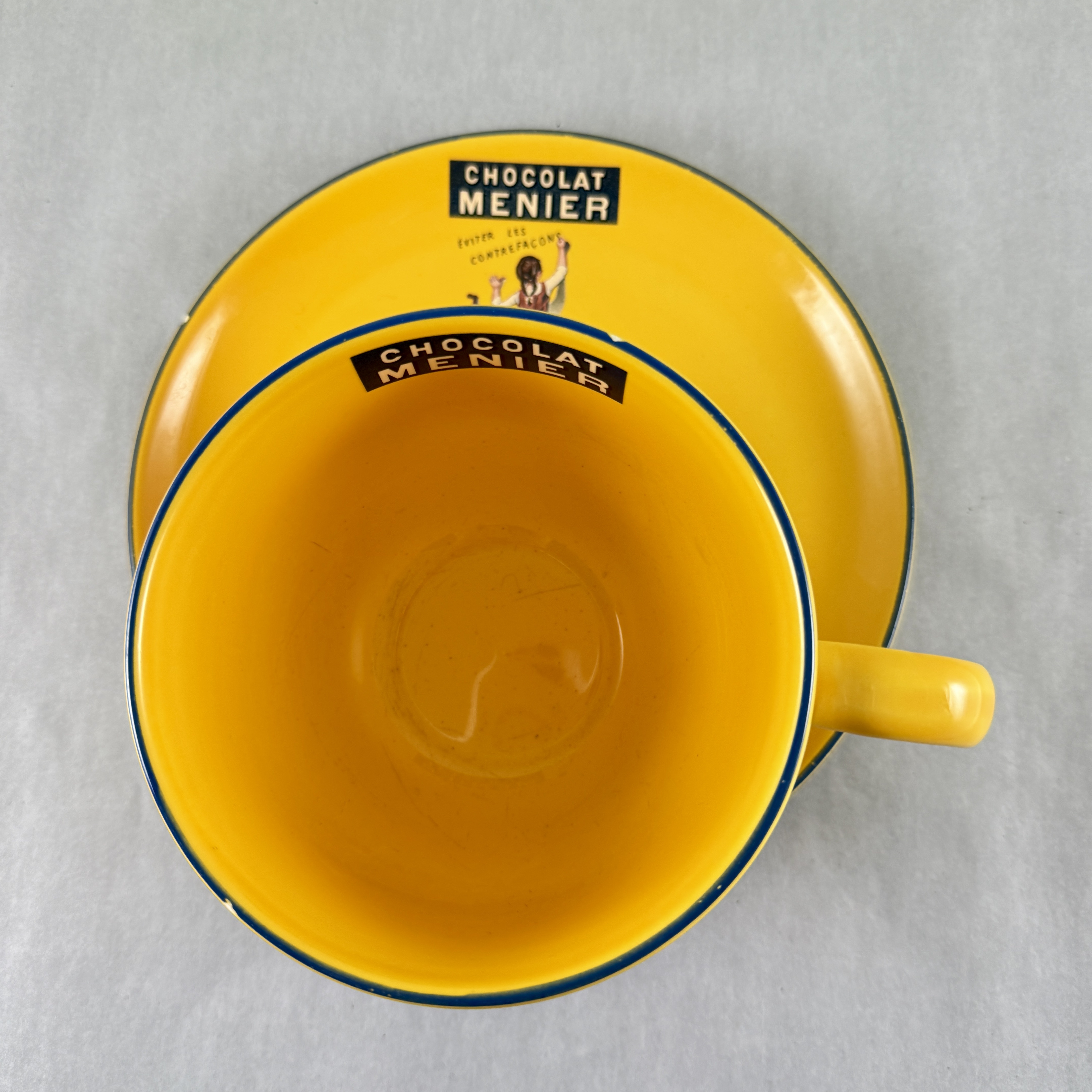 A two piece set, a large cup or soupier and plate glazed in the iconic Menier yellow with blue rims. Both pieces show the classic Chocolat Menier branding – an image of a French schoolgirl with her red umbrella and biscuits in a basket. The jeune fille writes, “eviter les contrefaçons” – avoid counterfeits.