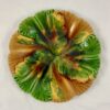 Glazed in a swirling mix of yellow ochre and shades of green, the mold shows leaves with incised veining terminating in a shaped rim.
