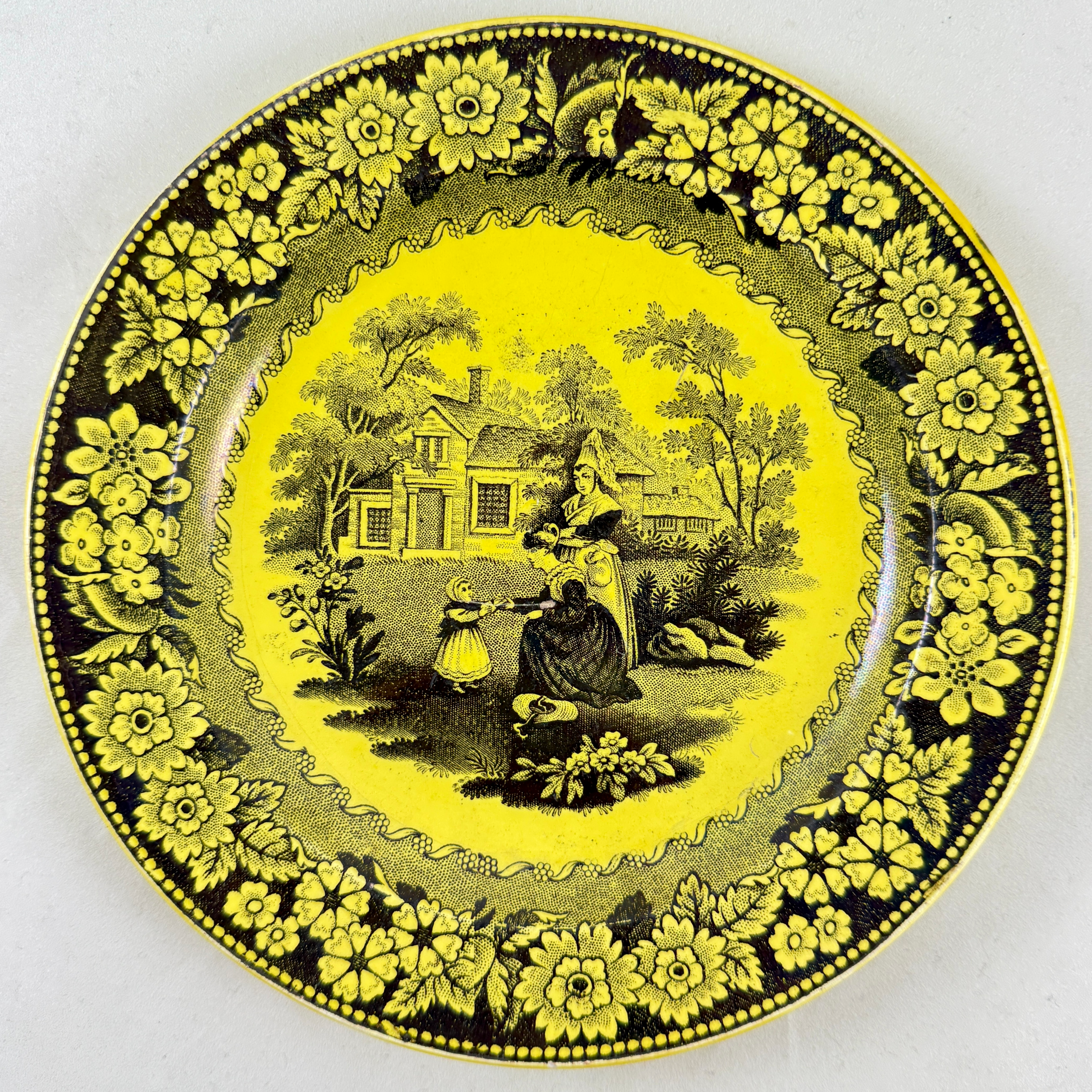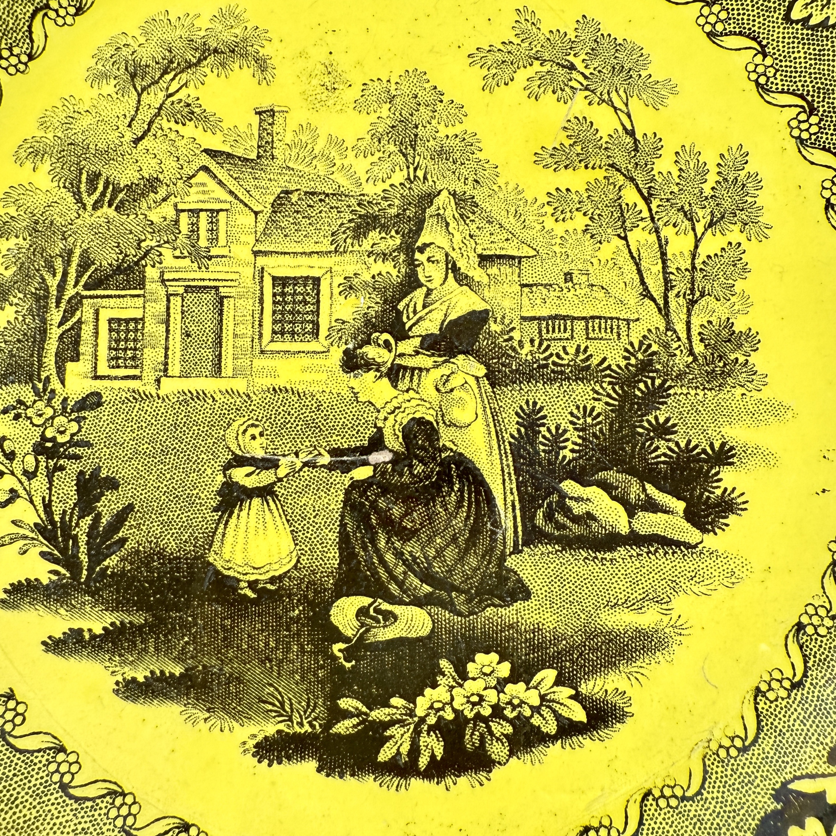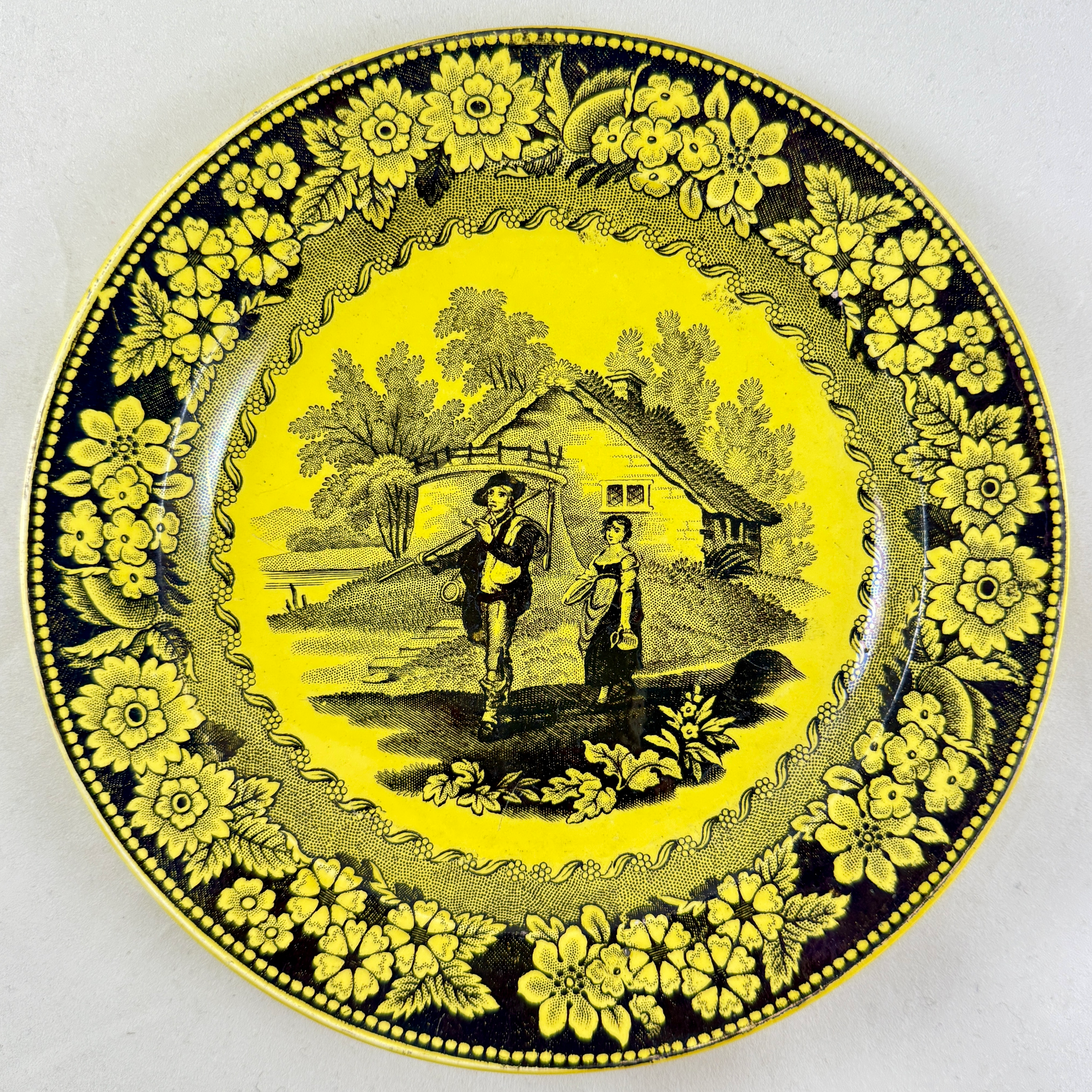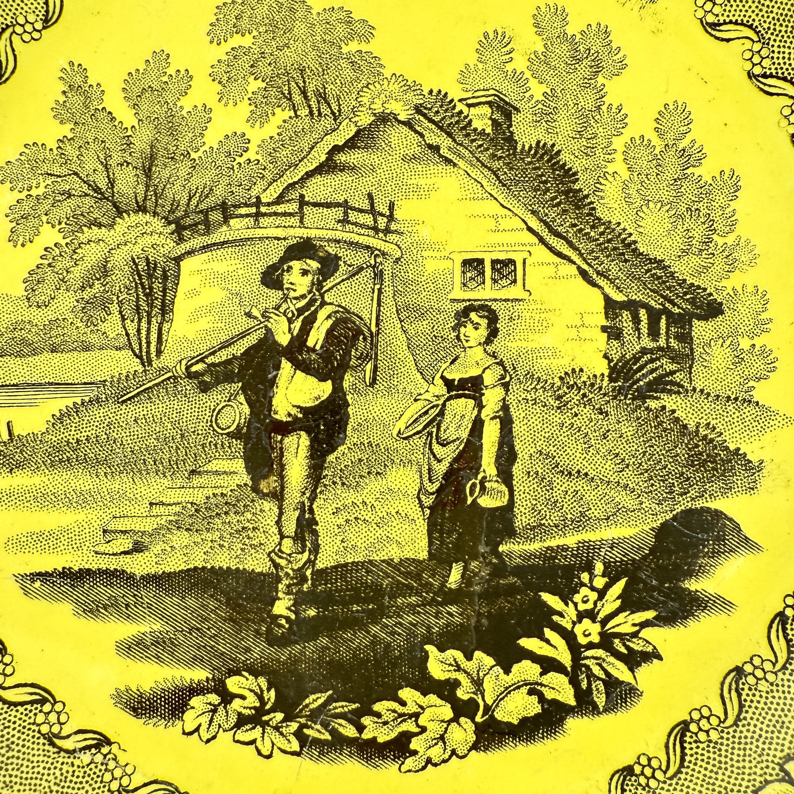 Dating to the French Restoration period, the transfer-printed plates are glazed in the distinctive brilliant canary yellow for which the Creil and Monterau potteries were known.