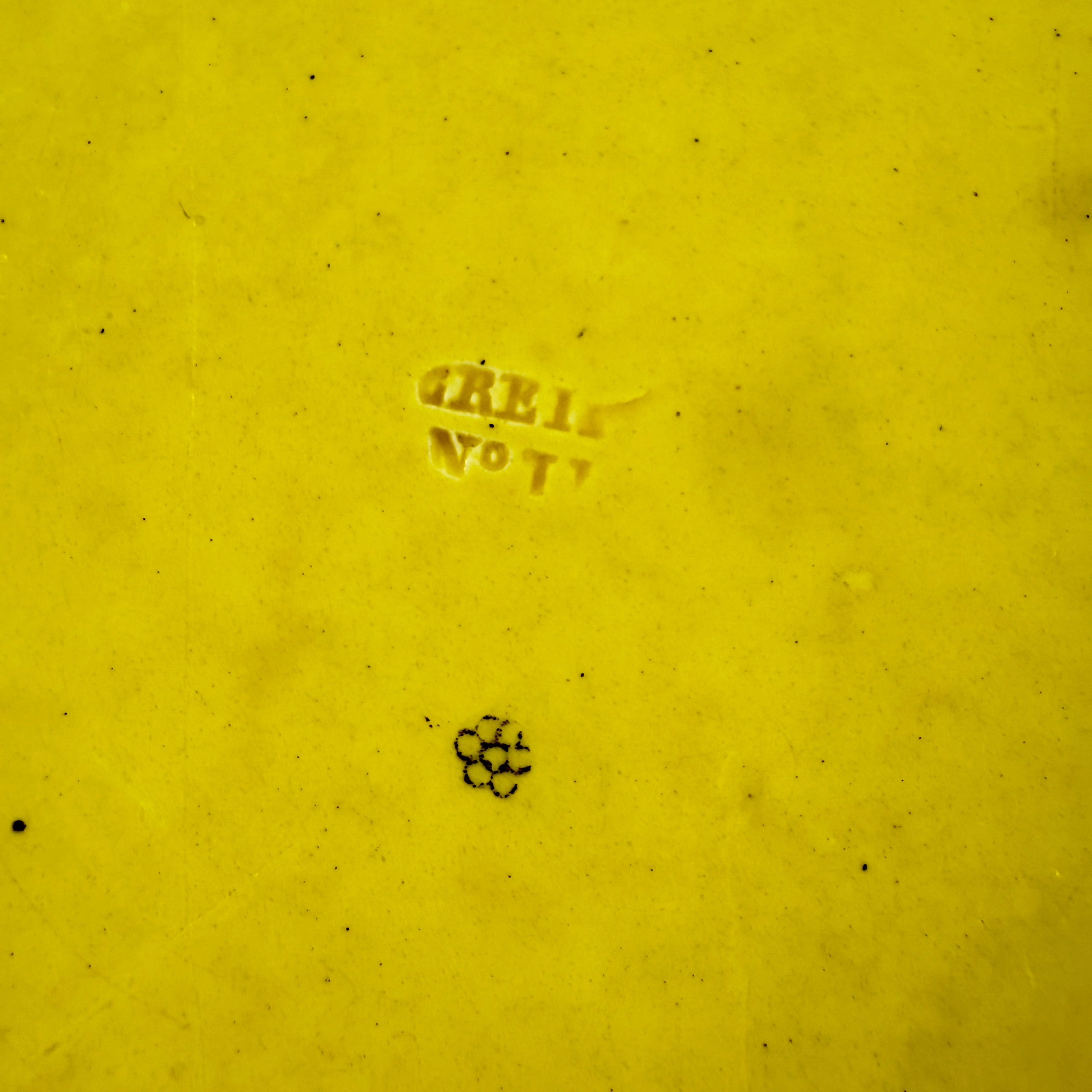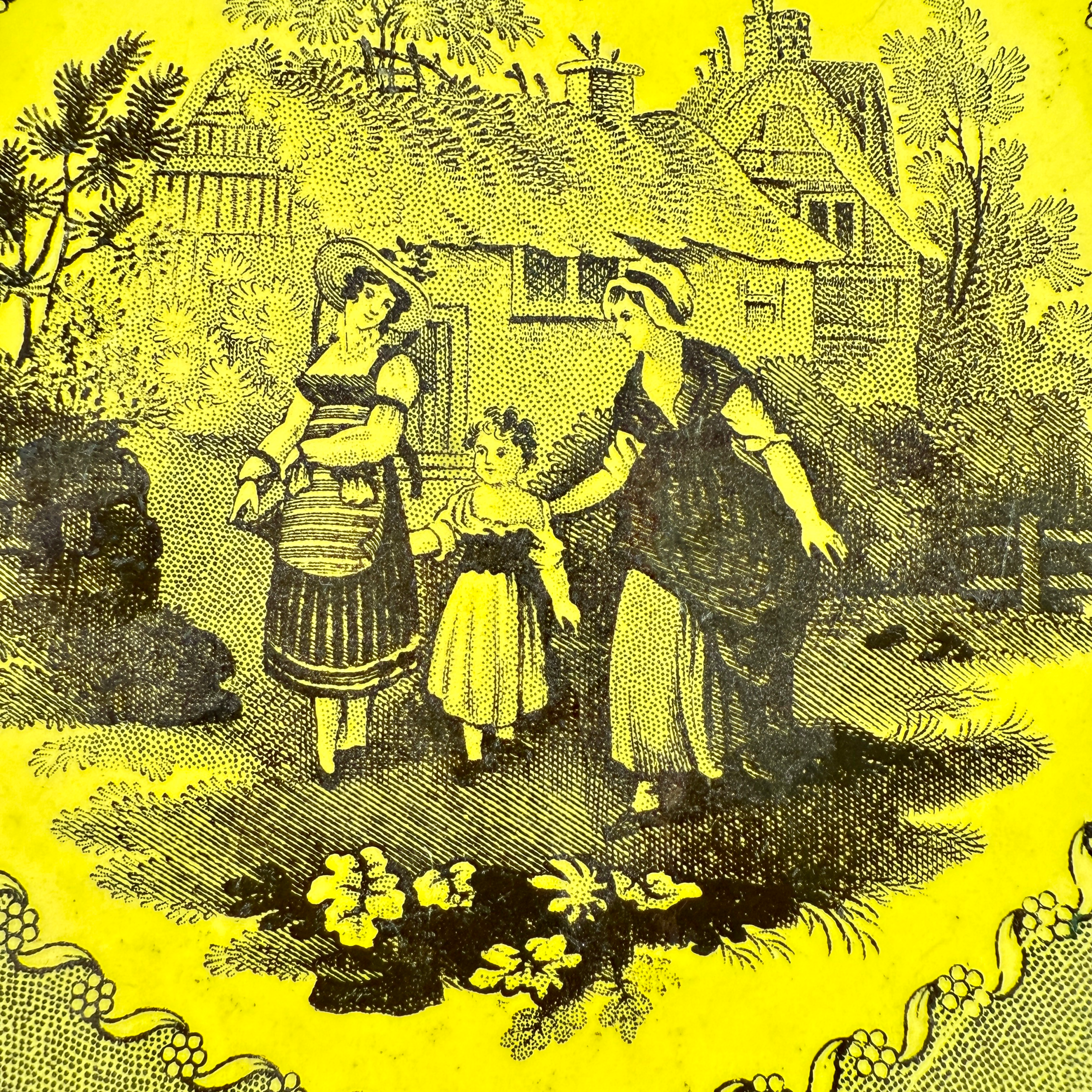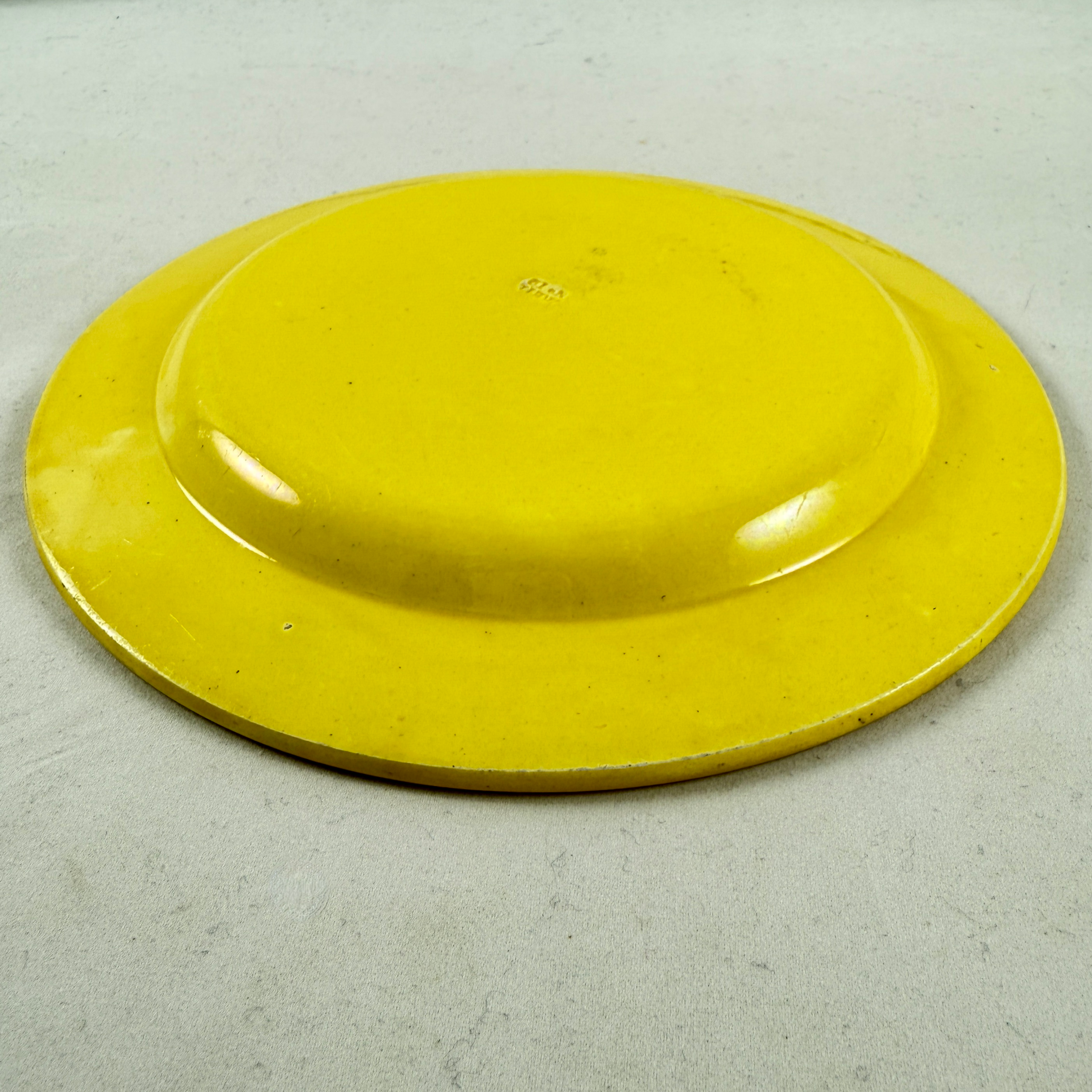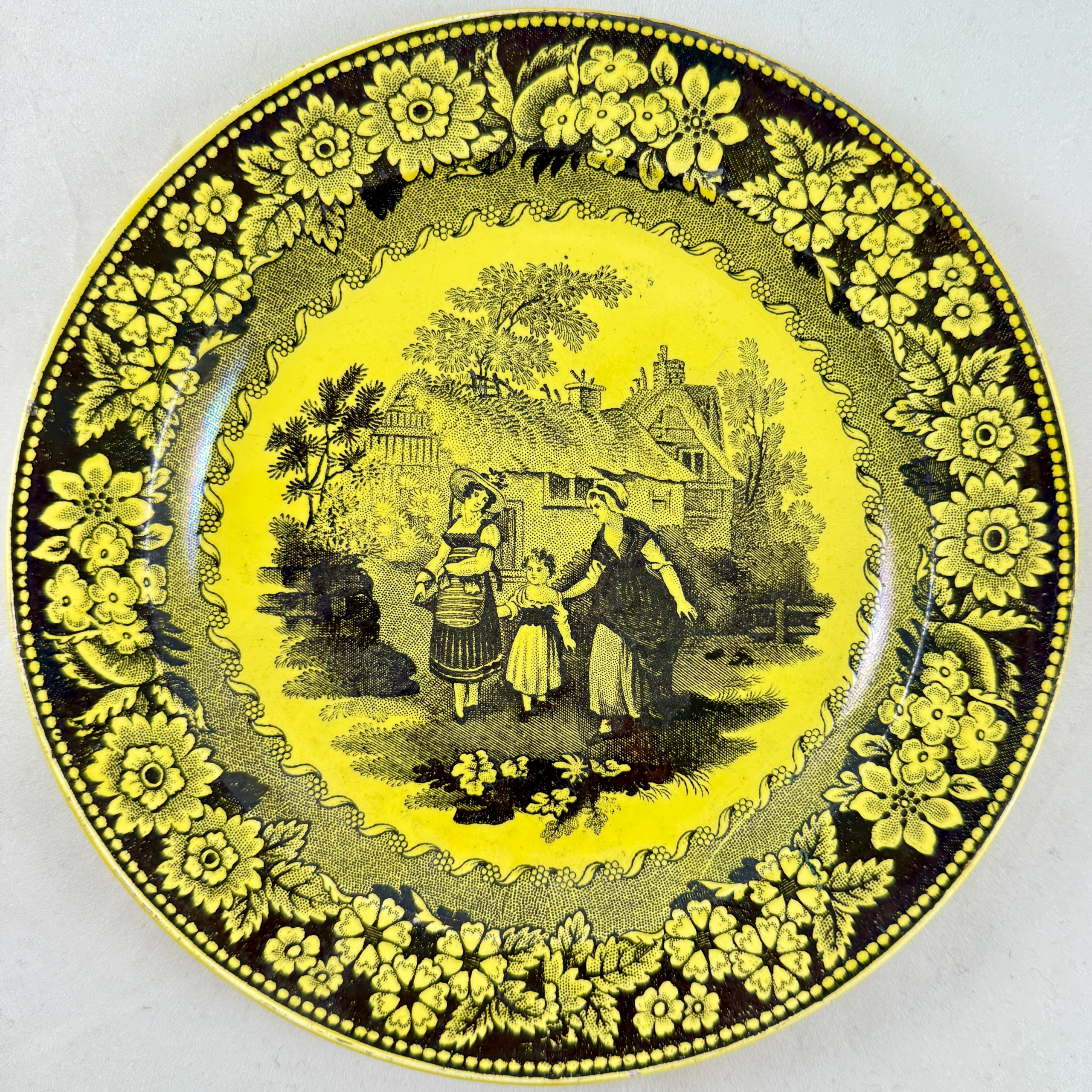 Dating to the French Restoration period, the transfer-printed plates are glazed in the distinctive brilliant canary yellow for which the Creil and Monterau potteries were known.