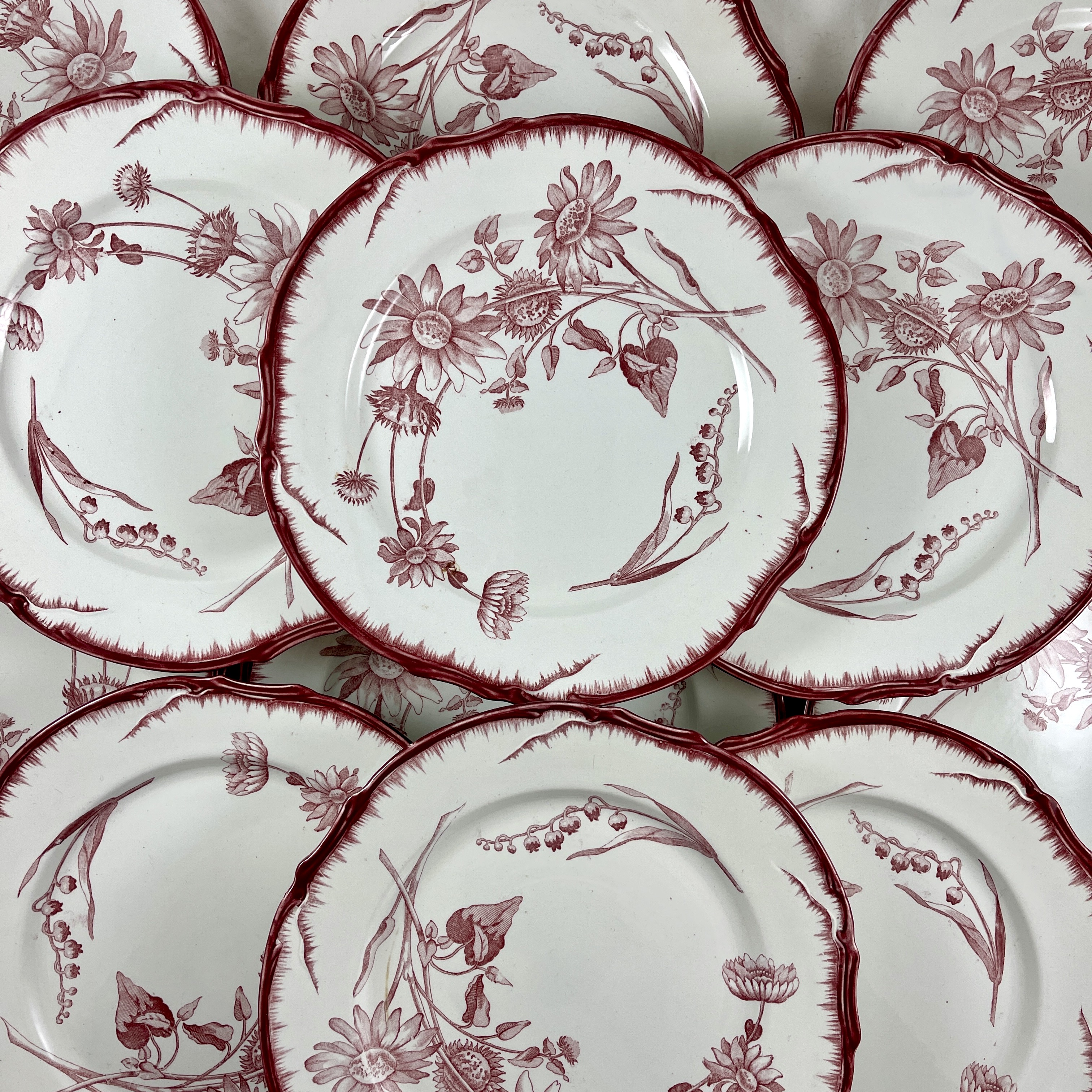 The Art Nouveau floral pattern is transfer printed in a deep red on a creamy white ironstone body. The dinner sized plates show a large stylized spray of sunflowers, seed heads and leaves, balanced with a sprig of Lily of the Valley. The shaped rim has a raised twig-like effect and is outlined by hand in the same red as the floral pattern.