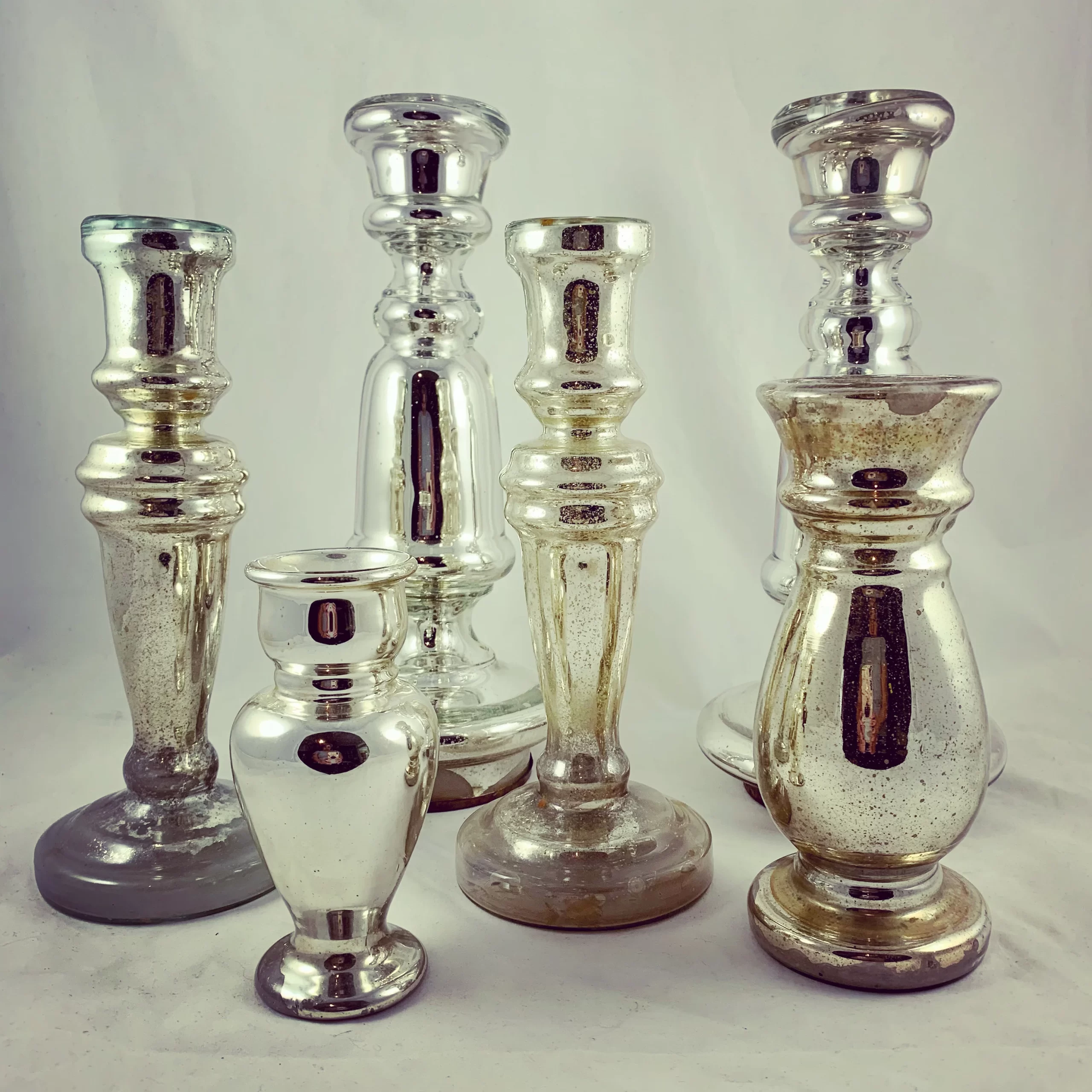 Silvered Mercury glass, an early example of art glass, was known as “poor man’s silver” in England in the mid 19th Century.