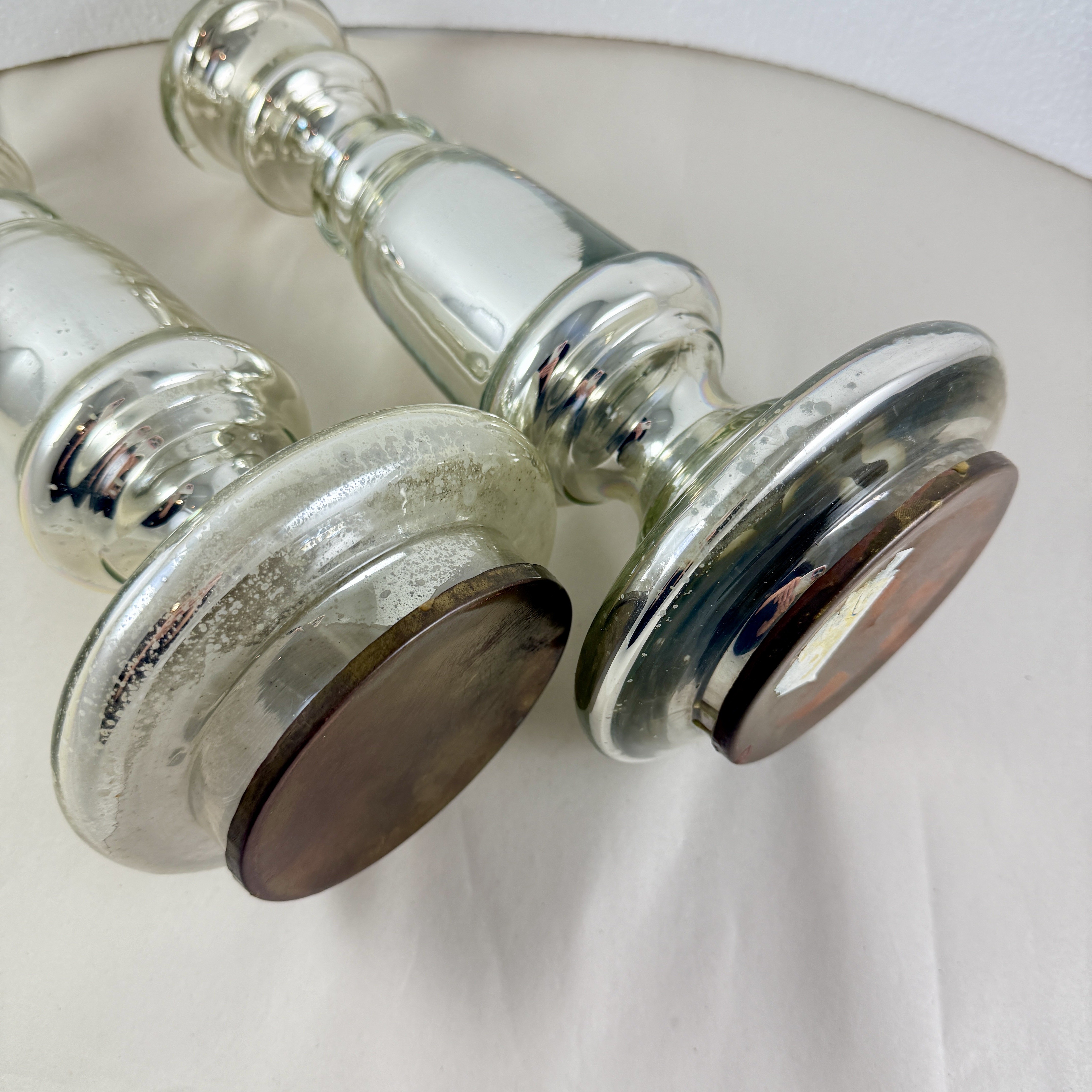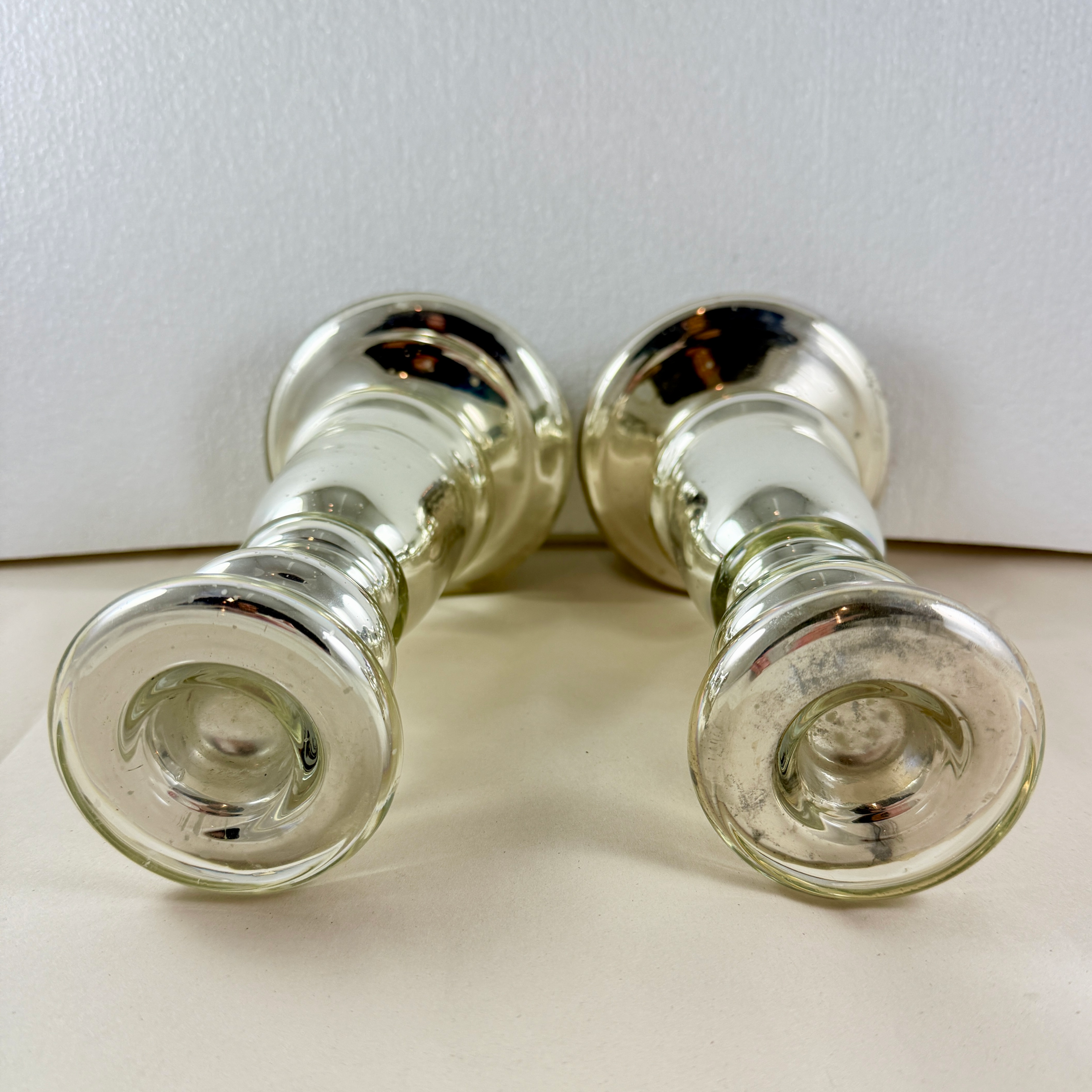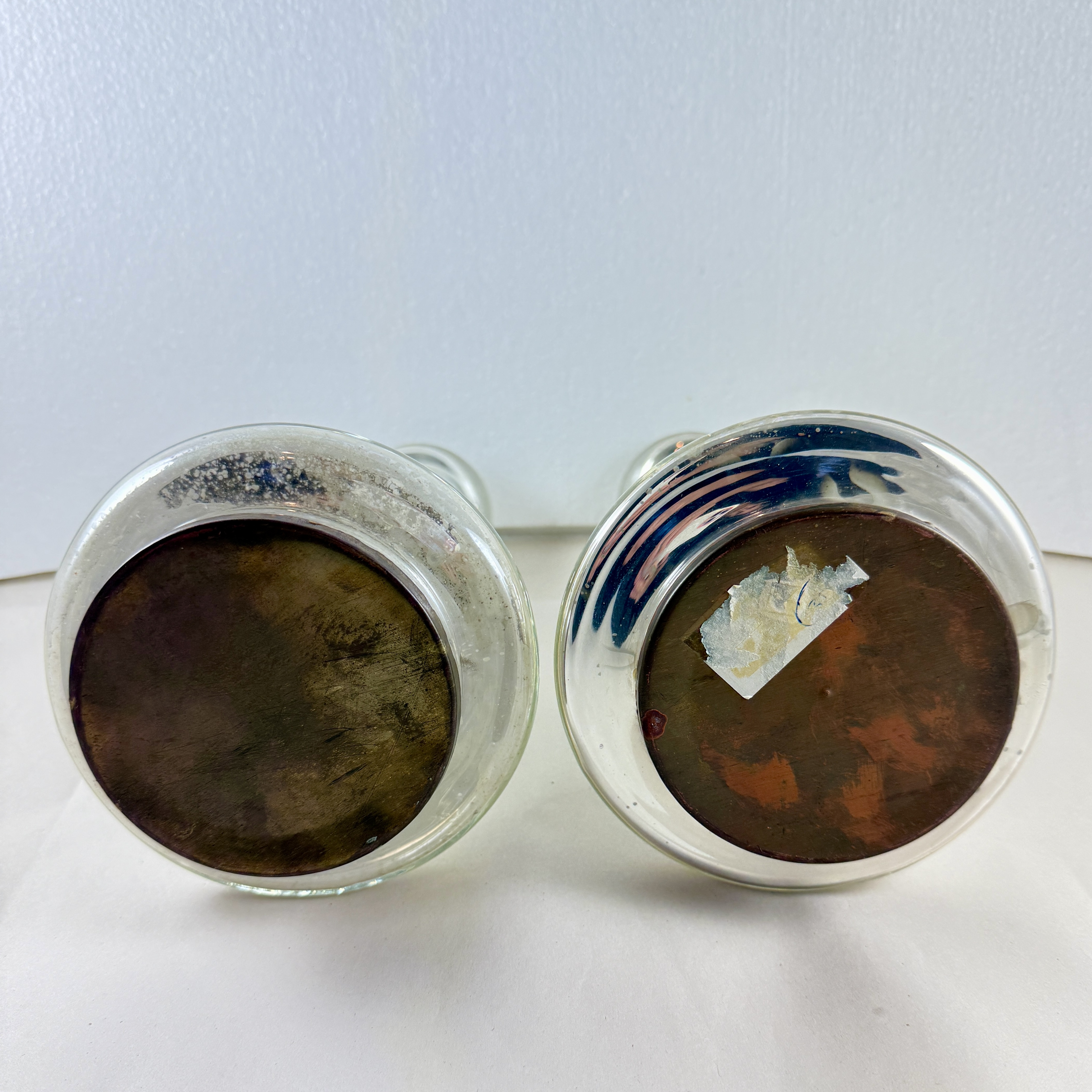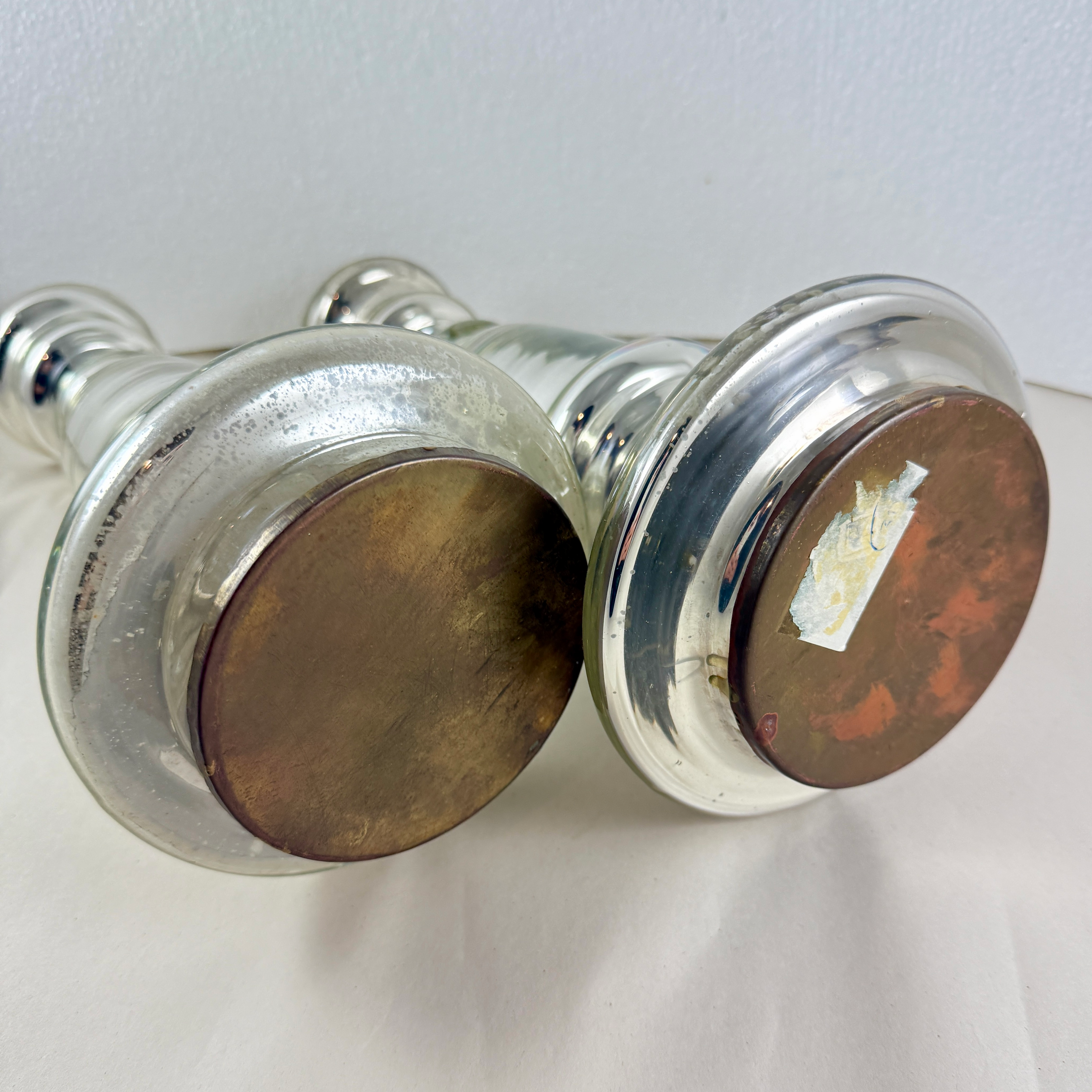 A substantial pair with copper discs applied to the base. Unusually large for Mercury glass candlesticks.