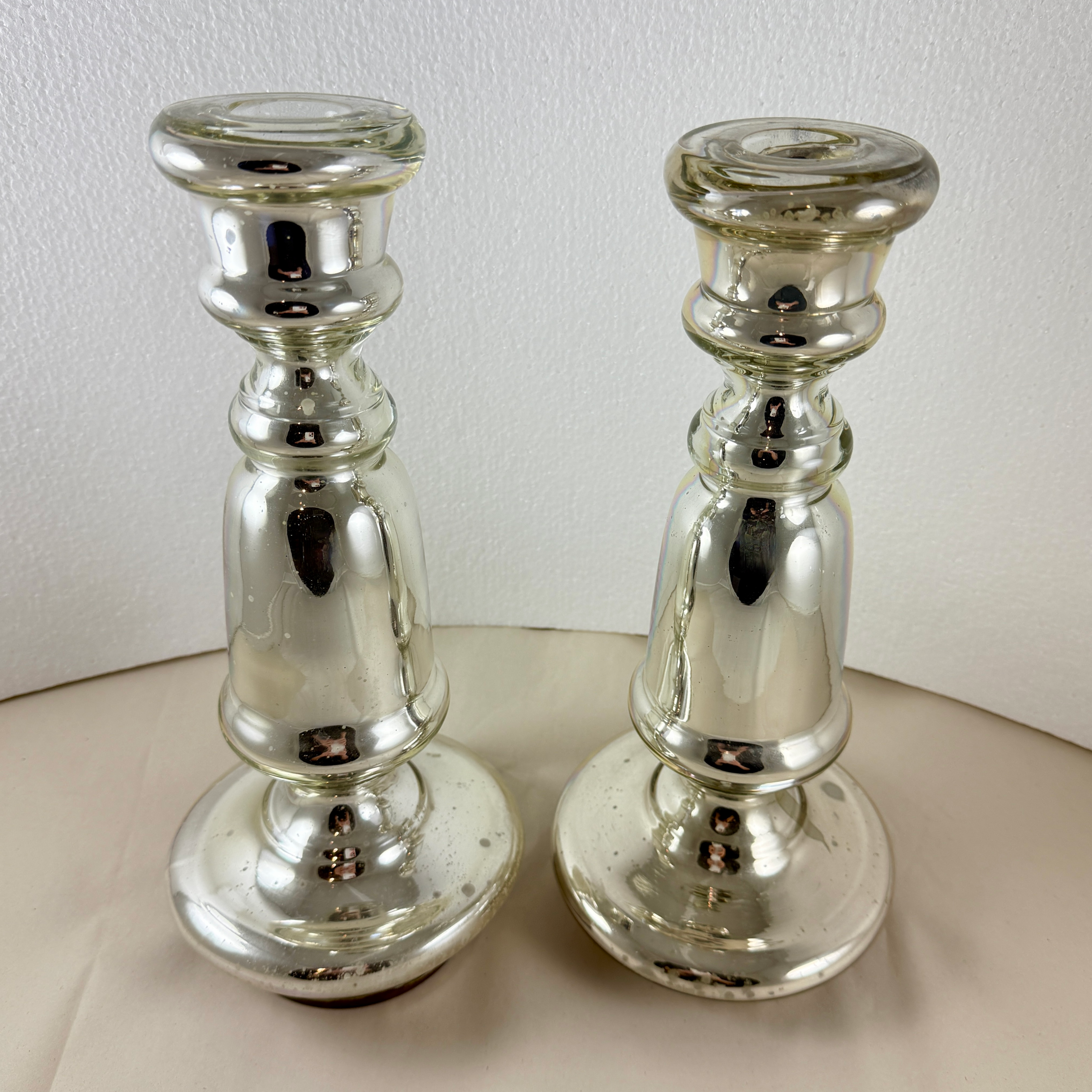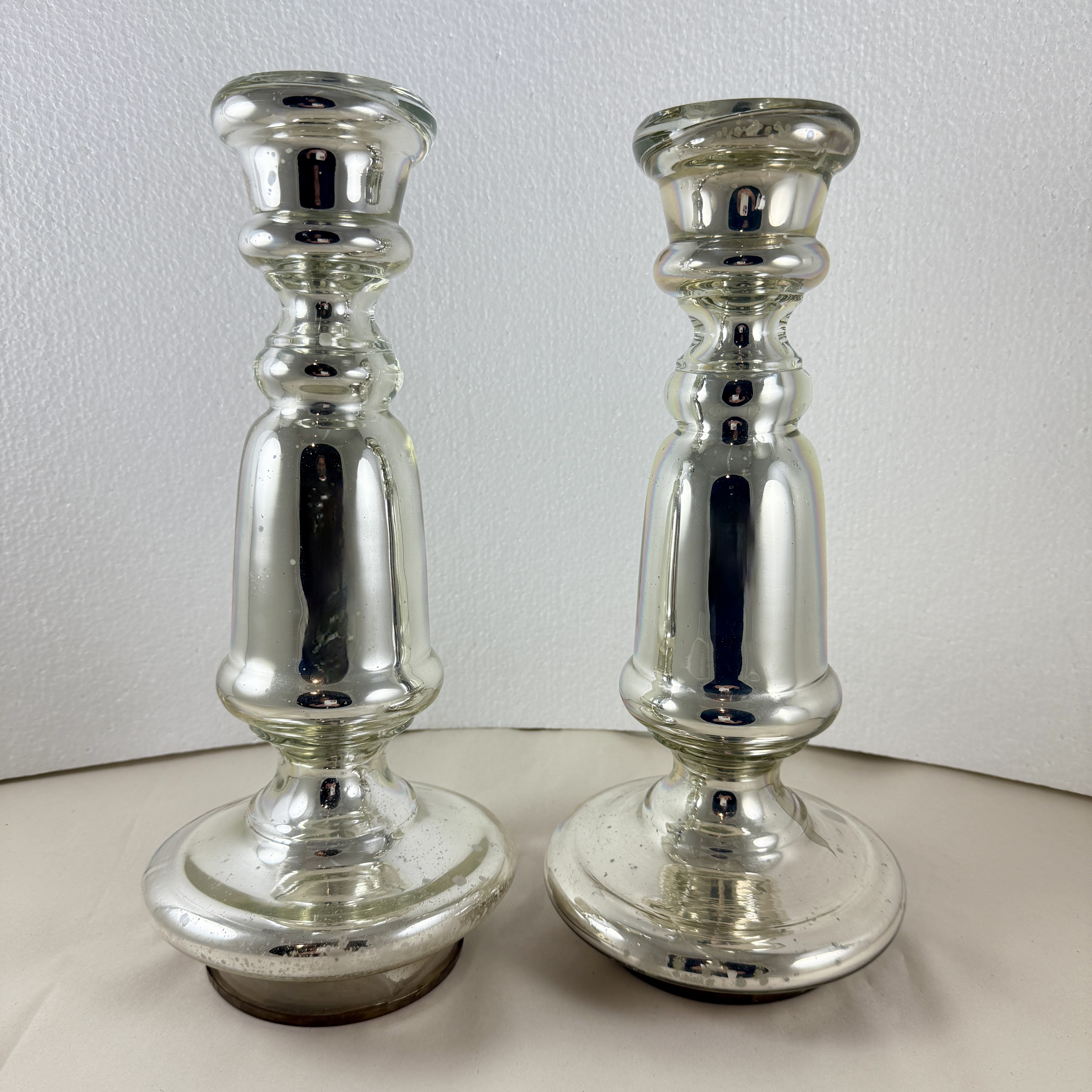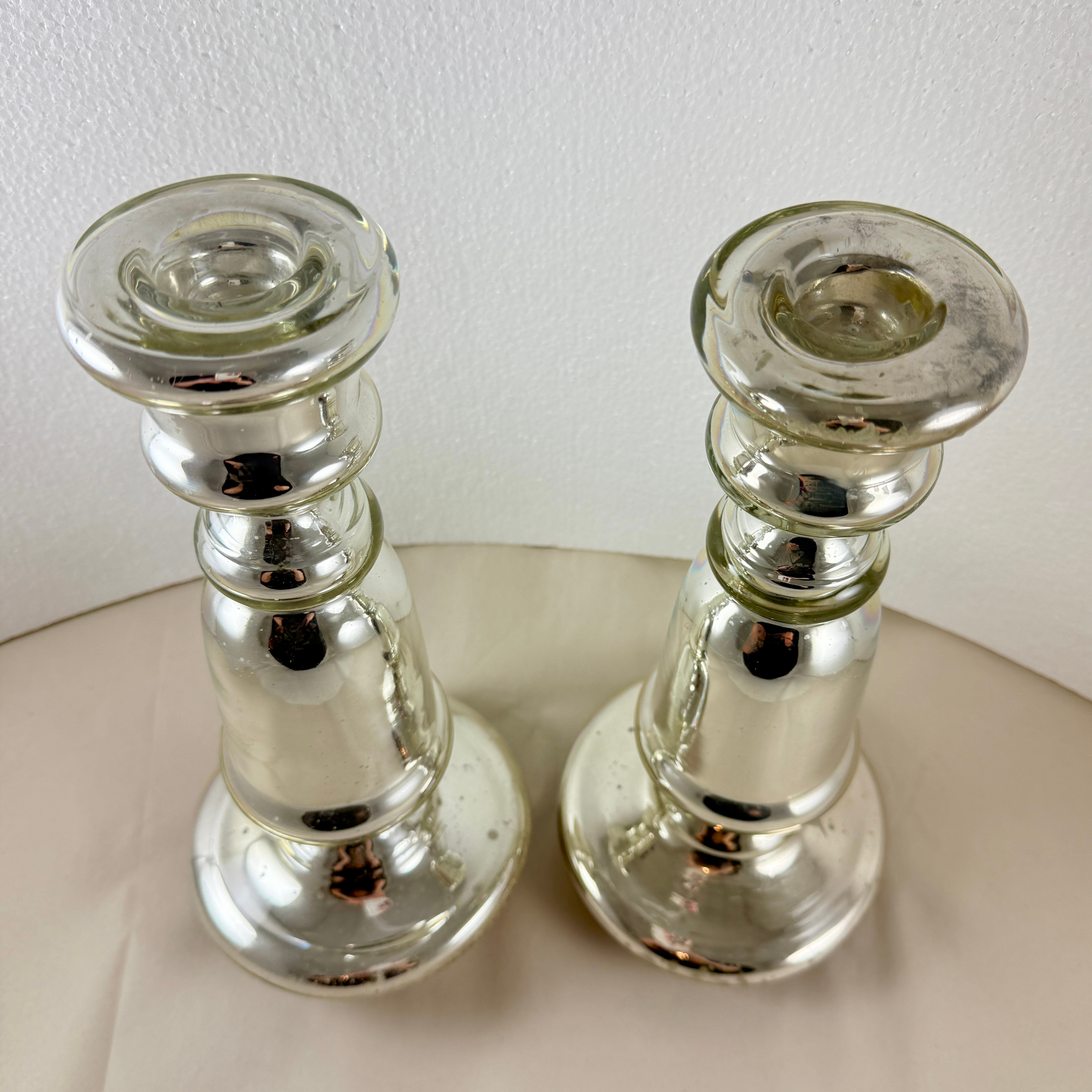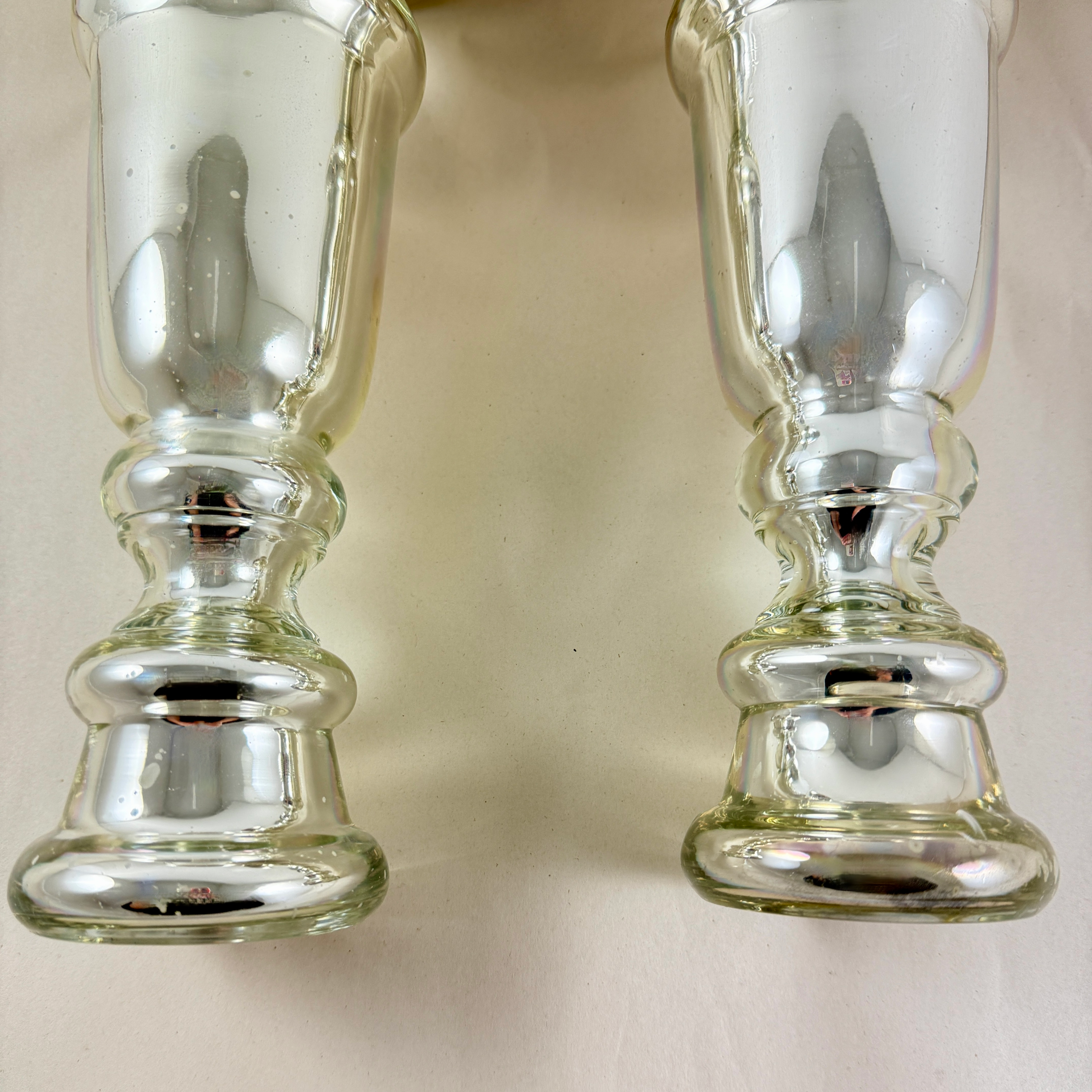 A substantial pair with copper discs applied to the base. Unusually large for Mercury glass candlesticks.