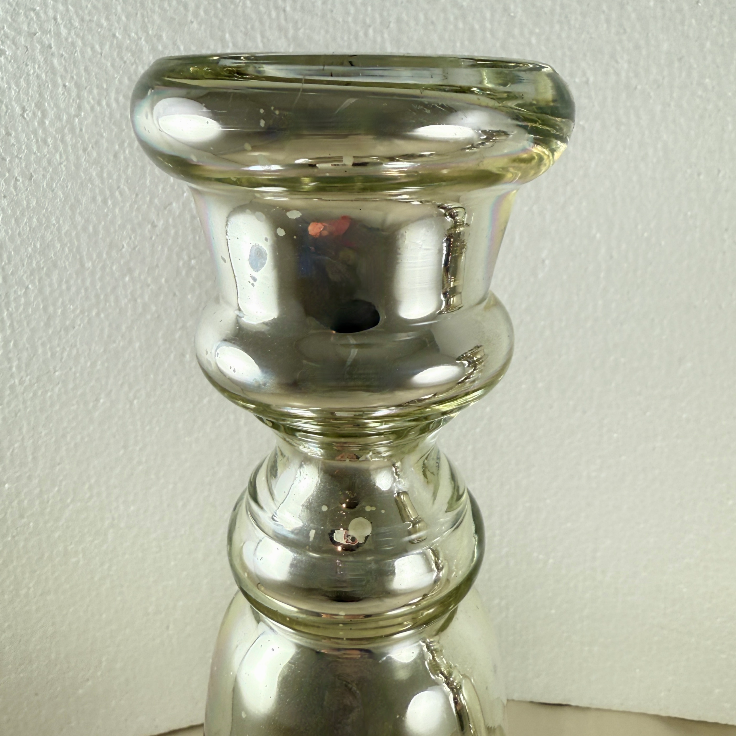 The intensity of the silvering varies as is the hand-made nature of Mercury glass.