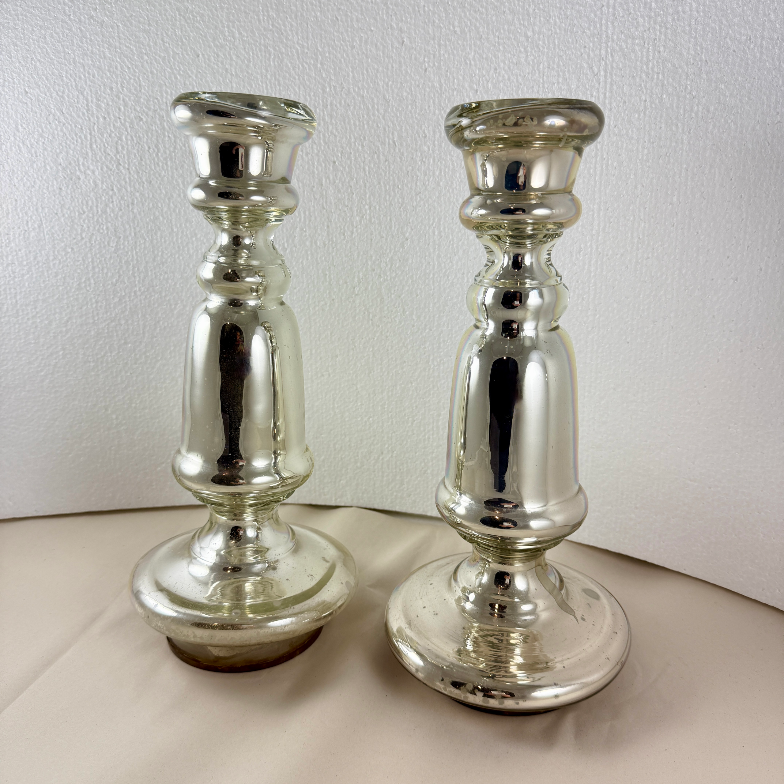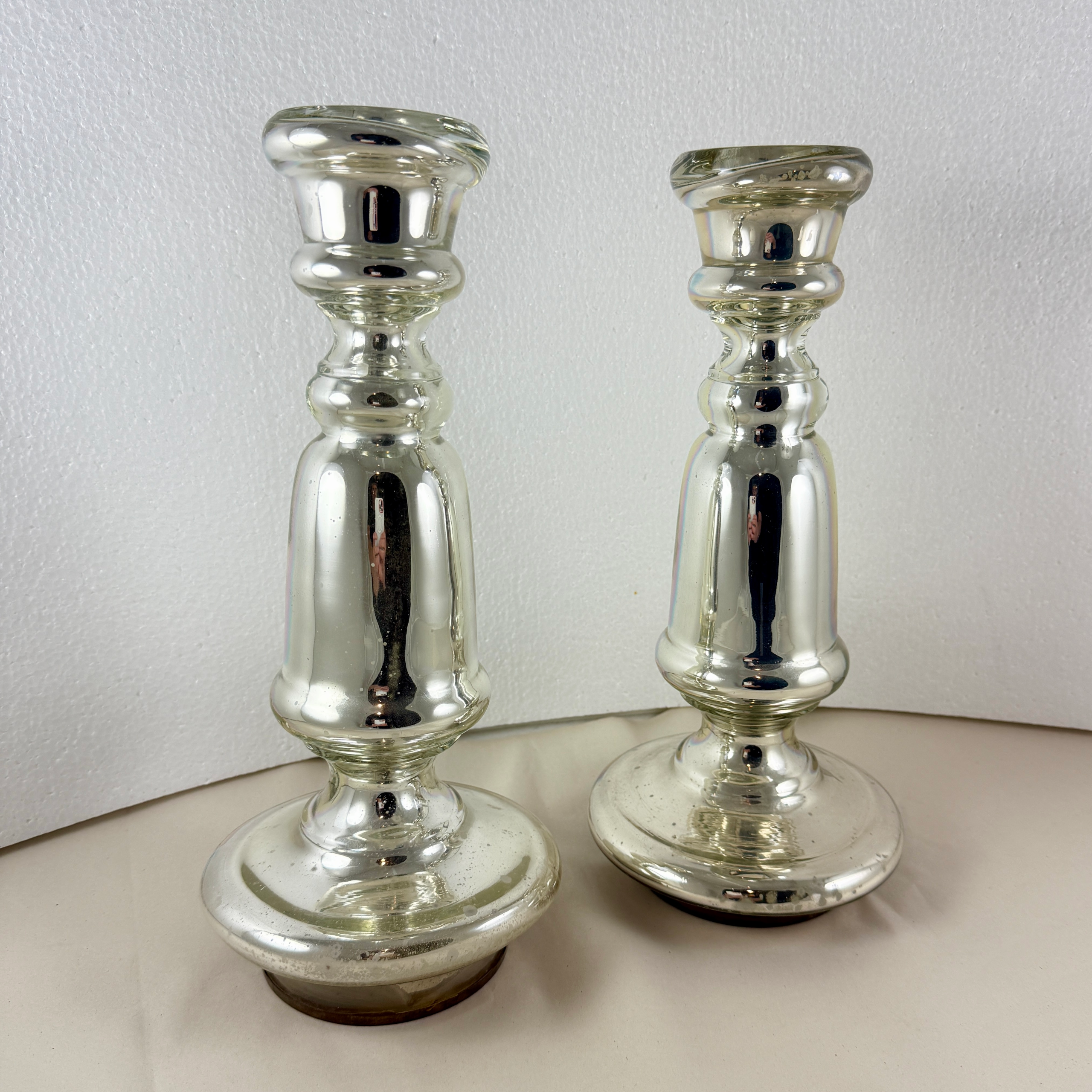 A pair of tall and very heavy Silvered Mercury Glass candlesticks, England, circa 1840-1855.
