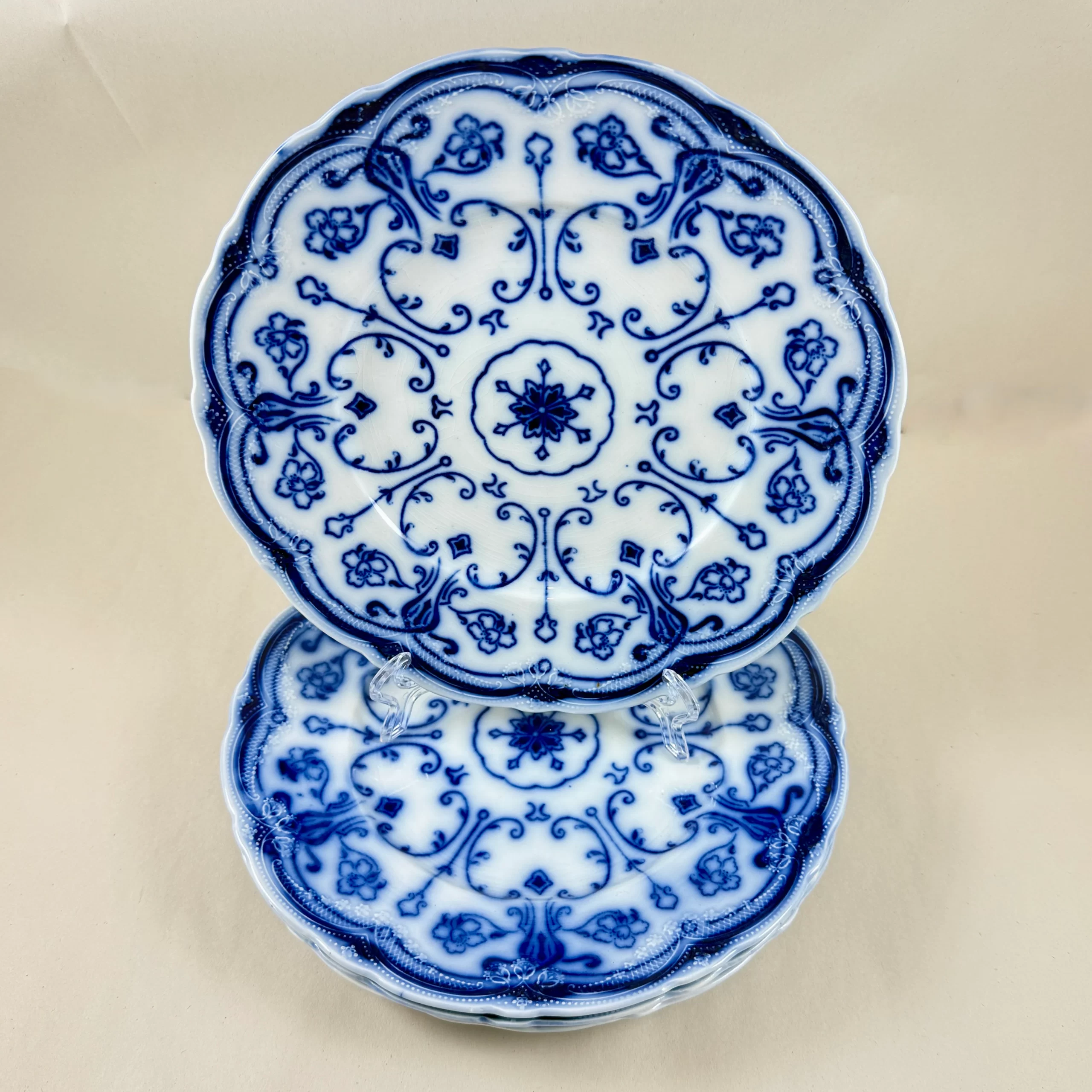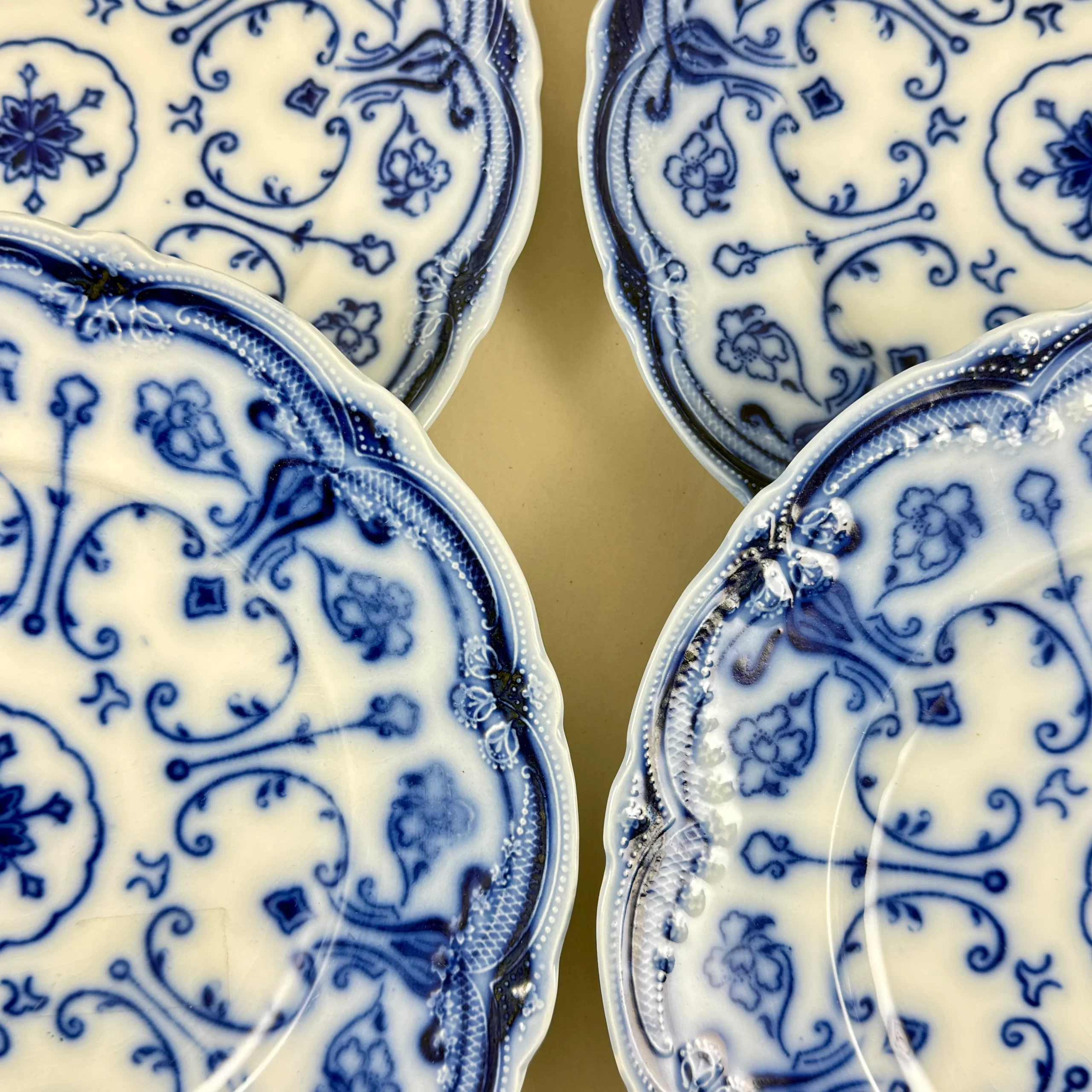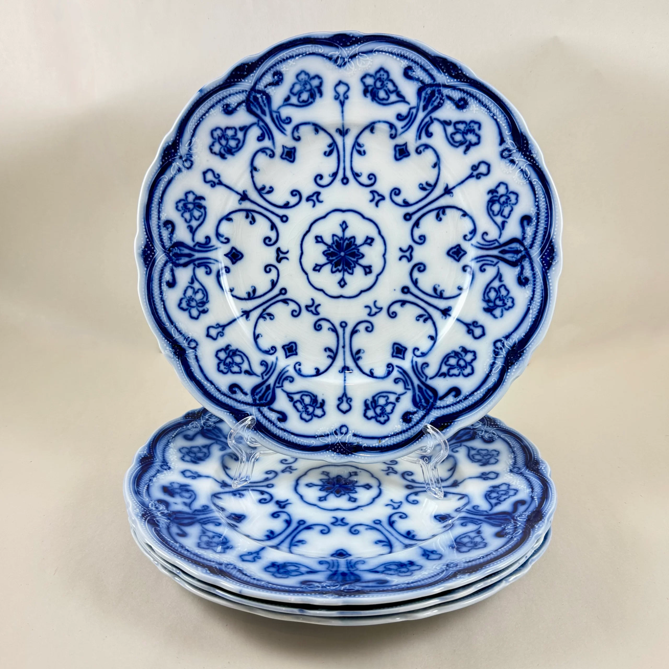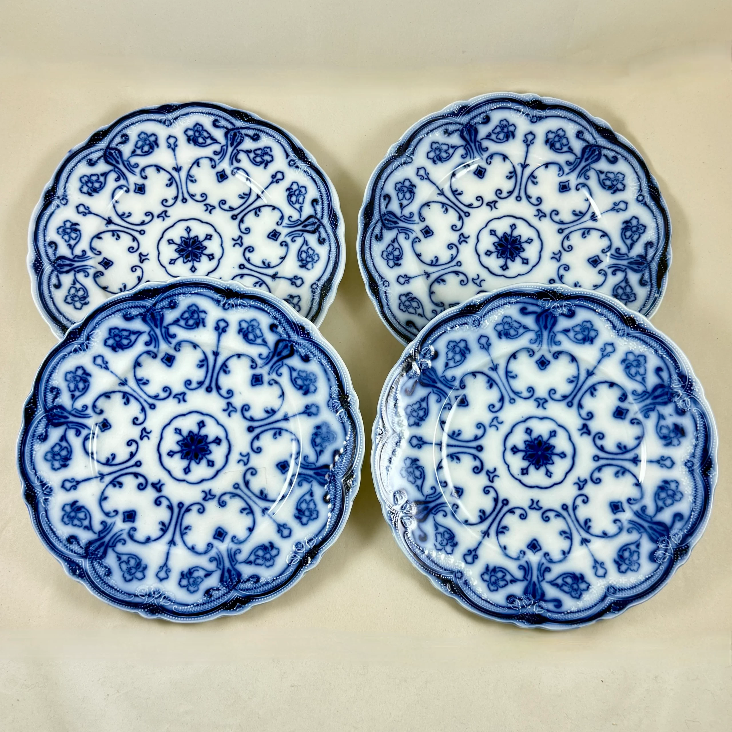 A set of four English Flow Blue Plates, in the Conway pattern, by New Wharf Pottery, circa late 1880s – early 1890s.