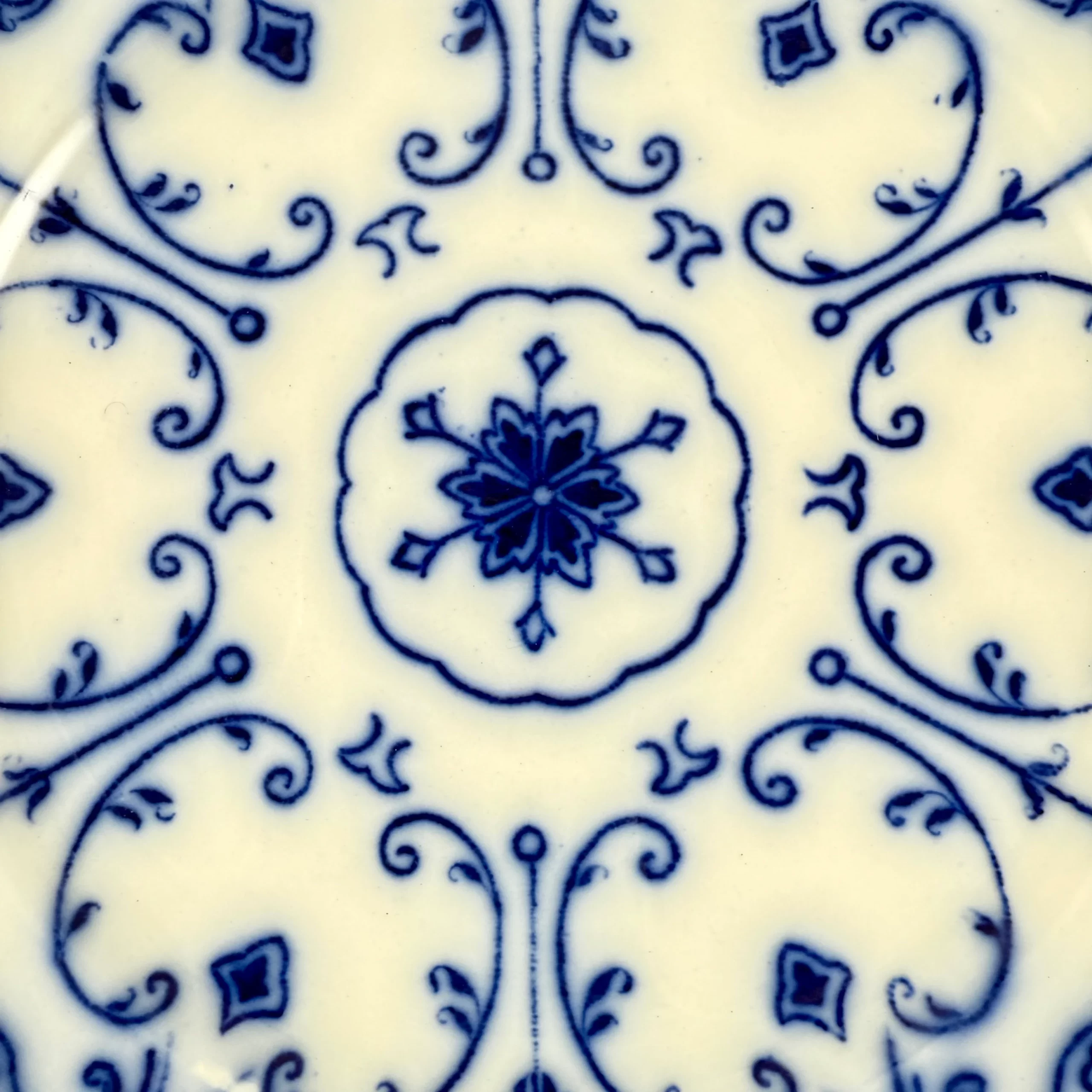 The Conway Pattern is made in Semi-Porcelain and shows a stylized floral, geometric pattern radiating out from a central medallion towards the outer rim.