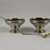 From Birmingham, England, an assembled pair of sterling silver open salts with spoons, circa 1825. The pedestal salts show a worked rim and are initialed. The spoons have gold-washed bowls. All four pieces are marked sterling with English hallmarks. A total weight of eight ounces.