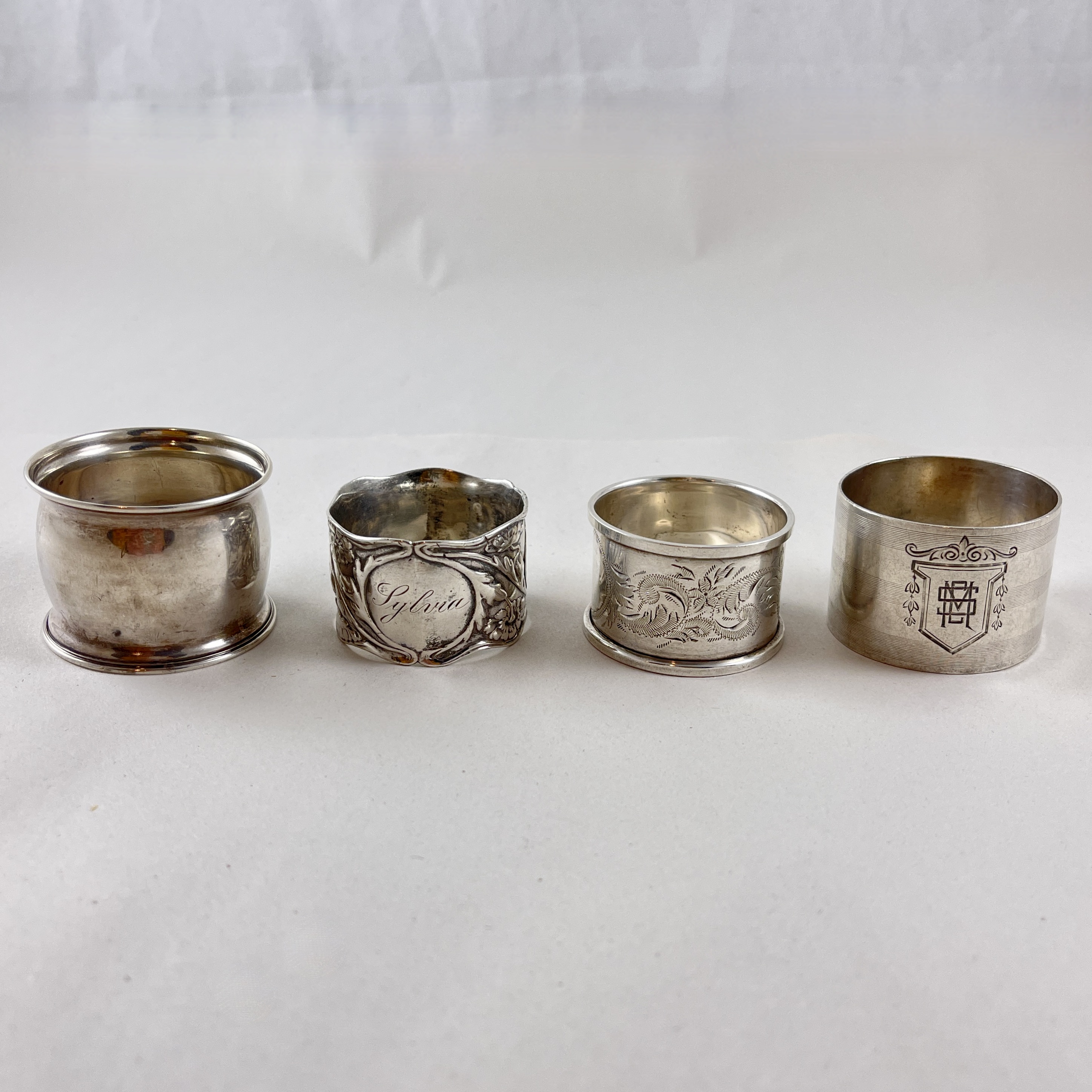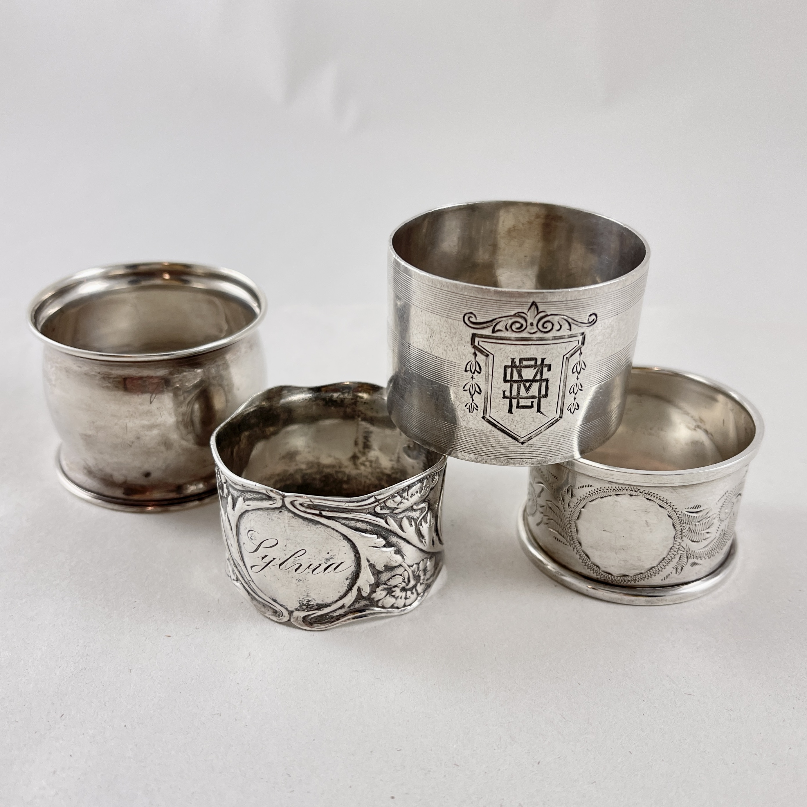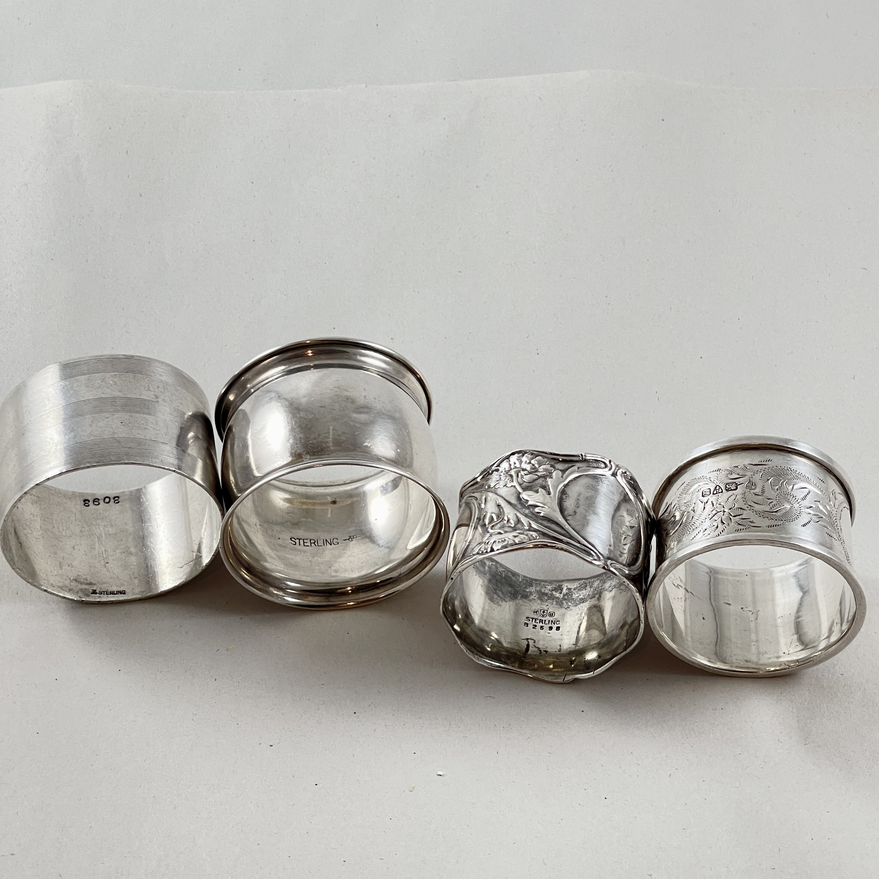An assembled set of four vintage wide band Sterling Silver napkin rings, various makers, circa 1920s – 1930s.