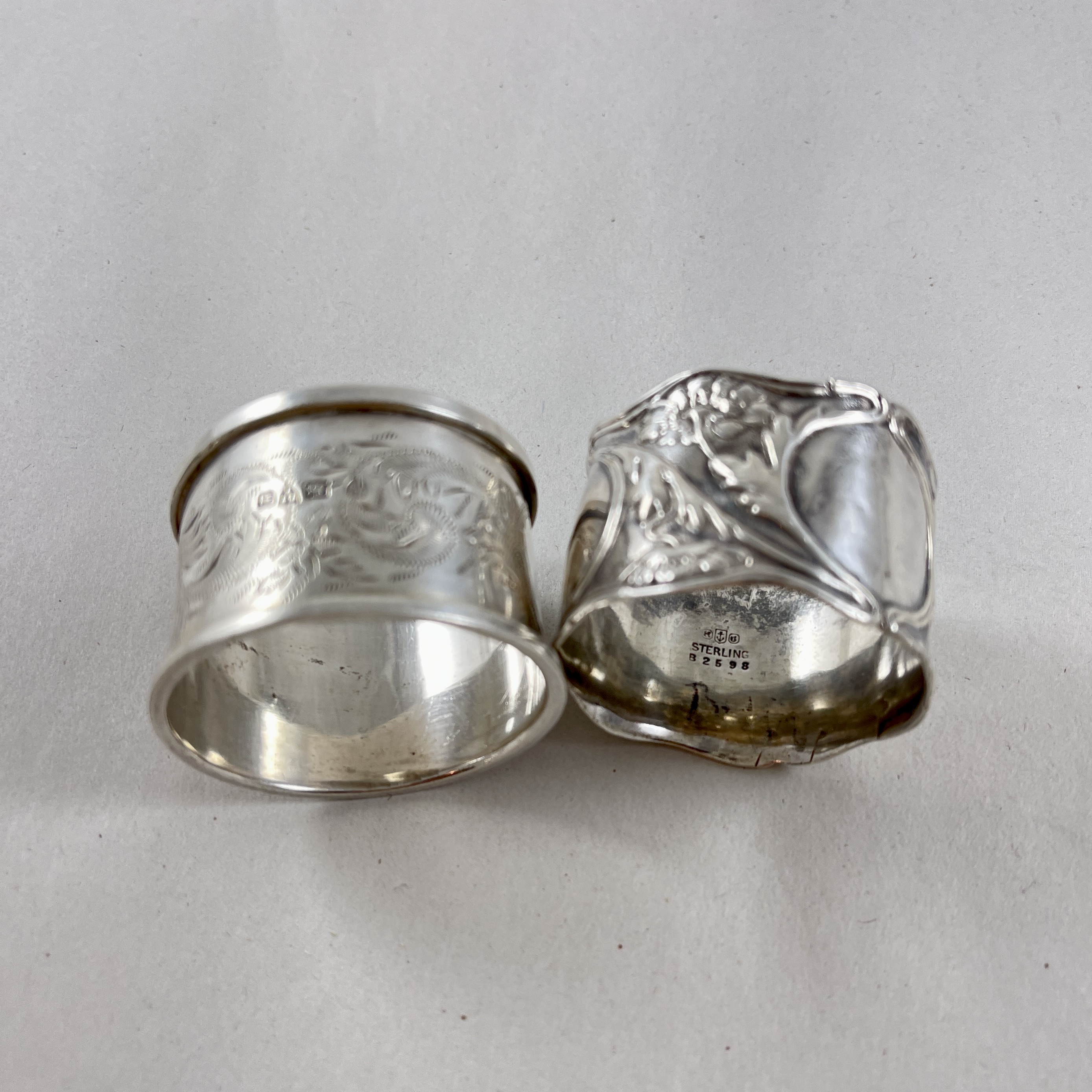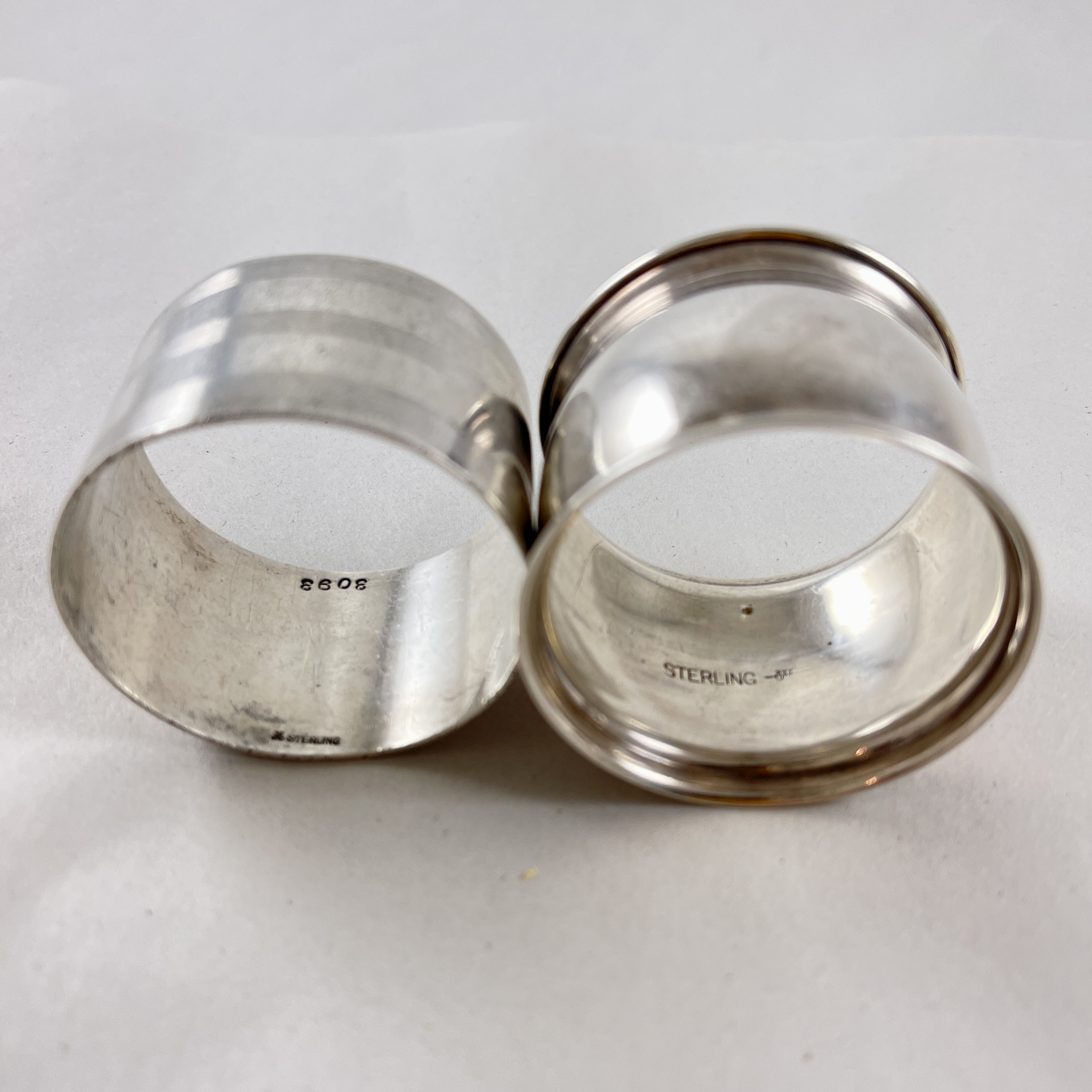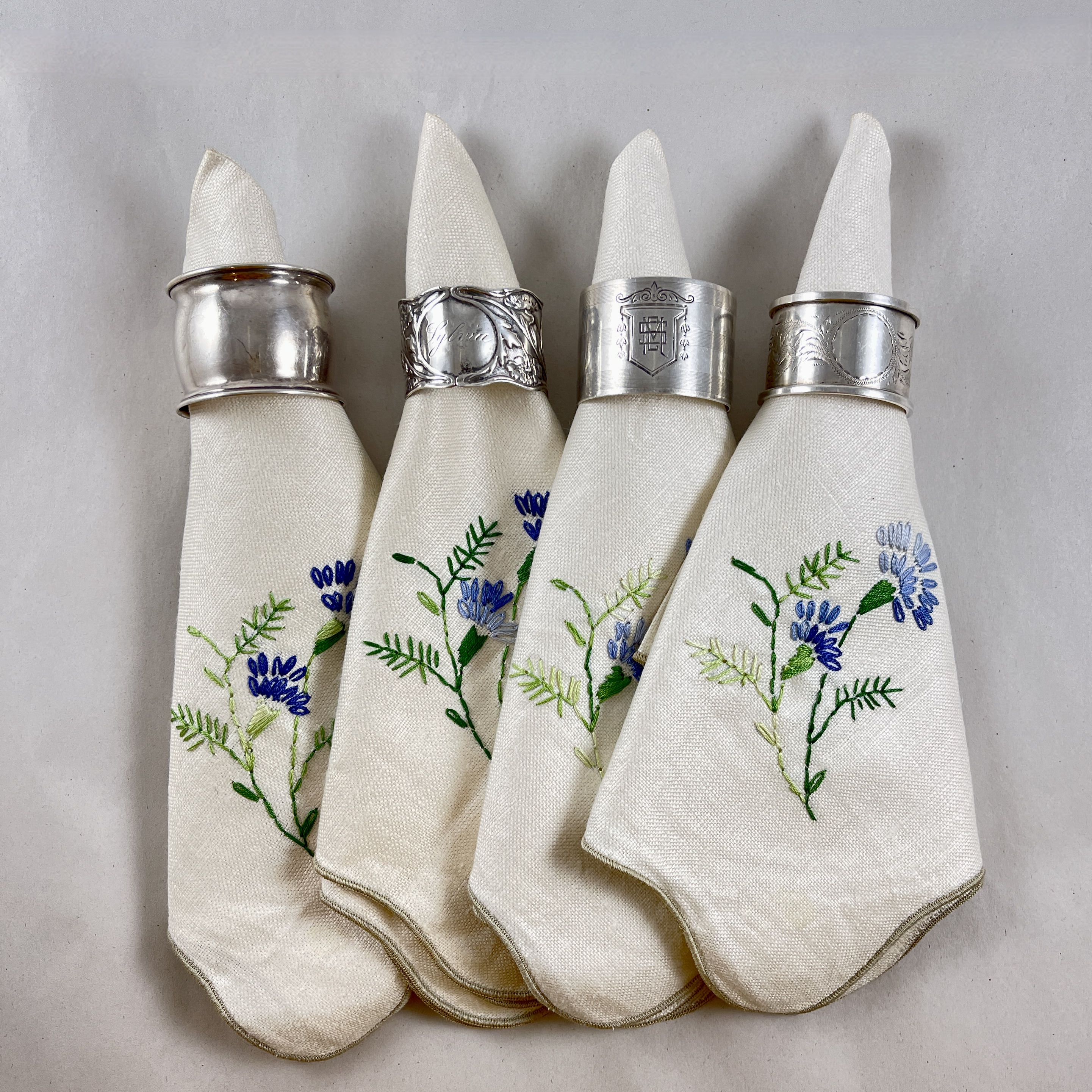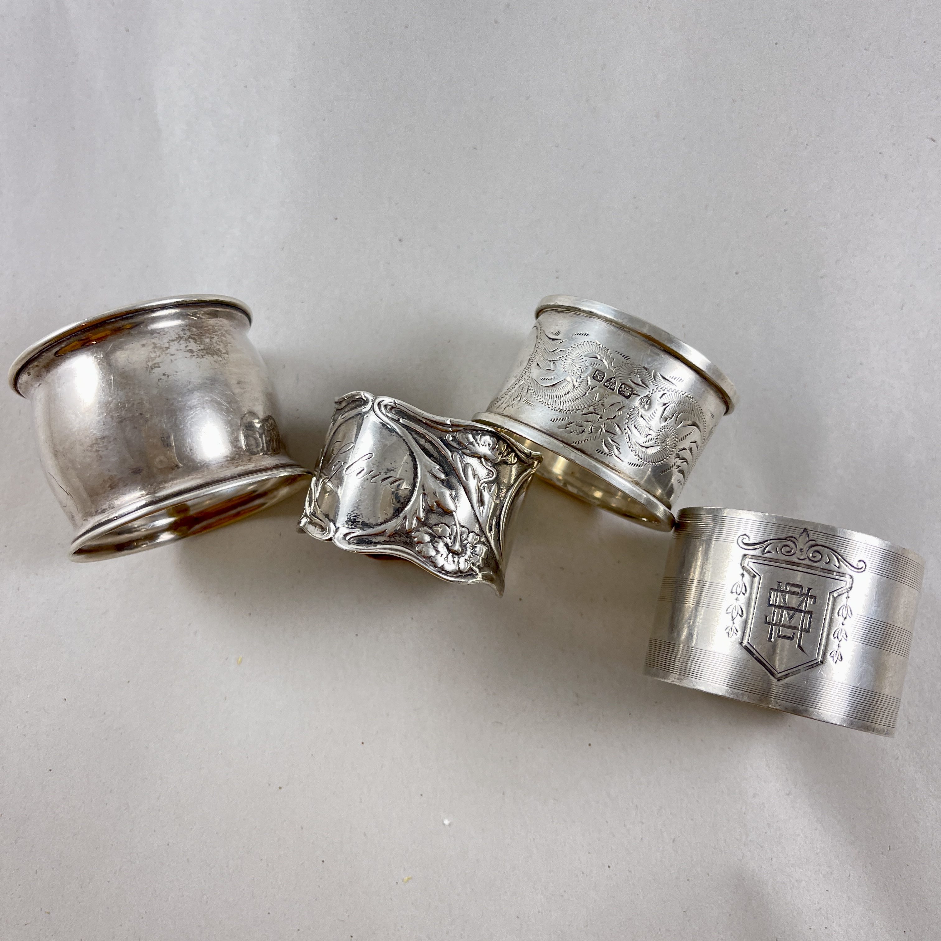 An assembled set of four vintage wide band Sterling Silver napkin rings, various makers, circa 1920s – 1930s.
