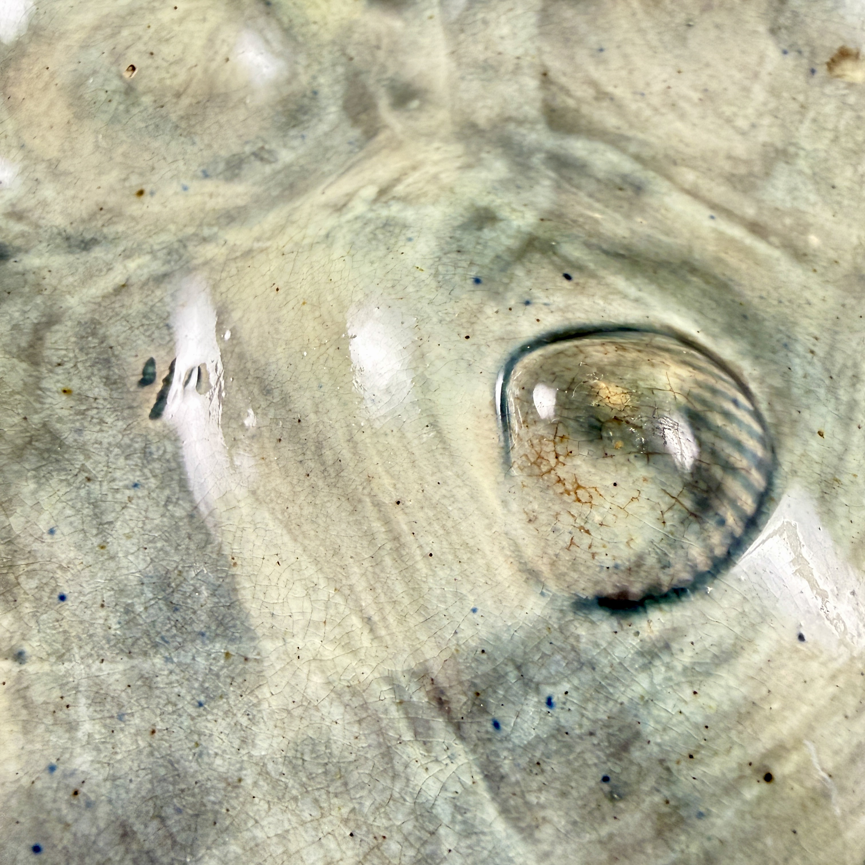 The verso is glazed in a watery ‘oyster gray’ with six raised scallop shell shaped feet.
