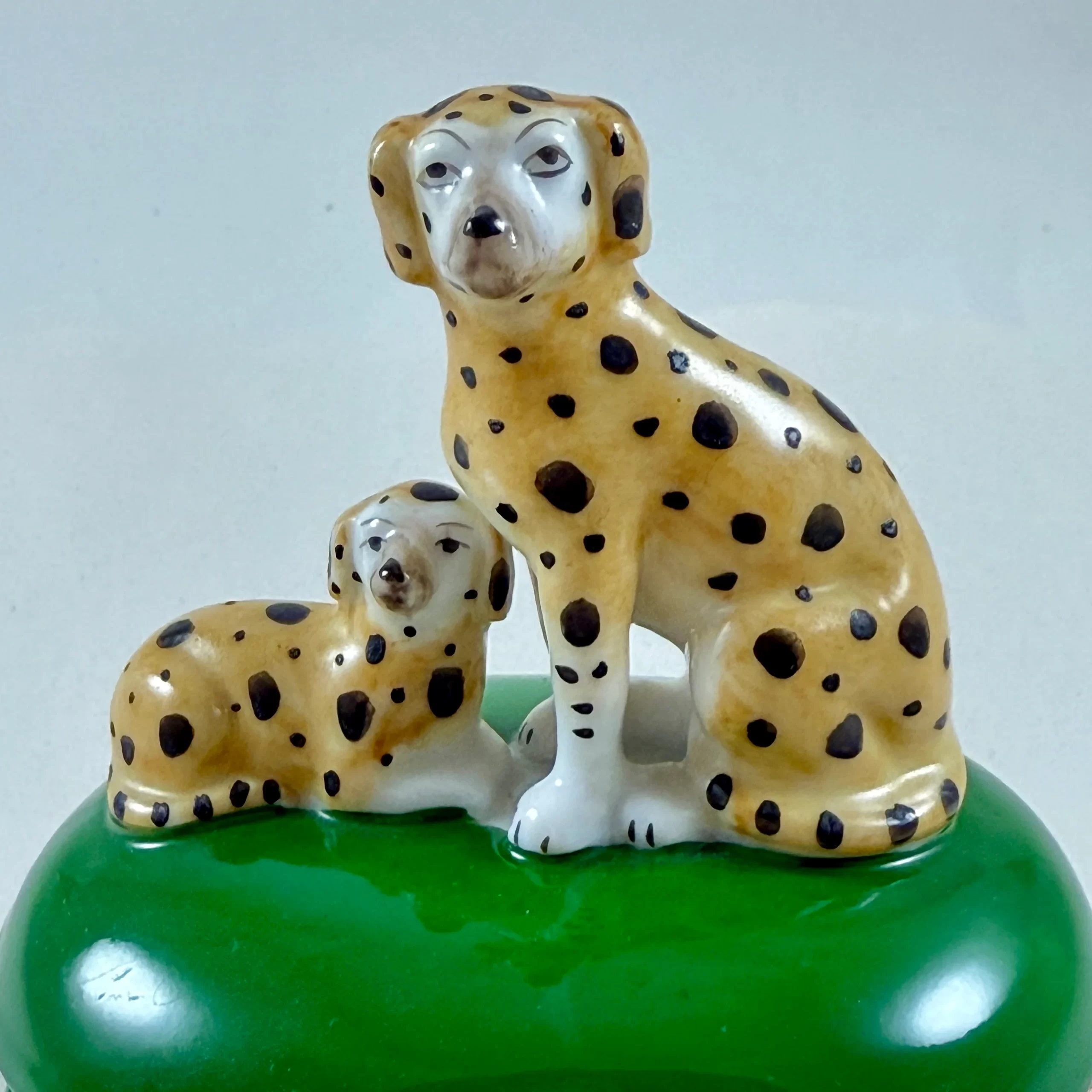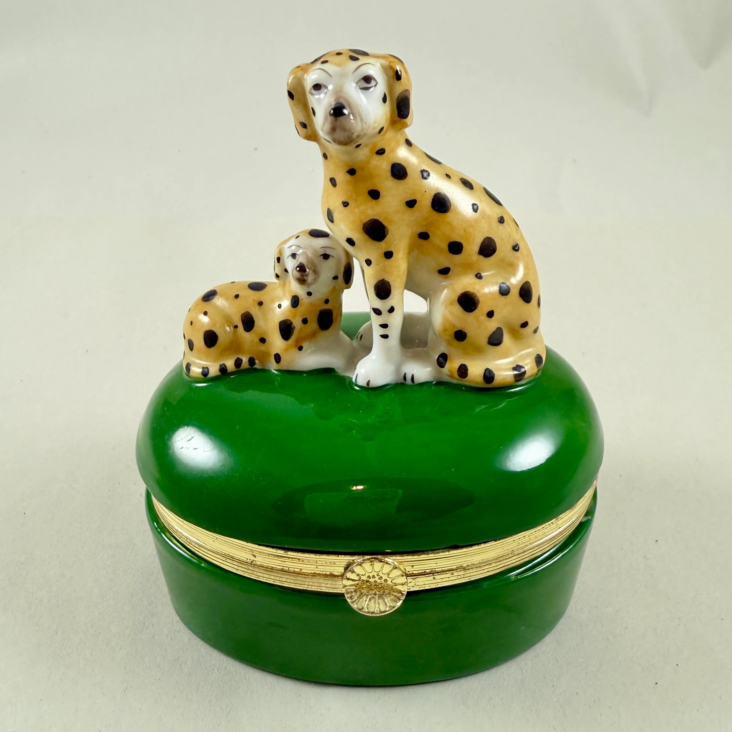 Two yellow and black spotted dogs sit atop an oval, green glazed lidded box with metal bracing.